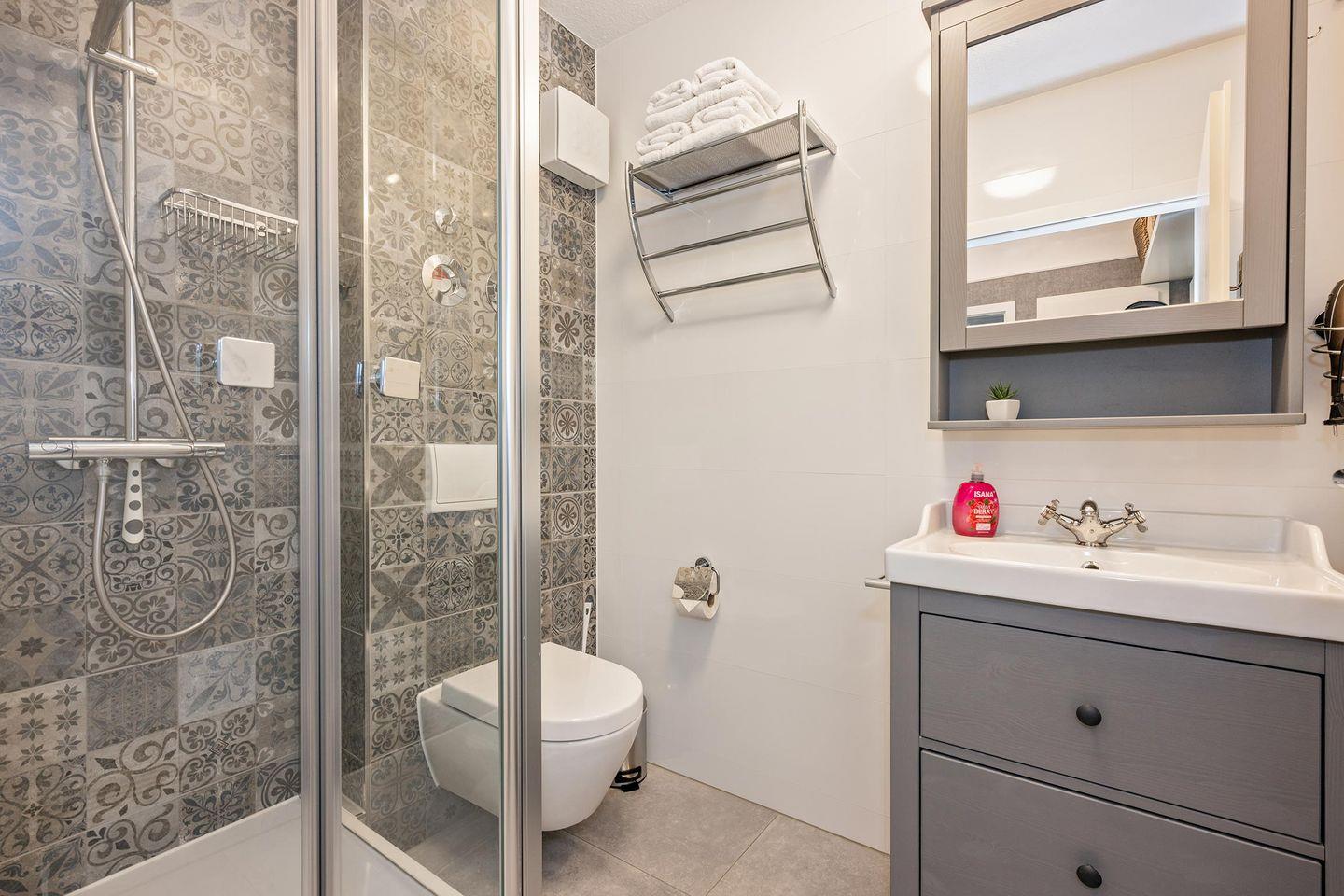 Das Badezimmer ist mit einer Dusche, Waschbecken, WC, Haartrockner und Kosmetikspiegel ausgestattet.