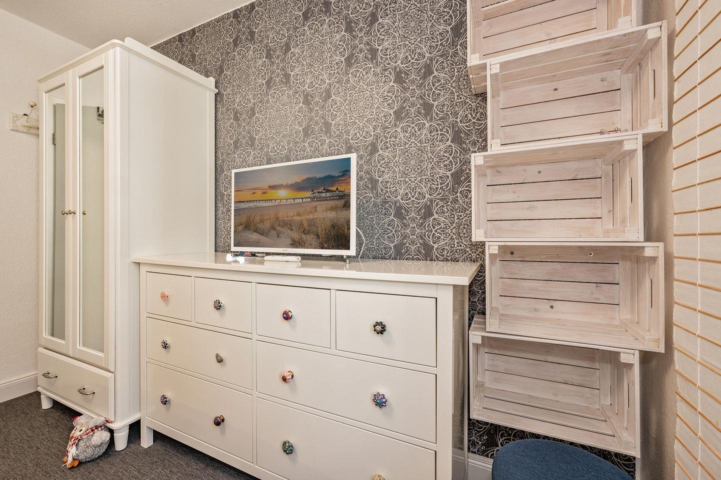 Im Schlafzimmer finden Sie neben einem gemütlichen Doppelbett, einem Kleiderschrank und Kommode, auch einen eigenen Fernseher. So ist auch am Abend für Unterhaltung gesorgt.