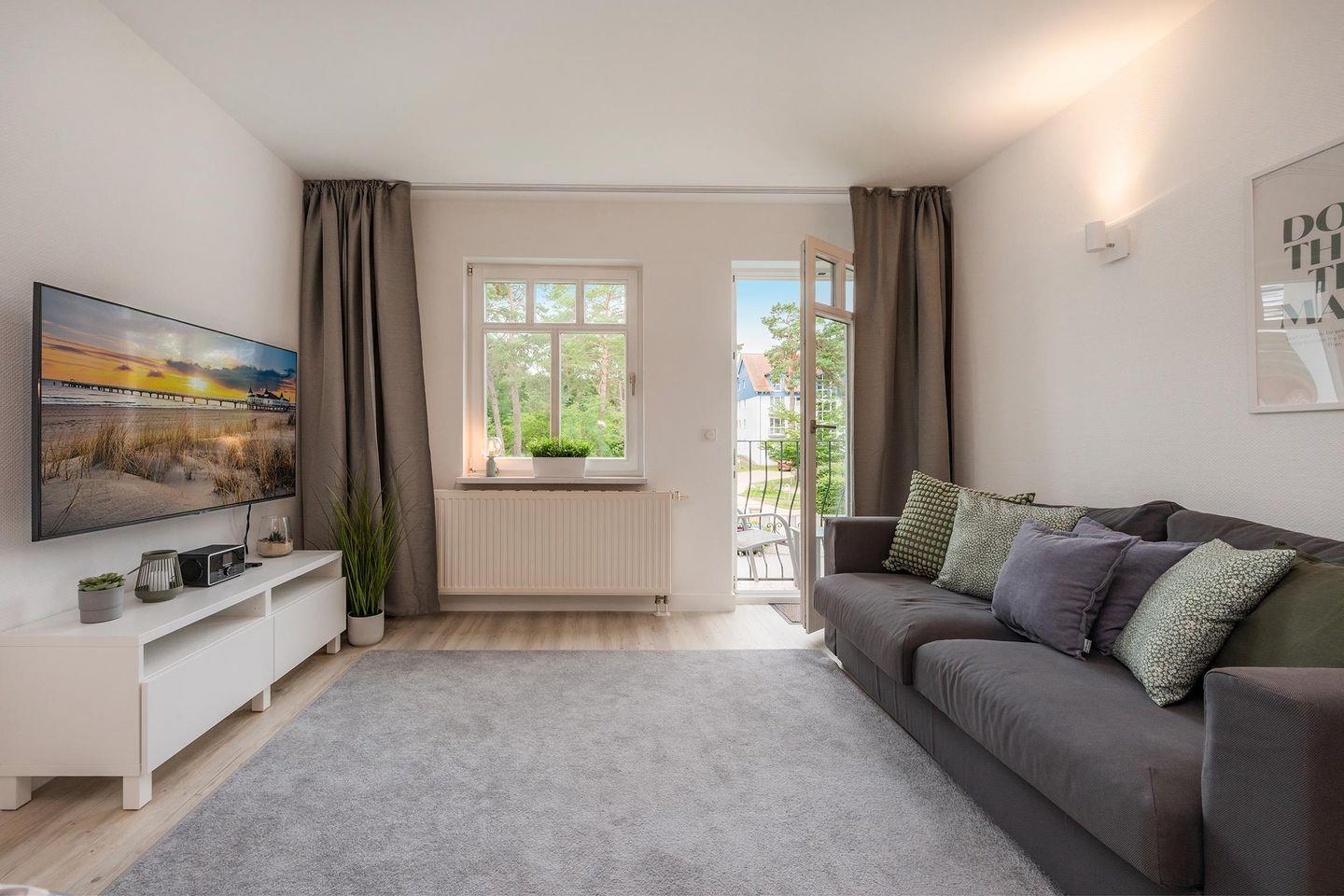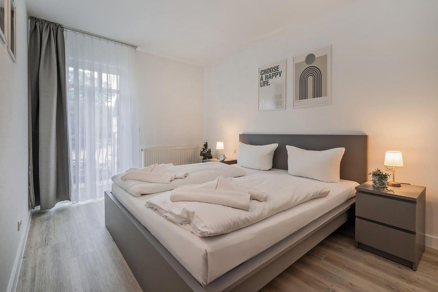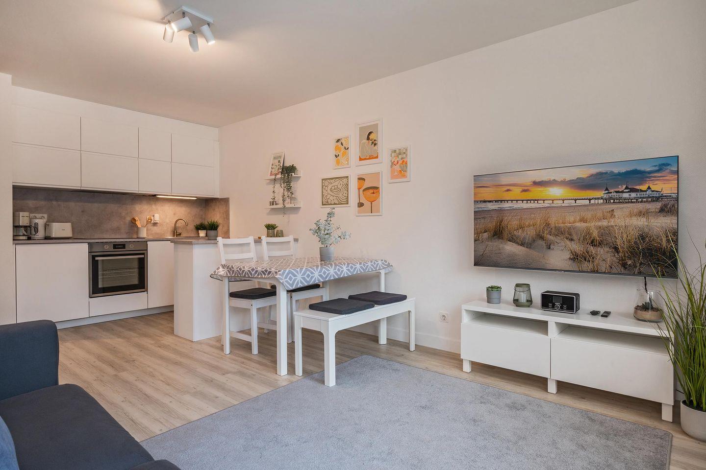 Die 44 Quadratmeter große Wohnung besticht durch eine moderne Einrichtung. Dank vieler kleiner Details wurde eine wohnliche Atmosphäre erschaffen. Das Wohnzimmer ist mit einer Schlafcouch, wo eine dritte Person ihren Schlafplatz findet, und einem großen Flat-TV eingerichtet. Von hier aus haben Sie Zugang zum anliegenden südwestlich ausgerichteten Balkon. Hier können Sie Ihren nachmittäglichen Kaffee bei herrlichstem Sonnenscheinwetter genießen. Die Küche ist offen zum Wohnzimmer gestaltet und mit wichtigen Küchengeräten wie einem Induktionsherd, Backofen, Spülmaschine, Filterkaffeemaschine, Toaster und Wasserkocher eingerichtet. In geselliger Runde lässt es sich wunderbar an den großen Esstisch mit Bestuhlung und Sitzbank dinieren. Neben einem großen Bad, ausgestattet mit Badewanne, Dusche, WC und Waschbecken, werden Sie noch ein weiteres Gäste-WC in der Wohnung vorfinden. Das Schlafzimmer ist mit einem großzügigen Doppelbett (1,80 x 2,00 Meter Liegefläche) und einem Kleiderschrank eingerichtet, welcher ausreichend Platz für Ihre Garderobe bietet.
