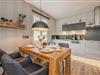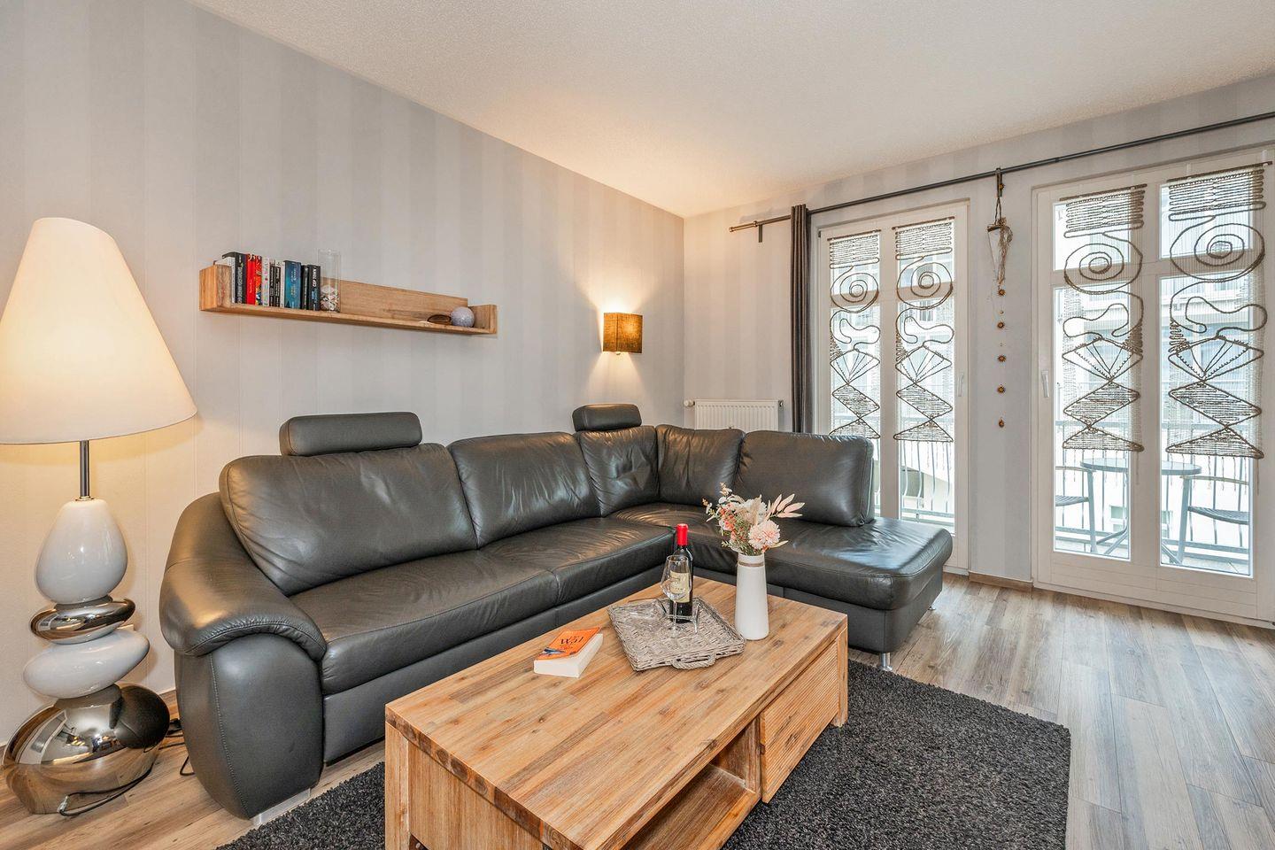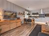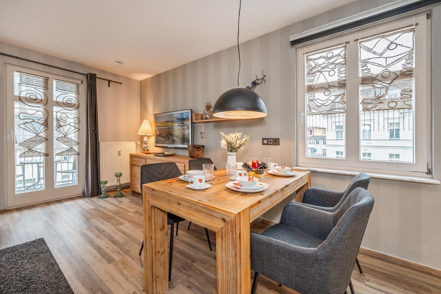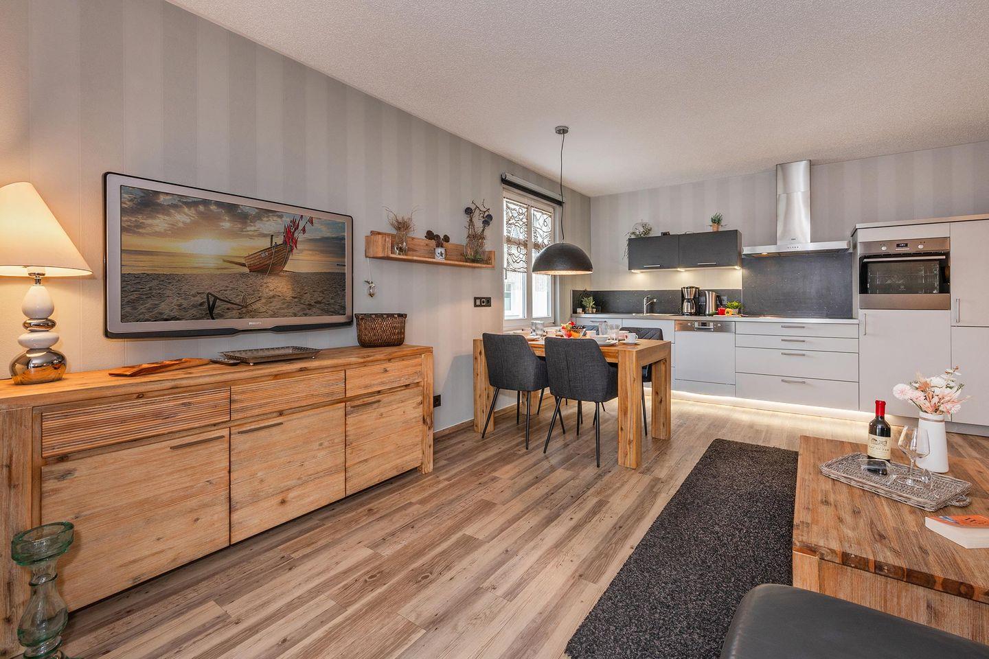 Die gut ausgestattete Küchenzeile verfügt über ein Ceran-Kochfeld, einen Backofen, Geschirrspüler und einen Kühlschrank mit Gefrierfach. Diese offene Küche geht in den Wohnbereich über, der für eine angenehme Urlaubsatmosphäre sorgt. Der separate Essbereich bietet Platz für gemeinsame Mahlzeiten. Der Wohnbereich ist stilvoll eingerichtet und wurde mit viel Liebe zum Detail gestaltet. Ein TV-Gerät sorgt für Unterhaltung, während der möblierte Balkon der ideale Ort ist, um den Tag ausklingen zu lassen oder die frische Meeresbrise zu genießen.