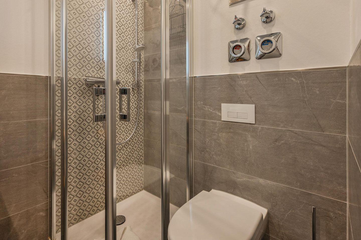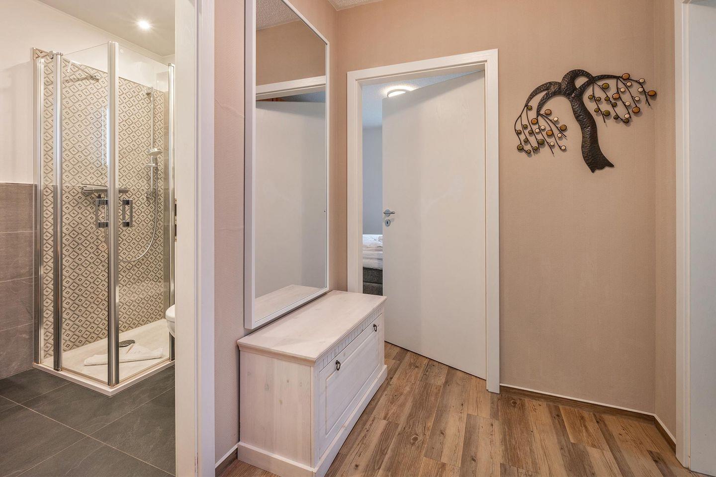 Das Schlafzimmer ist mit einem komfortablen Doppelbett (200 cm x 180 cm) ausgestattet und bietet ausreichend Platz für längere Aufenthalte, dank eines großen Kleiderschranks. Das moderne Badezimmer verfügt über eine bodentiefe Dusche, ein Waschbecken und ein WC, sodass Sie nach einem erholsamen Tag am Strand in Ruhe entspannen können.