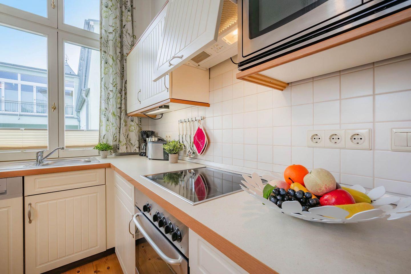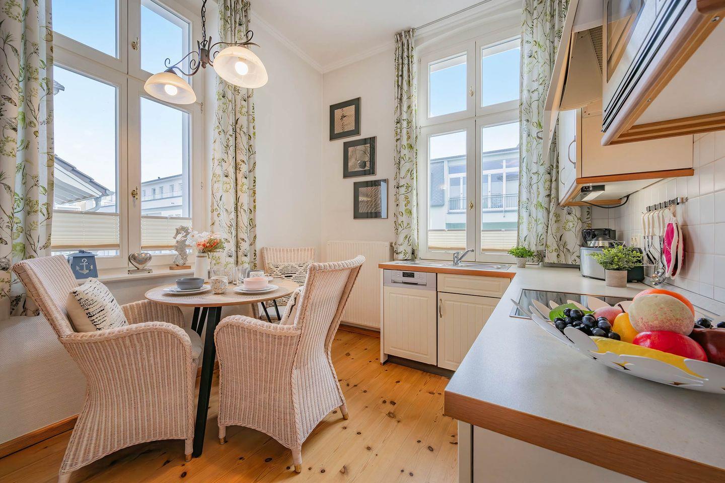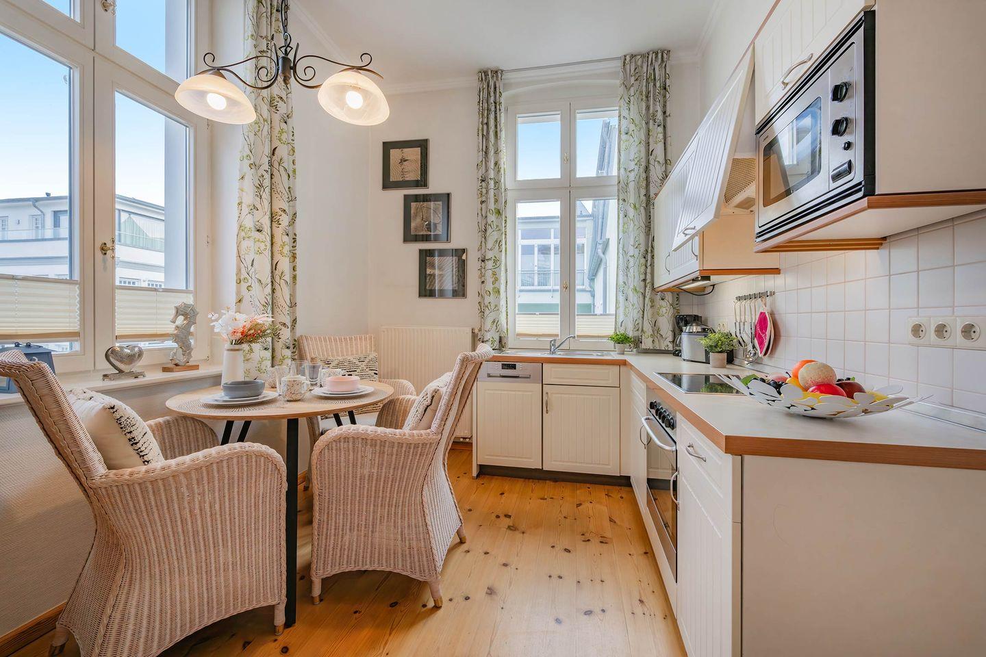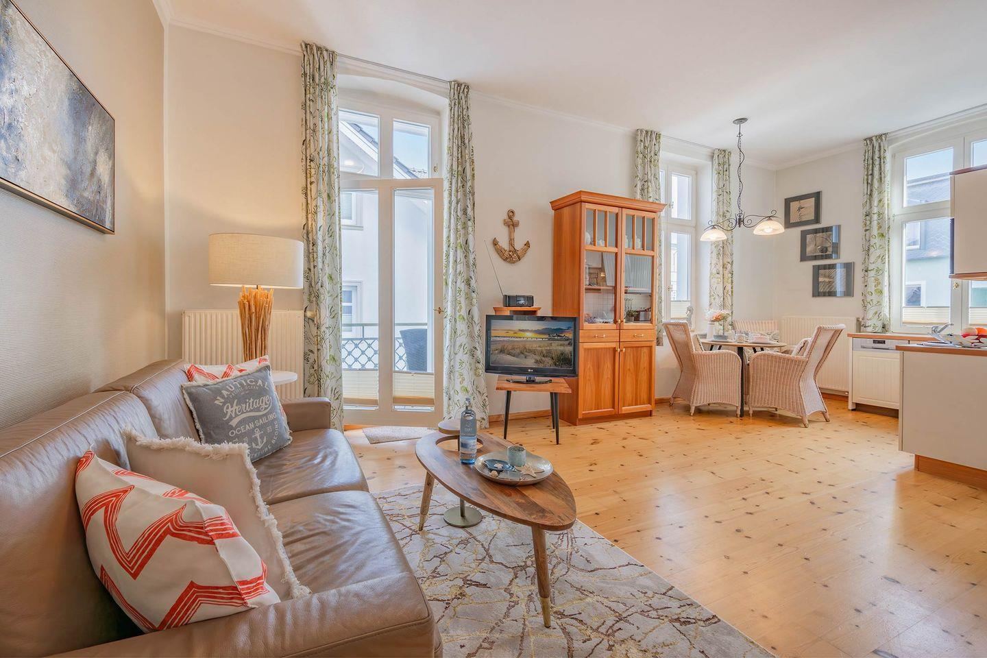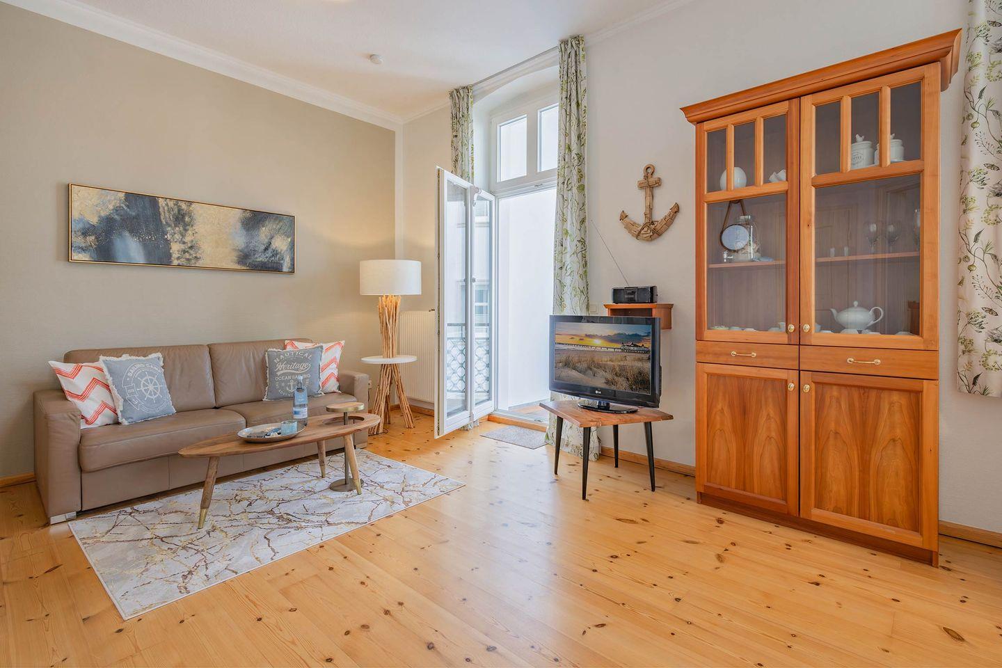Im ersten Stockwerk des Altbaus finden Sie die liebevoll eingerichtete Wohnung „Wustrow“. Das geräumige Appartement, ideal für drei Personen, verfügt über 49 Quadratmeter Wohnfläche und hält, als besonderes Highlight, zwei Balkone für Sie bereit. Der helle Wohnbereich wurde geschmackvoll mit einem bequemen Lederschlafsofa, Couchtisch und einem Flat-TV ausgestattet. Von hier haben Sie Zugang zum ersten der beiden Balkone, auf dem Sie Ihren morgendlichen Kaffee bei frischer Seeluft genießen können. Die offene Küchenzeile ist mit allen wichtigen Haushaltsgeräten bestückt und ermöglicht die Zubereitung eigener Gerichte. Frühstücken Sie zusammen mit Ihren Liebsten an dem Esstisch oder nehmen Sie ein gemeinsames Abendessen ein - viele einladende Möglichkeiten stehen Ihnen offen.