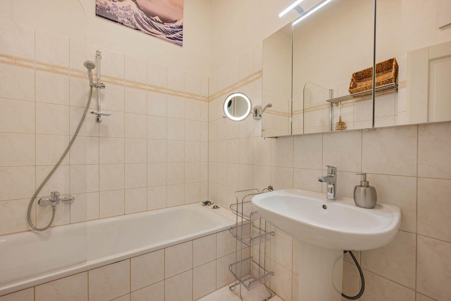 Das Badezimmer ist mit einem Waschbecken und Spiegelschank, einem WC sowie einer Badewanne ausgestattet. Für die kleinen Besucher stehen in der Wohnung Babyreisebett inkl. Matratze (ohne Wäsche) und ein Kinderhochstuhl zur Verfügung. WLAN ist selbstverständlich vorhanden.