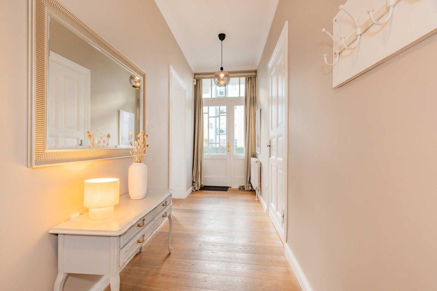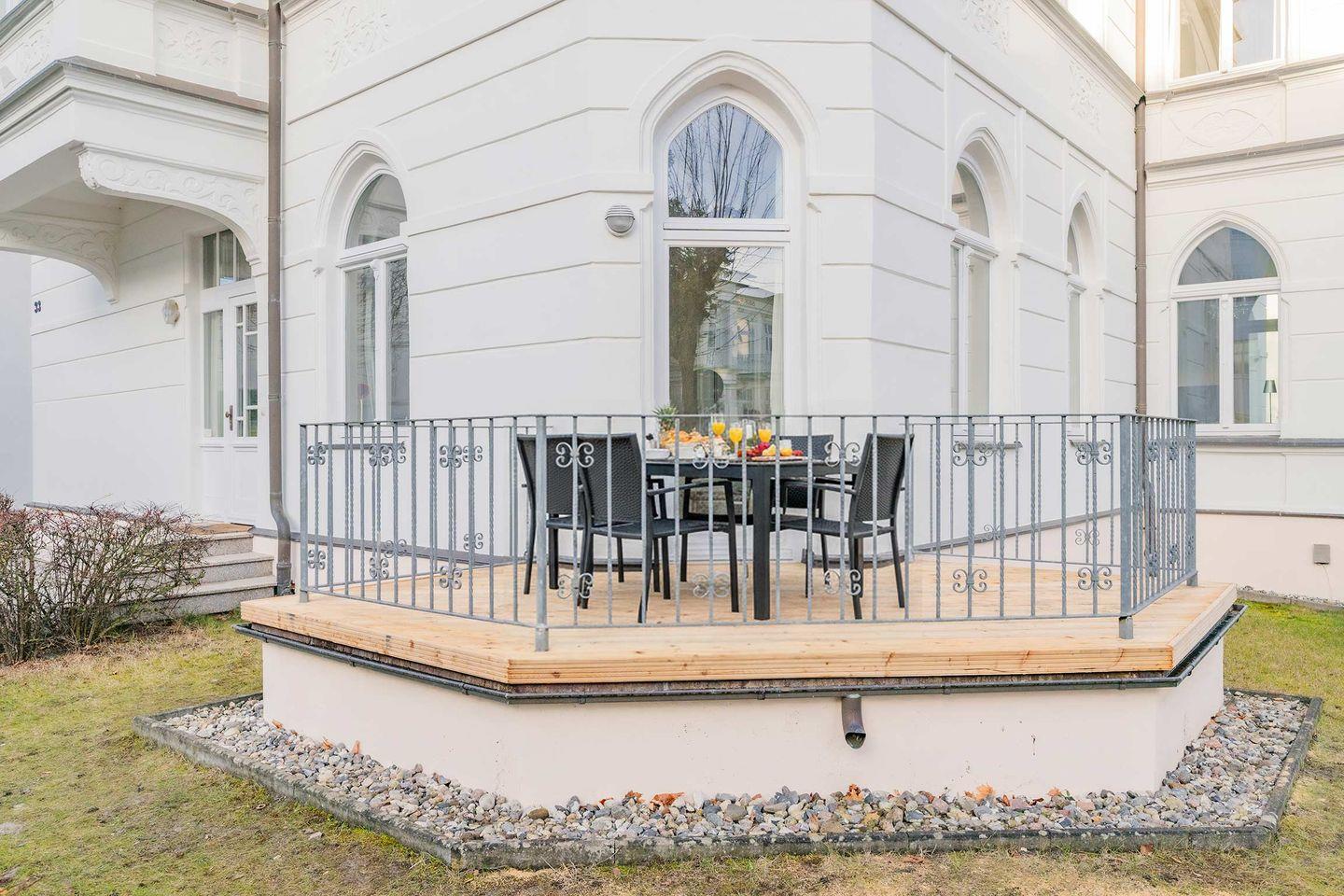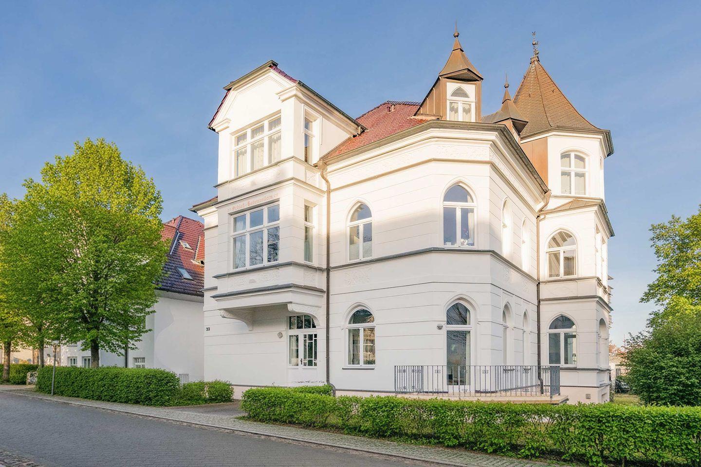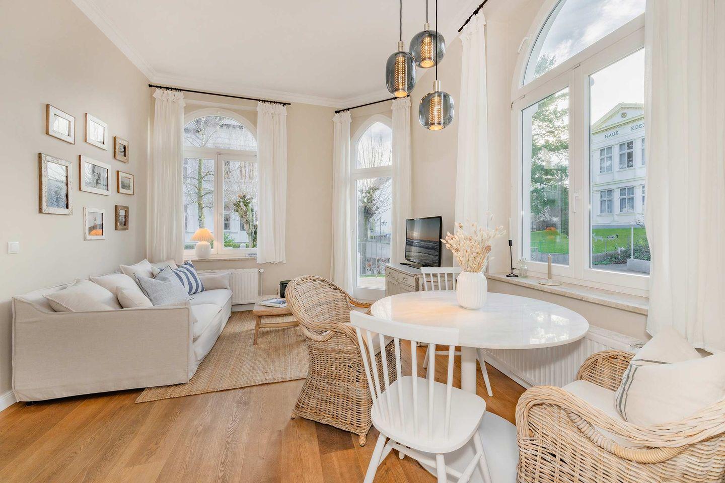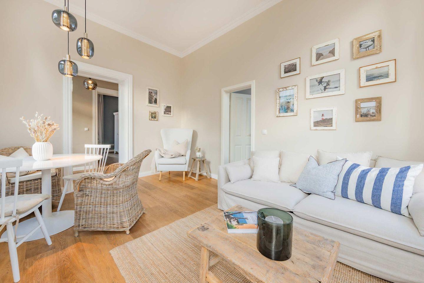 Eingebettet in die charmante Bäderarchitektur des Kaiserbades Ahlbeck präsentiert sich die Ferienwohnung Nummer 14 im Schloss Hohenzollern als stilvoller Rückzugsort in zweiter Reihe zur berühmten Promenade. Bereits beim Betreten vermittelt der separate Eingang im Erdgeschoss ein Gefühl von Privatsphäre, das sich nahtlos mit dem unverwechselbaren Charme der alten Villa verbindet. Vier Meter hohe Stuckdecken und ein edles Echtholzparkett aus Eiche schaffen eine warme, elegante Atmosphäre, die modernen Wohnkomfort harmonisch ergänzt.
