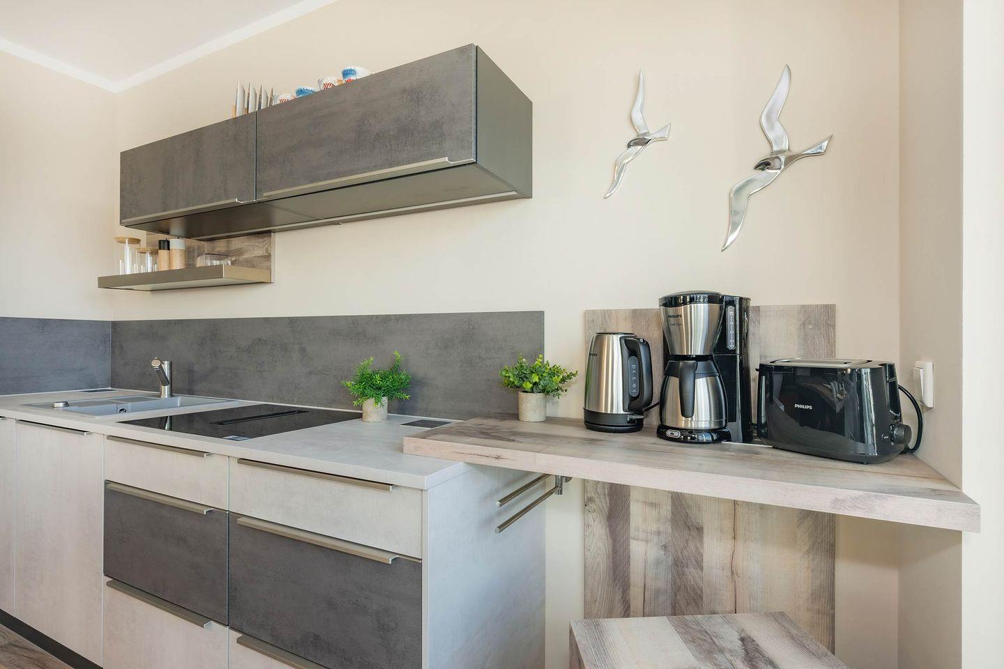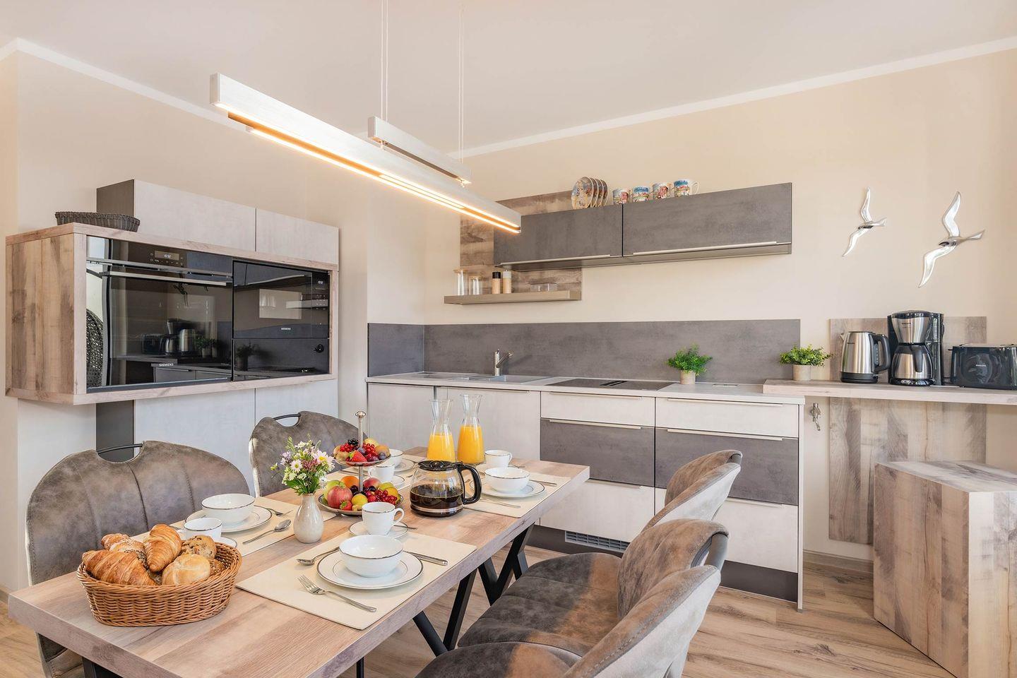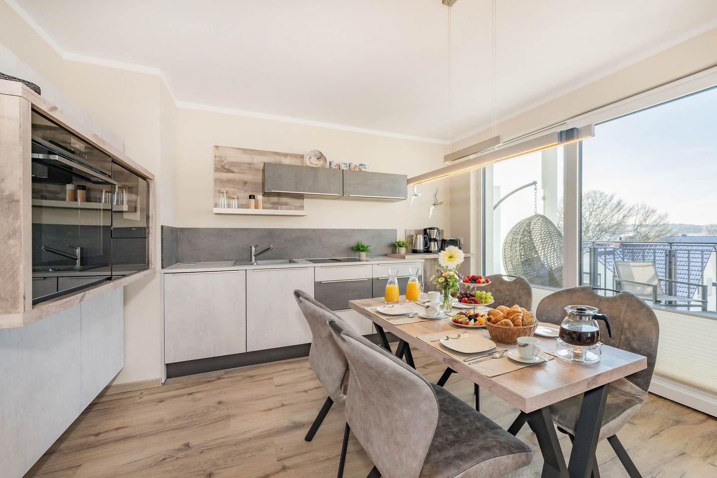 Die moderne Küche ist offen integriert und lässt mit Backofen, Induktionskochfeld, Spülmaschine sowie einer Kühl- und Gefrierkombination mit integriertem Weinschrank keine Wünsche offen. Der angrenzende Esstisch bietet den idealen Rahmen für gemeinsame Mahlzeiten, ein ausgedehntes Frühstück oder gemütliche Abende. Ein besonderes Highlight ist der großzügige, sonnige Balkon mit Südwest-Ausrichtung, der mit komfortabler Bestuhlung ausgestattet ist und zu entspannten Stunden an der frischen Ostseeluft einlädt – perfekt, um den Tag bei einem Glas Wein ausklingen zu lassen.