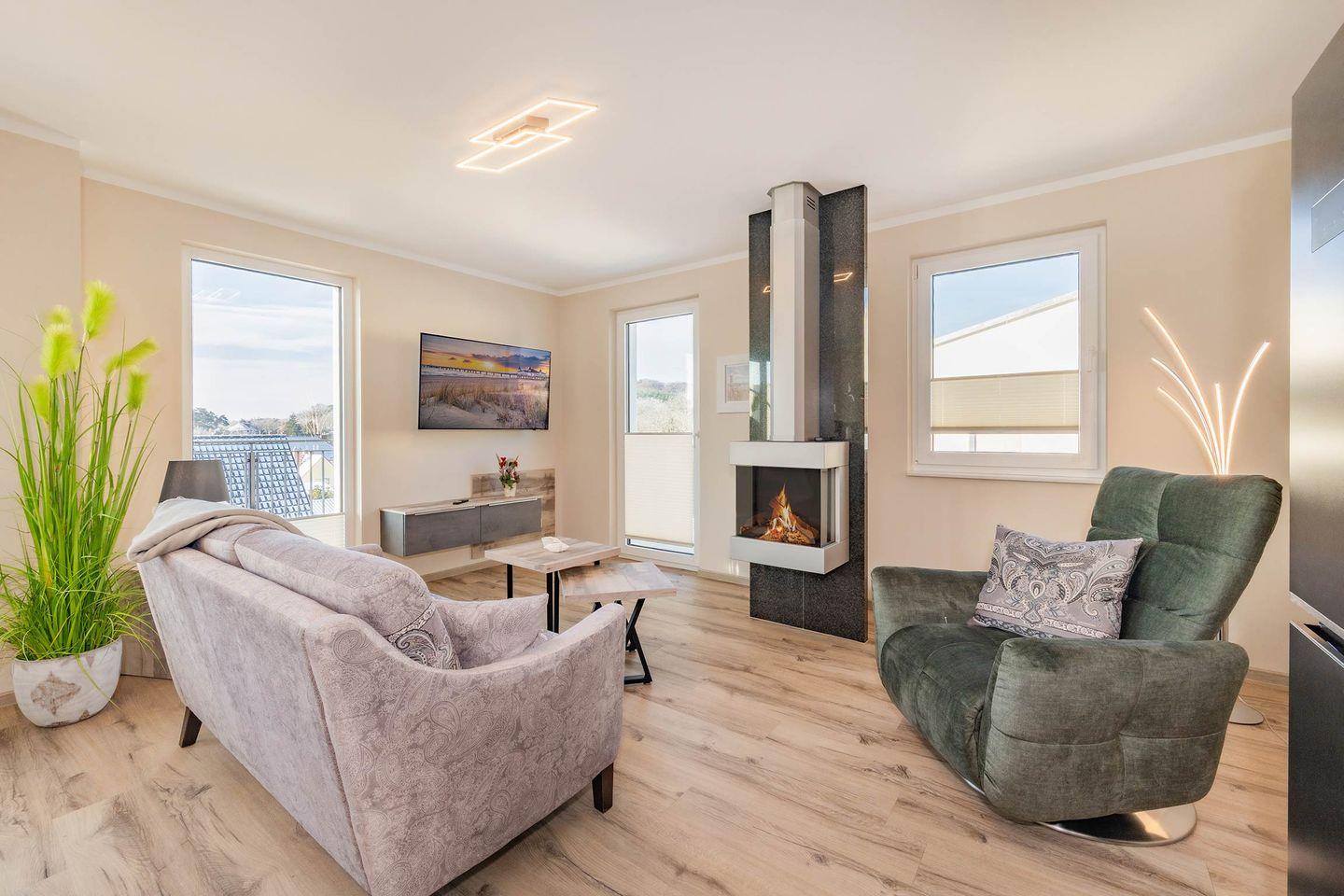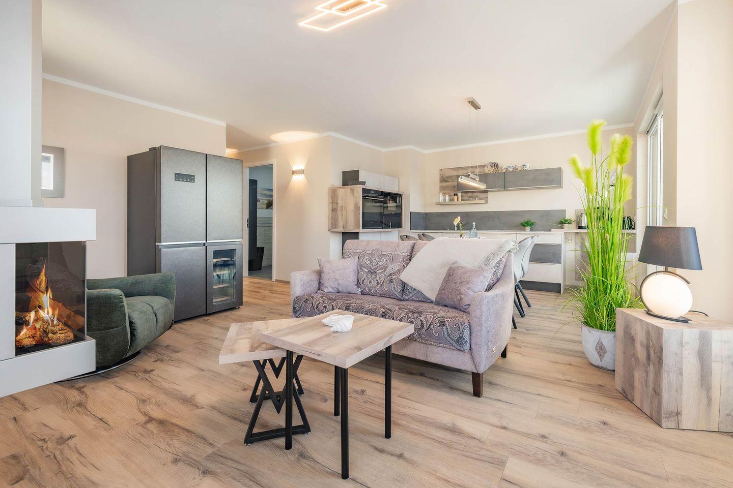 Die rund 63 Quadratmeter große Ferienwohnung befindet sich in der zweiten Etage des im Jahr 2025 neu erbauten Feriendomizils „Villa Kamadori“ und überzeugt durch ein modernes, lichtdurchflutetes Wohnkonzept. Der offen gestaltete Wohn- und Essbereich bildet das Herzstück der Wohnung und ist mit hochwertigen Möbeln, stilvoller Dekoration und einem eleganten Gas-Kamin ausgestattet, der auch an kühleren Tagen für eine behagliche Atmosphäre sorgt. Der Flat-TV im Wohnraum ermöglicht die Nutzung von Amazon Prime und Netflix über den eigenen Account und lädt zu entspannten Abenden ein.