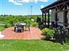 Vor der Ferienwohnung befindet sich eine große Wiese mit einer Terrasse, Sitzmöbeln und Grill.
