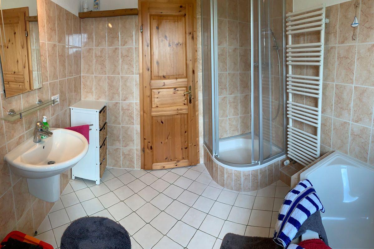 Lage: Die Ferienwohnung in Ahrenshagen befindet sich in einem Haus in dem es noch eine zweite Ferienwohnung gibt. Sie bewohnen die gesamte obere Etage des Hauses. Die zweite Ferienwohnung befindet sich im Erdgeschoss. Auf dem 1800 m² großen abgeschlossenen Grundstück haben Sie viel Platz zum Spielen und Entspannen. Wenn Sie über Ihren Gartenzaun blicken werden Sie viel Natur sehen. Dabei können Sie sich gern mit den Gästen der anderen Ferienwohnung anfreunden, oder sich ein eigenes stilles Plätzchen suchen. In Ahrenshagen gibt es Einkaufsmöglichkeiten, eine Tankstelle, eine Auto- Werkstatt, einen Frisör, einen Arzt und Zahnarzt sowie einen Tierarzt. Gaststätten sind einige in der Nähe vorhanden. Die Ferienwohnung liegt verkehrstechnisch günstig, aber ruhig an einer NebenStraße. Ahrenshagen ist durch seine Lage der ideale Ausgangspunkt für Ihre Unternehmungen, Mecklenburg mit seiner reizvollen Küstenregion kennen zulernen. Zur Ostsee mit seinen Seebädern auf der Halbinsel Darß-Zingst und seinen weißen feinsandigen Stränden beim Ostseebad Dierhagen sind es nur 20 km. In der Nähe zu Ihrem Grundstück beginnen die Naturschutzgebiete, der Nationalpark Vorpommersche Boddenlandschaft, das Ribnitzer Große Moor und die Rostocker Heide, sowie das Recknitztal. Bestens geeignet für Spaziergänge und Naturbeobachtungen, vor allem aber auch Radtouren auf dem Rad-Wanderweg rund um den Bodden und entlang der Bodden- und Ostseeküste mit ihrem naturbelassenen Strand. Oder Sie planen eine kombinierte Schiffs- Radtour und starten im Hafen von Damgarten, in nur 7 km. Auch ein Besuch der Hansestadt Rostock und Stralsund, der Insel Rügen oder der Insel Usedom ist sehr lohnenswert und einen Tagesausflug wert. Ob Baden im Meer, Segeln und Surfen, Radfahren und Wandern, Skaten und Golfen, Sie werden von den Reizen der Region begeistert sein. Gerne können Sie auch das Freilichtmuseum Klockenhagen, das Bernsteinmuseum in Ribnitz-Damgarten mit der umfangreichsten Sammlung Deutschlands und einer Schauwerkstatt, oder die Sauna und Badelandschaft in der Bodden-Therme in Ribnitz-Damgarten besuchen.