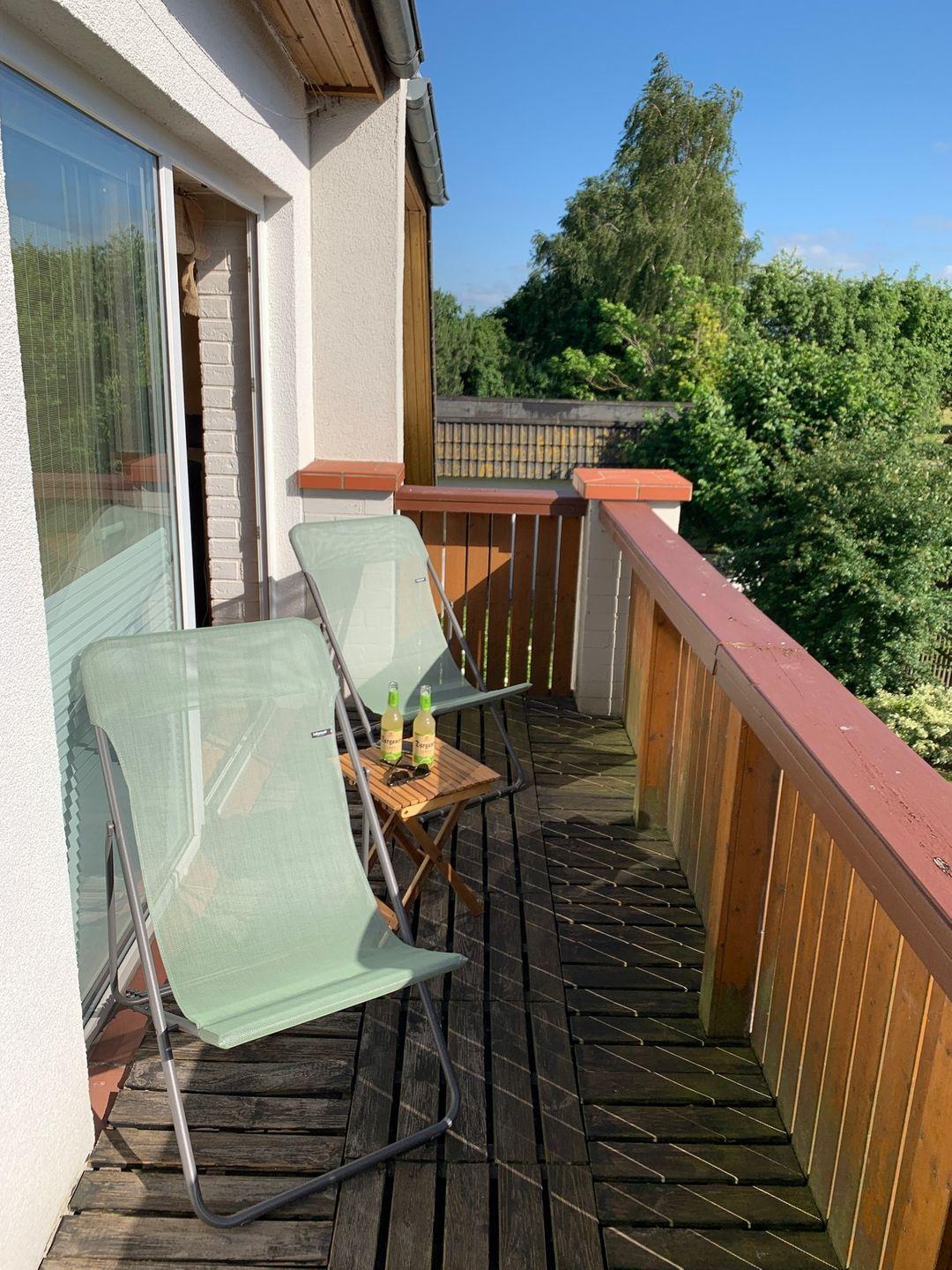 Die Ferienwohnung in Ahrenshagen ist großzügig geschnitten und hochwertig eingerichtet. Durch ein kleines Treppenhaus gelangen Sie über Ihren eigenen Eingang in die Wohnung. Vorne im Flur steht ein Kleiderschrank. In der gut ausgestatteten Einbauküche finden Sie einen Backofen, ein Cerankochfeld, eine Mikrowelle, einen Grill, einen Geschirrspüler, eine Waschmaschine, einen Kühlschrank, einen Toaster, eine Kaffeemaschine, einen Wasserkocher und eine Espressomaschine. Des Weiteren steht in der Küche einen Esstisch mit Stühlen. Im Bad gibt es eine Dusche, eine Eckbadewanne, ein WC und ein Waschbecken. Das Wohnzimmer ist mit zwei Ledercouchen, einem kleinen Tisch, Regalen und einem Siteboard, dem Fernseher, einer Stereoanlage, einem DVD-Player und einem Kaminofen ausgestattet. Die Ferienwohnung verfügt über zwei Schlafzimmer. Eins ist mit einem Doppelbett und einer Kommode möbliert. Im zweiten Schlafzimmer stehen zwei Einzelbetten und ein Kleiderschrank. Durch das Wohnzimmer gelangen Sie auf Ihren Balkon. Im Garten gibt es ein Pavillon, den Sie gerne nutzen können. Dort stehen auch Gartenmöbel und ein Grill für Sie bereit.Vor der Haustür ist eine weitere kleine Terrasse, auf der Sie die Morgensonne genießen können. Ein PKW-Parkplatz mit Carport ist auf dem Grundstück vorhanden.