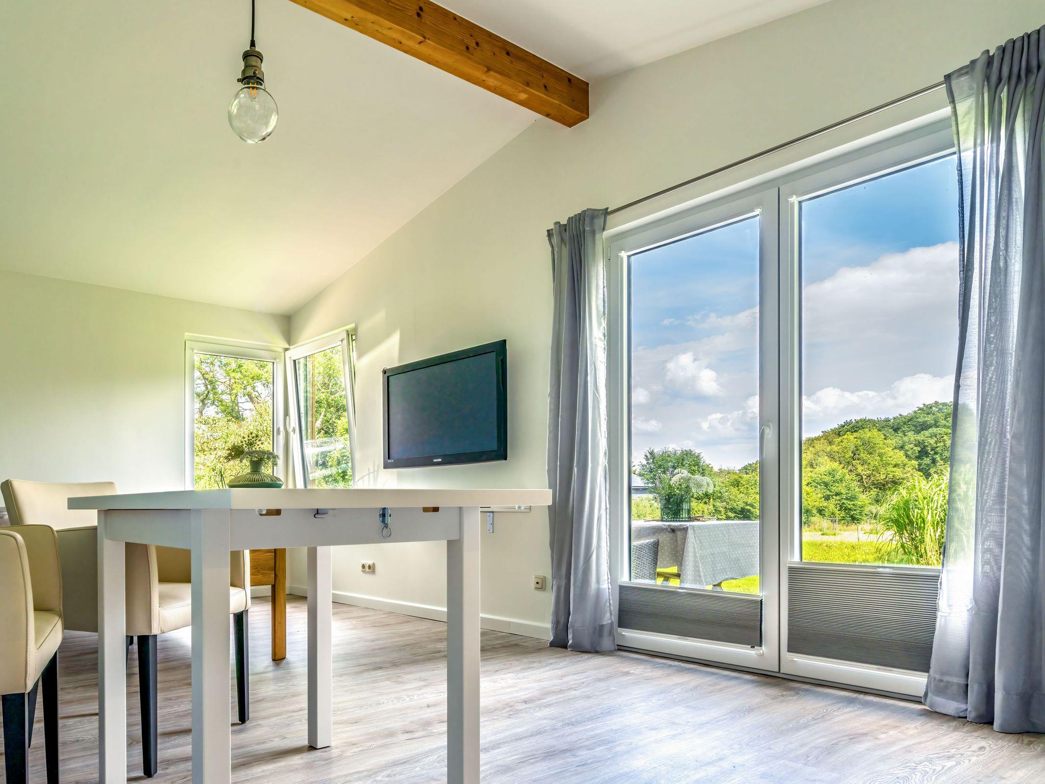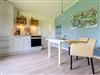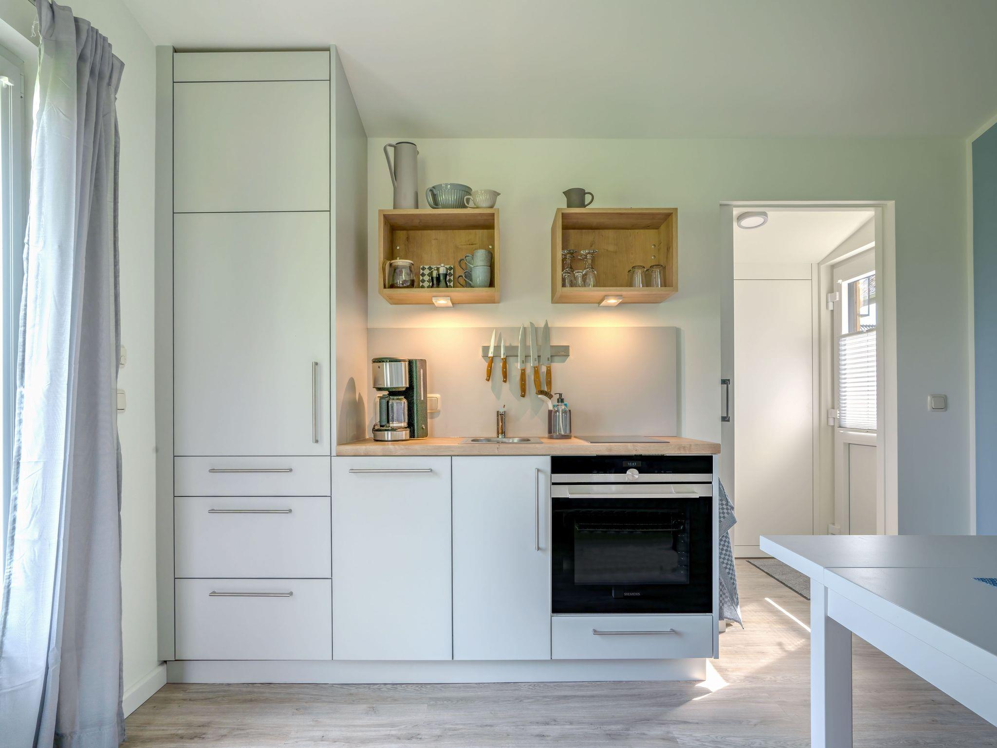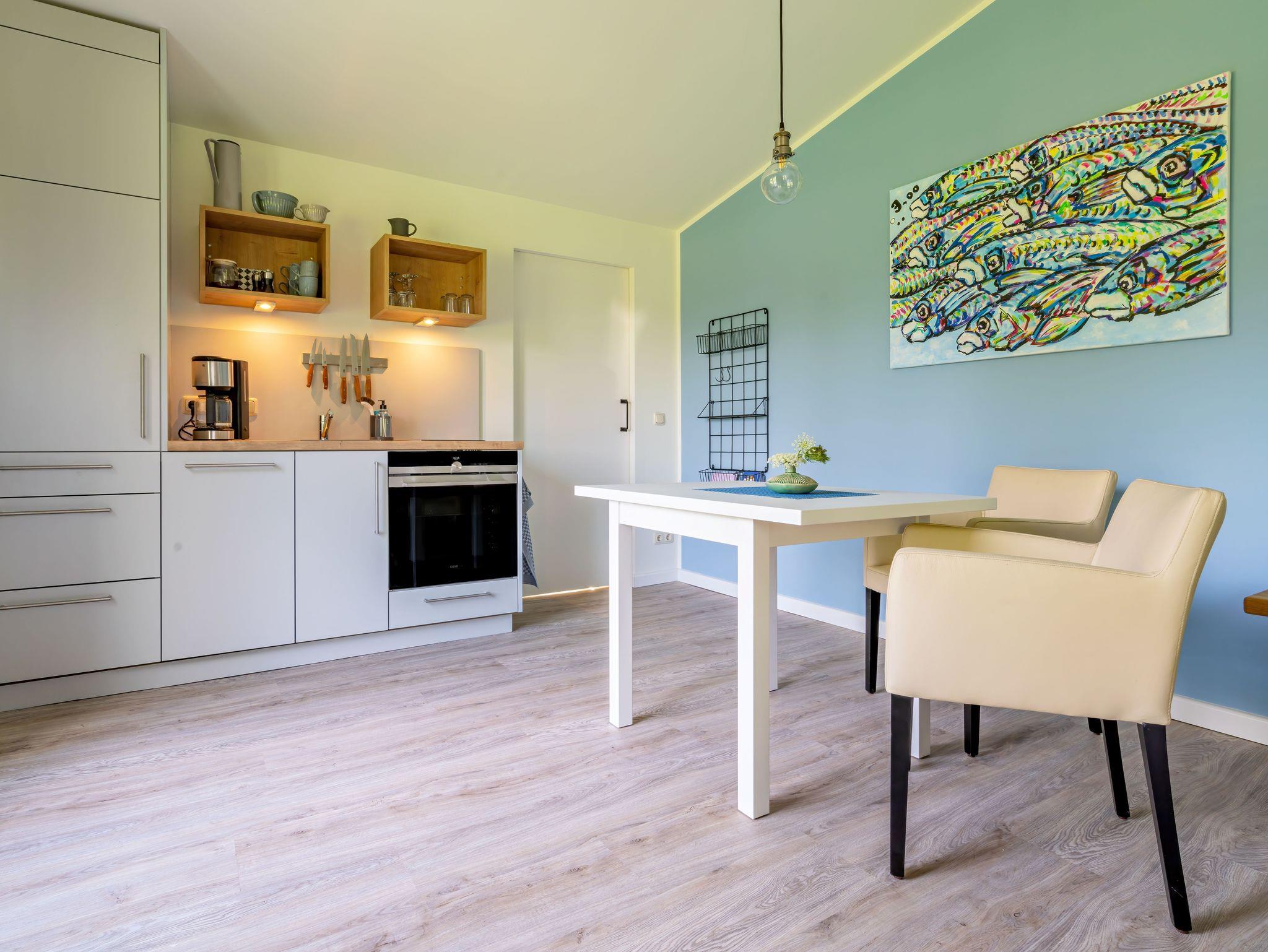 Es ist mit einem Flachbild-TV, einem Essbereich sowie einer Küchenzeile, bestehend aus Kühlschrank, Backofen, Geschirrspüler und Induktionsherd, ausgestattet.