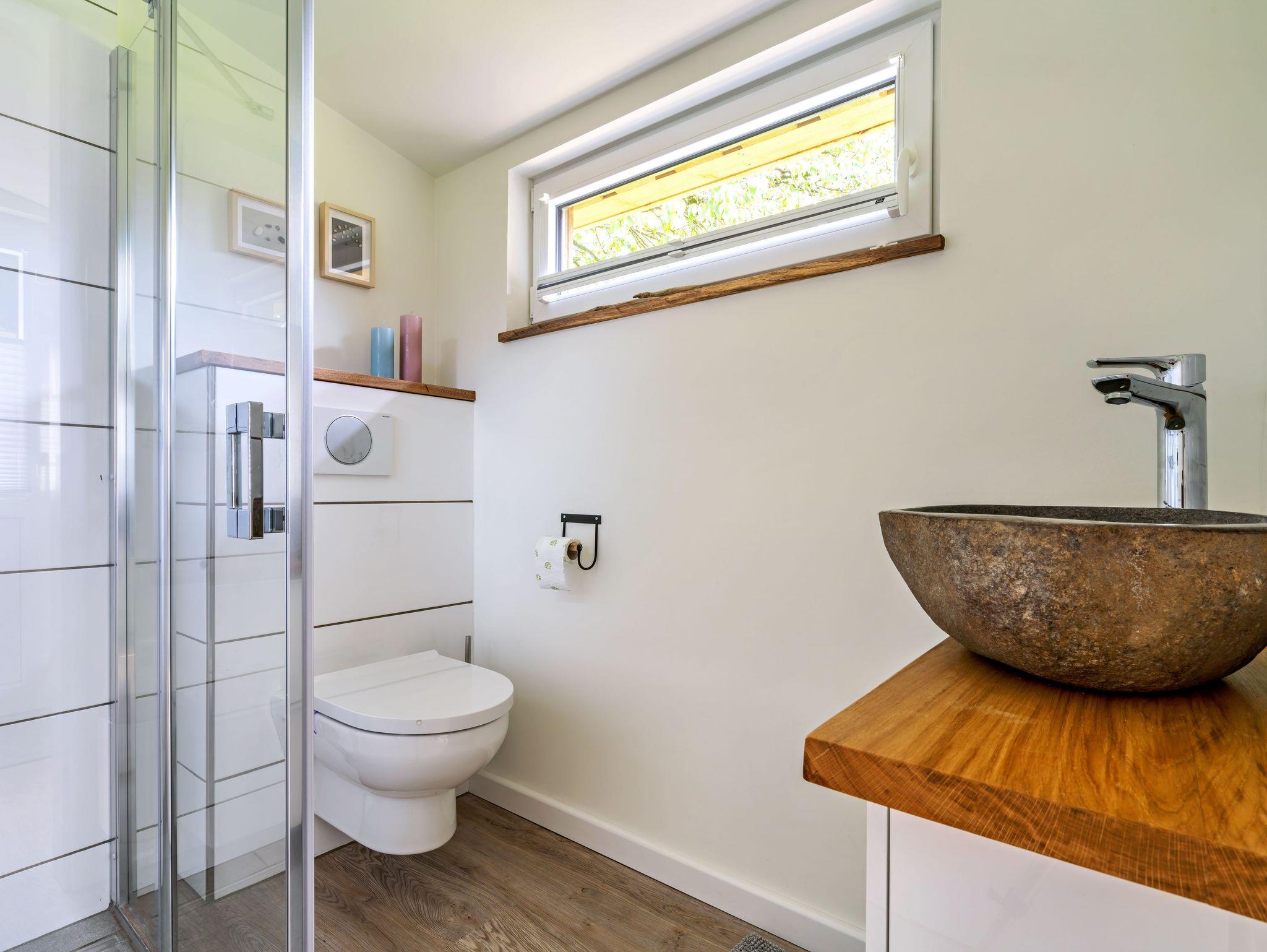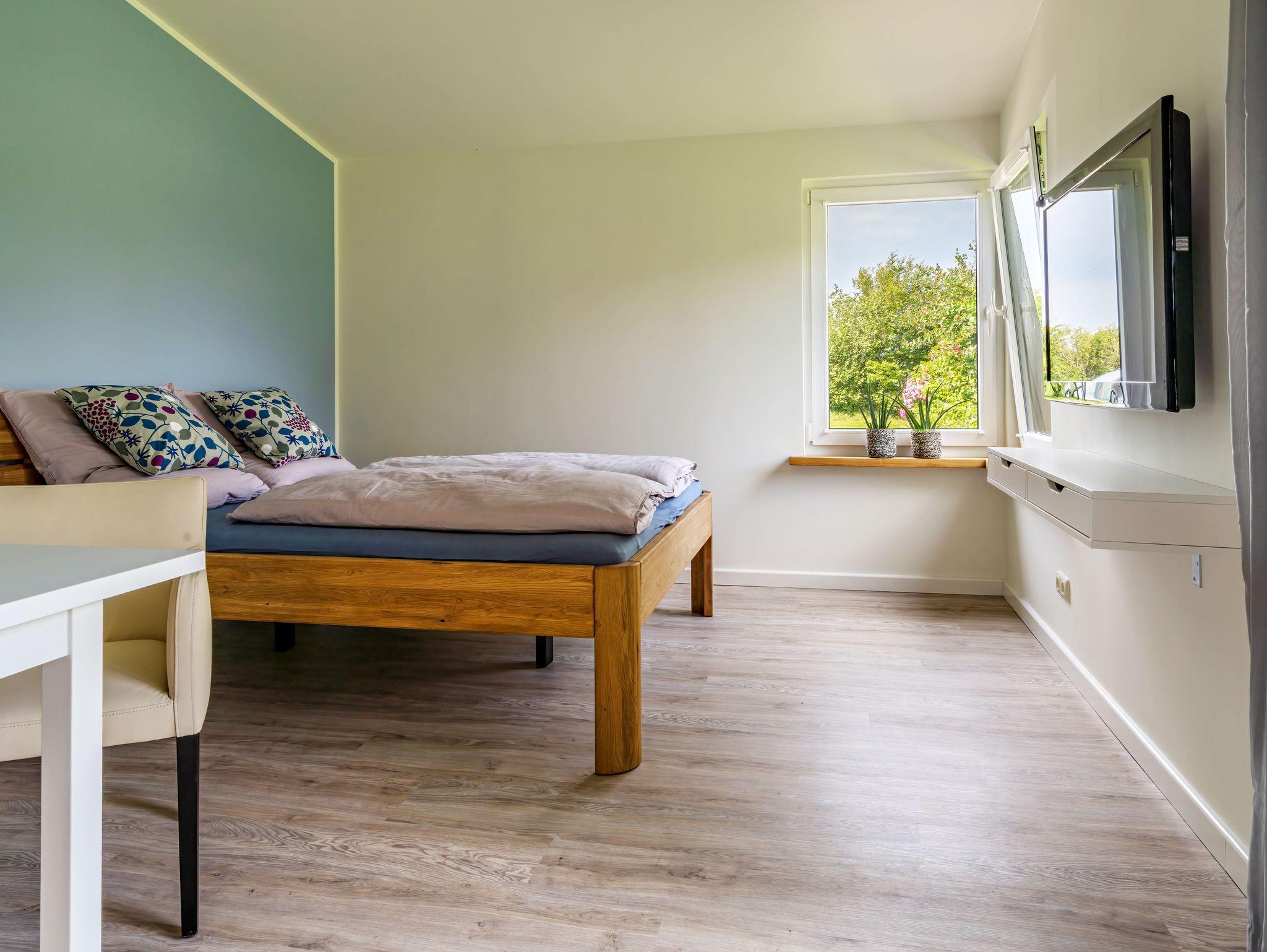 Das Bett hat eine Größe von 1,60 x 2,00 m. Das Badezimmer ist hell und modern, bietet eine ebenderdige Dusche, WC und Waschbecken.