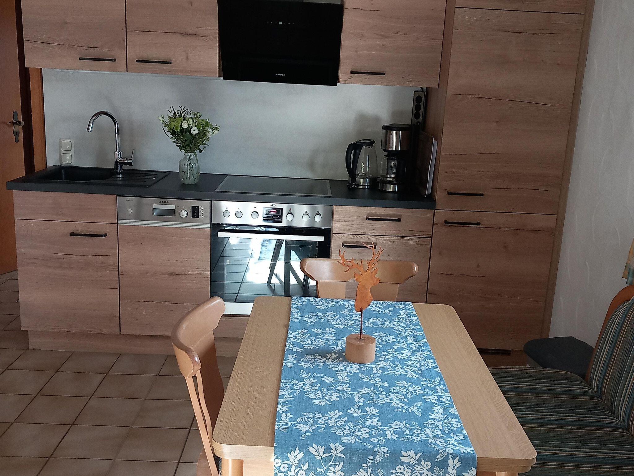 Die gemütliche Ferienwohnung Gaisberg befindet sich im Erdgeschoss. Sie hat zwei Schlafzimmer, eine Wohnküche, ein Badezimmer mit barrierefreier Dusche und einen großen Wintergarten mit Blick auf die Natur.