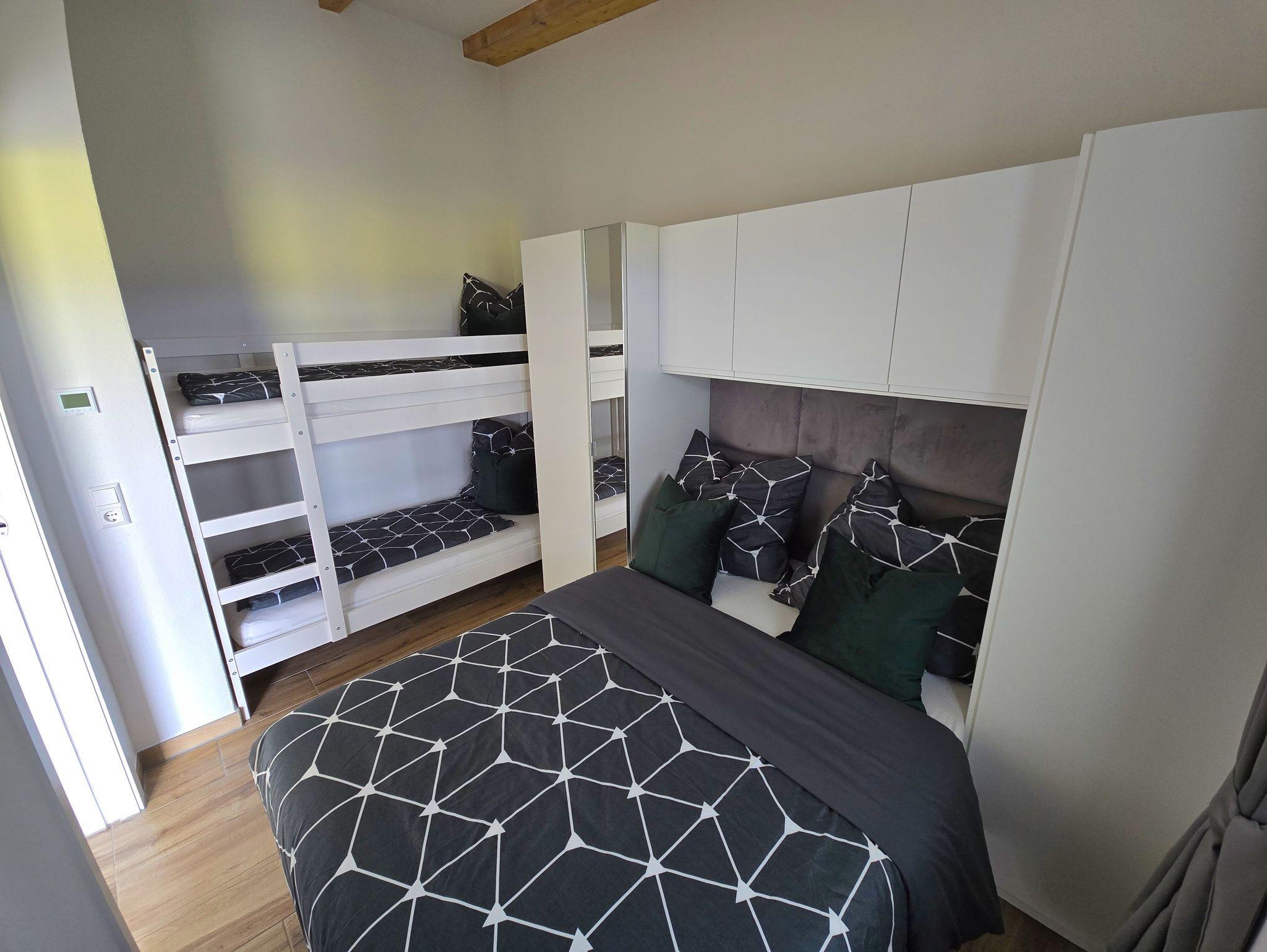 Das Schlafzimmer verfügt über ein Doppelbett (Maße: 140x200 cm) und einem Etagenbett (Maße: je 90x200 cm, auch für Erwachsene geeignet bis 100 kg), was einer Belegung von max. 4 Personen entspricht.