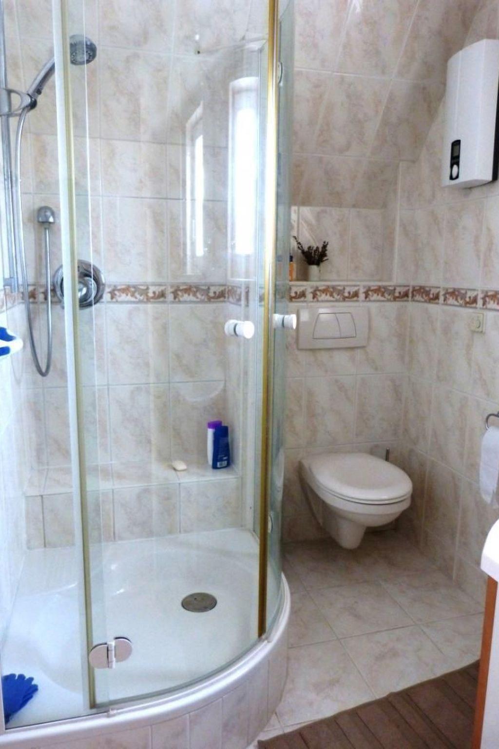 The 120m² house provides a central tiled fireplace stove fired with wood for heating the house, as well as additional central heating . The ground floor has a big kitchen with a sitting corner for up to eight people. There is a giant living room with a lounge area and dining space with a hatch through to the kitchen. The solid wood floorboards give the living and dining room an especially cosy atmosphere. The bench by the fireplace stove is cosy in winter. The first floor has a big living room-bedroom with a double bed and single bed, as well as a smaller room with two pull-out beds. There is also a bathroom with underfloor heating, a shower and toilet. There are two further beds and another lounge in the attic. It is a non-smoking house. Children are welcome (highchair, cot on request). The site is fenced and pets are allowed. Since March 2015 the house has an additional pellets central heating to enhance residential comfort. Since January 2017 there are new natural wooden windows in all the rooms. Also in 2018 a wooden floor was installed in the living room.