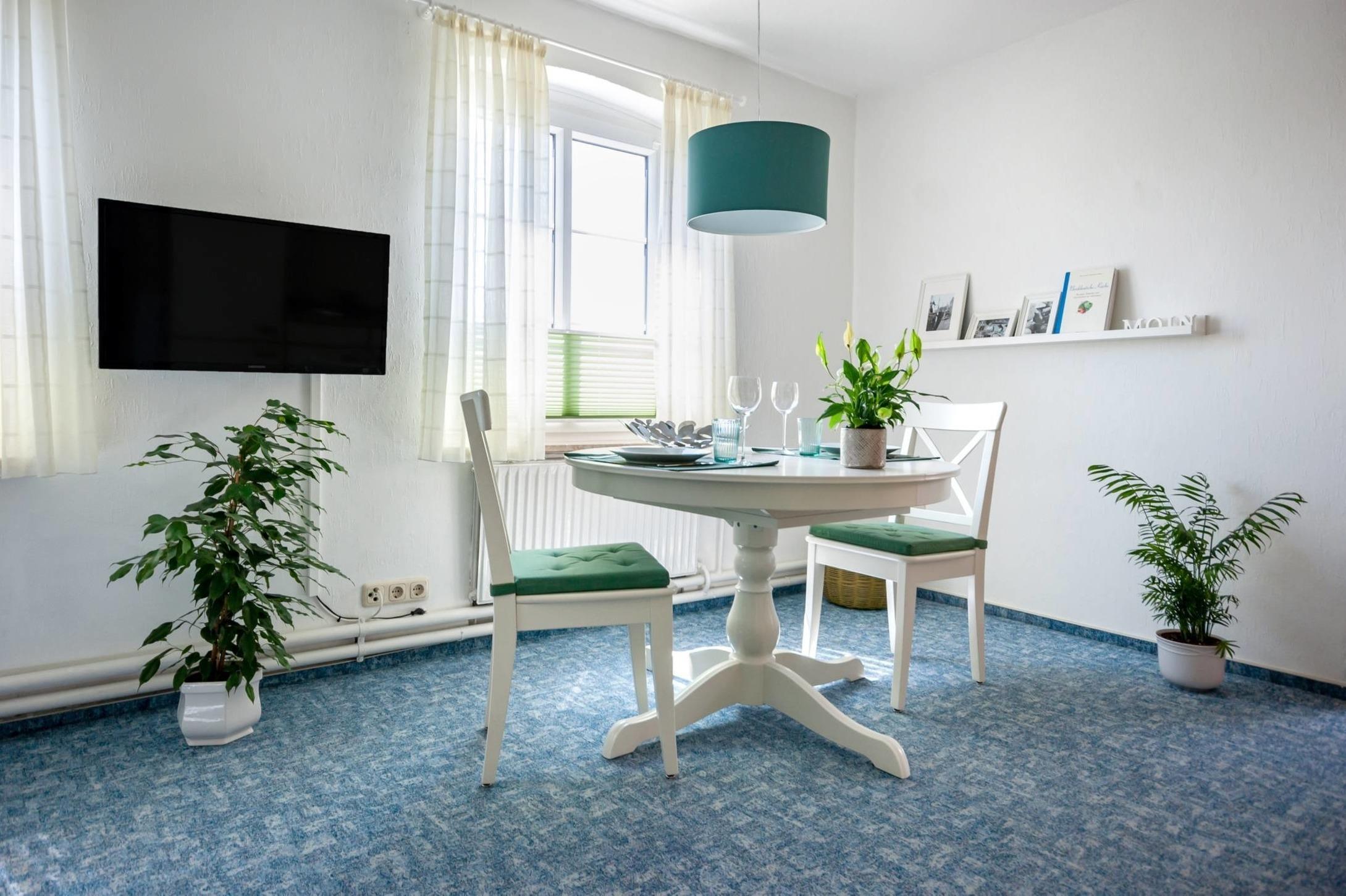Die in frischen und hellen Farben eingerichtete Wohnung lädt Sie zum Verweilen und Entspannen ein. In der Wohnküche lässt es sich wunderbar gemeinsam kochen und anschließend am großen Esstisch zusammen genießen. Eine kleine Auswahl an echten fehmarnschen und norddeutschen Kochbüchern bietet die Gelegenheit Neues auszuprobieren oder einfach nur zu stöbern. Vom Fenster aus können Sie nicht nur einen Teil des gepflegten Bauerngartens überblicken, sondern auch über die umliegenden Felder bis zum Fehmarnsund. Lernen Sie diese Wohnung kennen, wir freuen uns auf Sie.