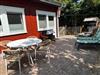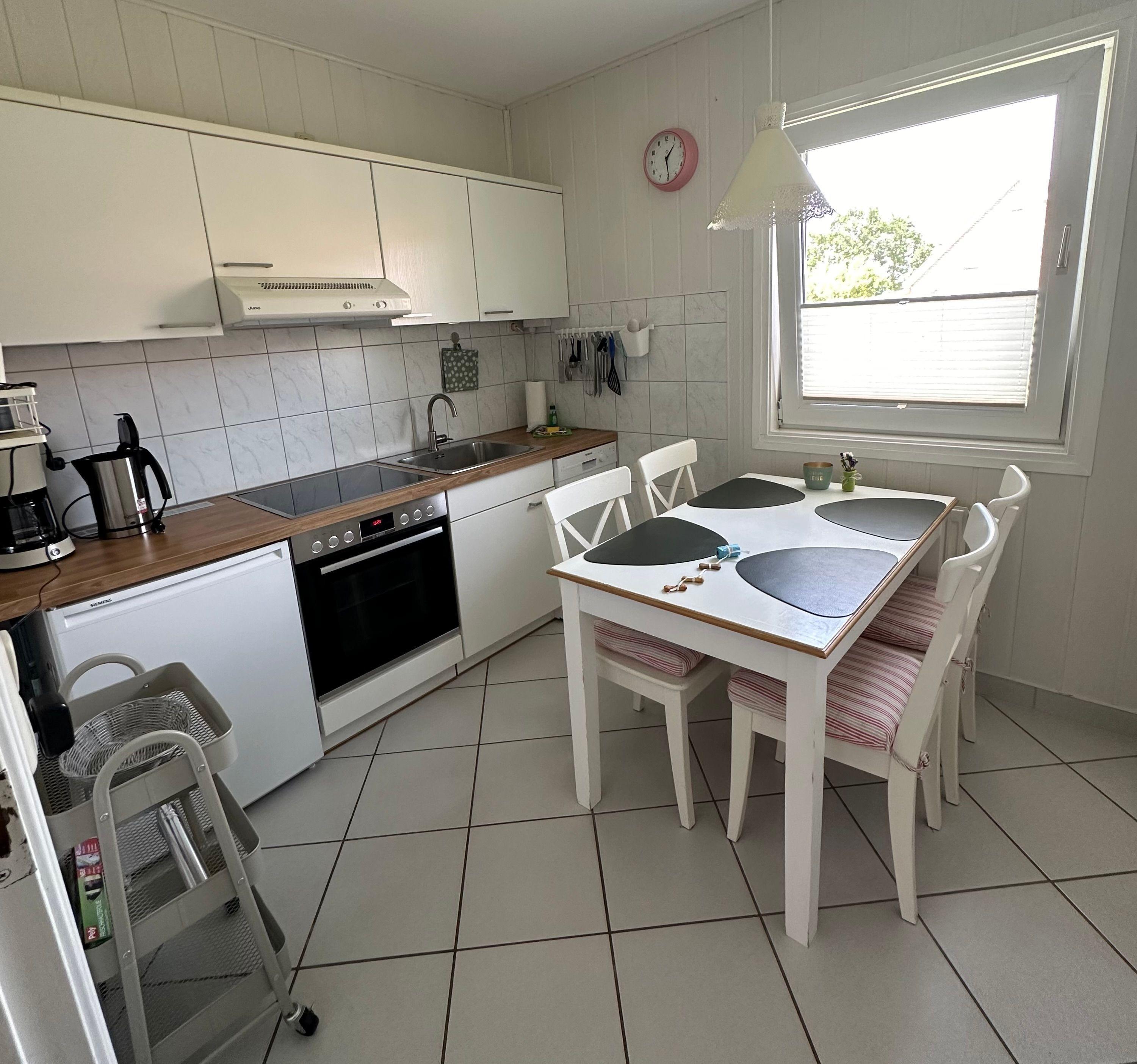 Die eingezäunte Südterrasse ist mit einem Strandkorb ,Gartentisch mit 4Stühlen, einer Gartenbank, zwei Sonnenliegen und einem Holzkohle Grill ausgestattet .