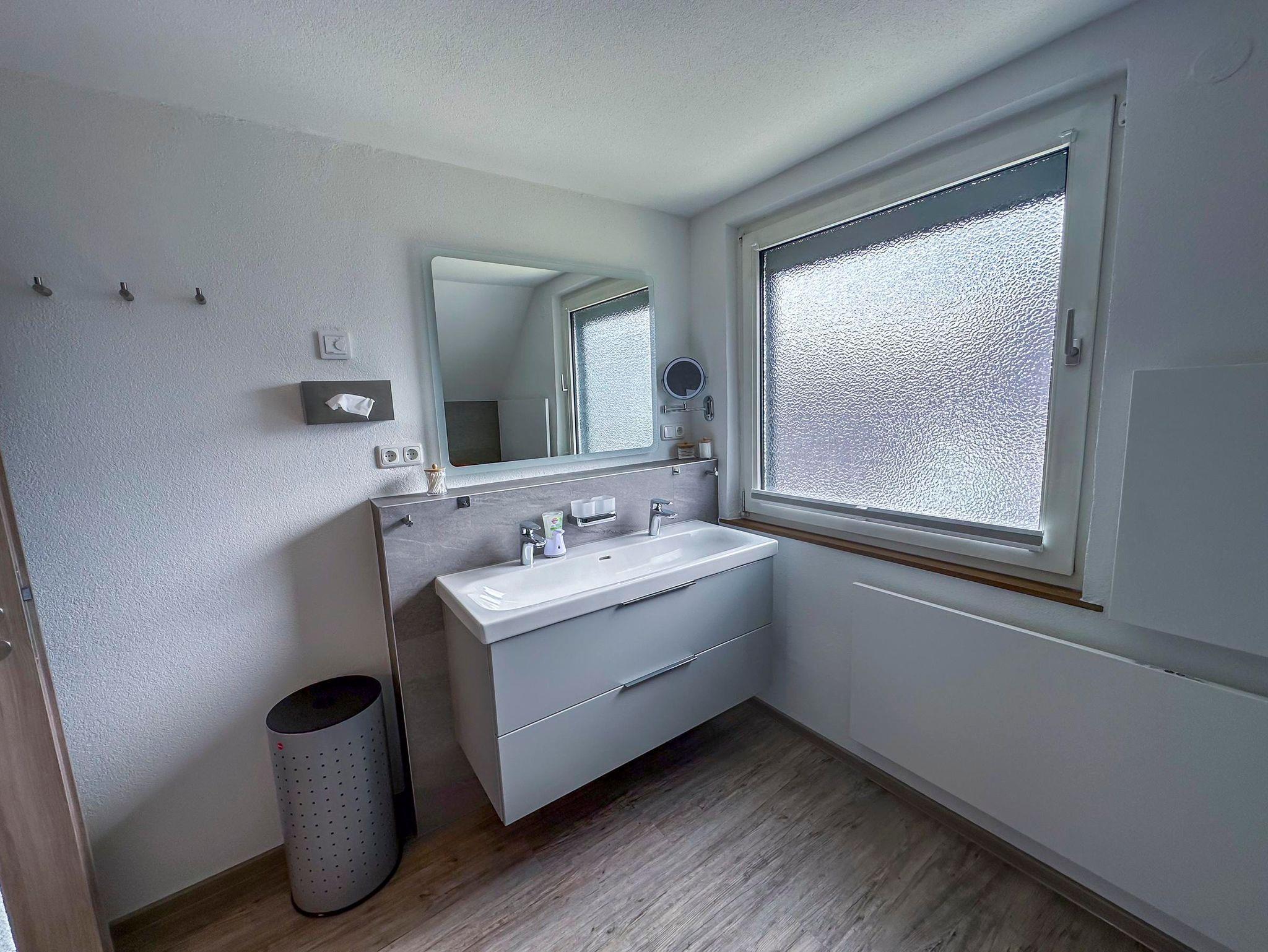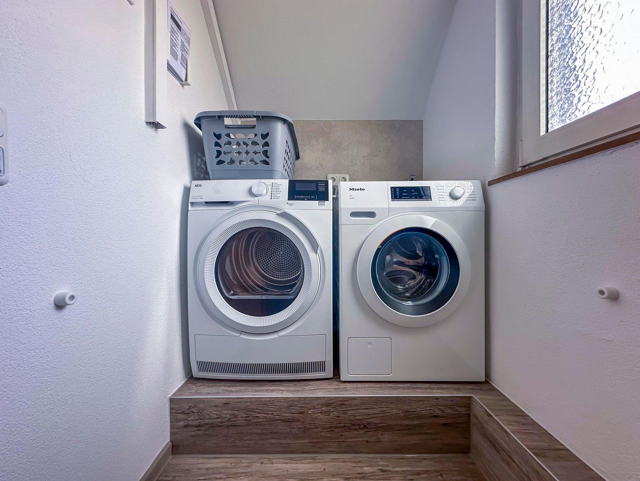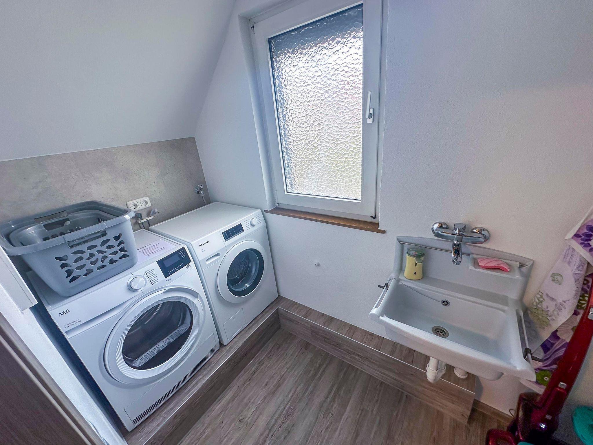 Ein gut ausgestattetes Badezimmer mit Doppelwaschtisch, Toilette und Dusche und ein Wirtschaftsraum mit Waschmaschine und Trockner befinden sich ebenfalls im Obergeschoss.
