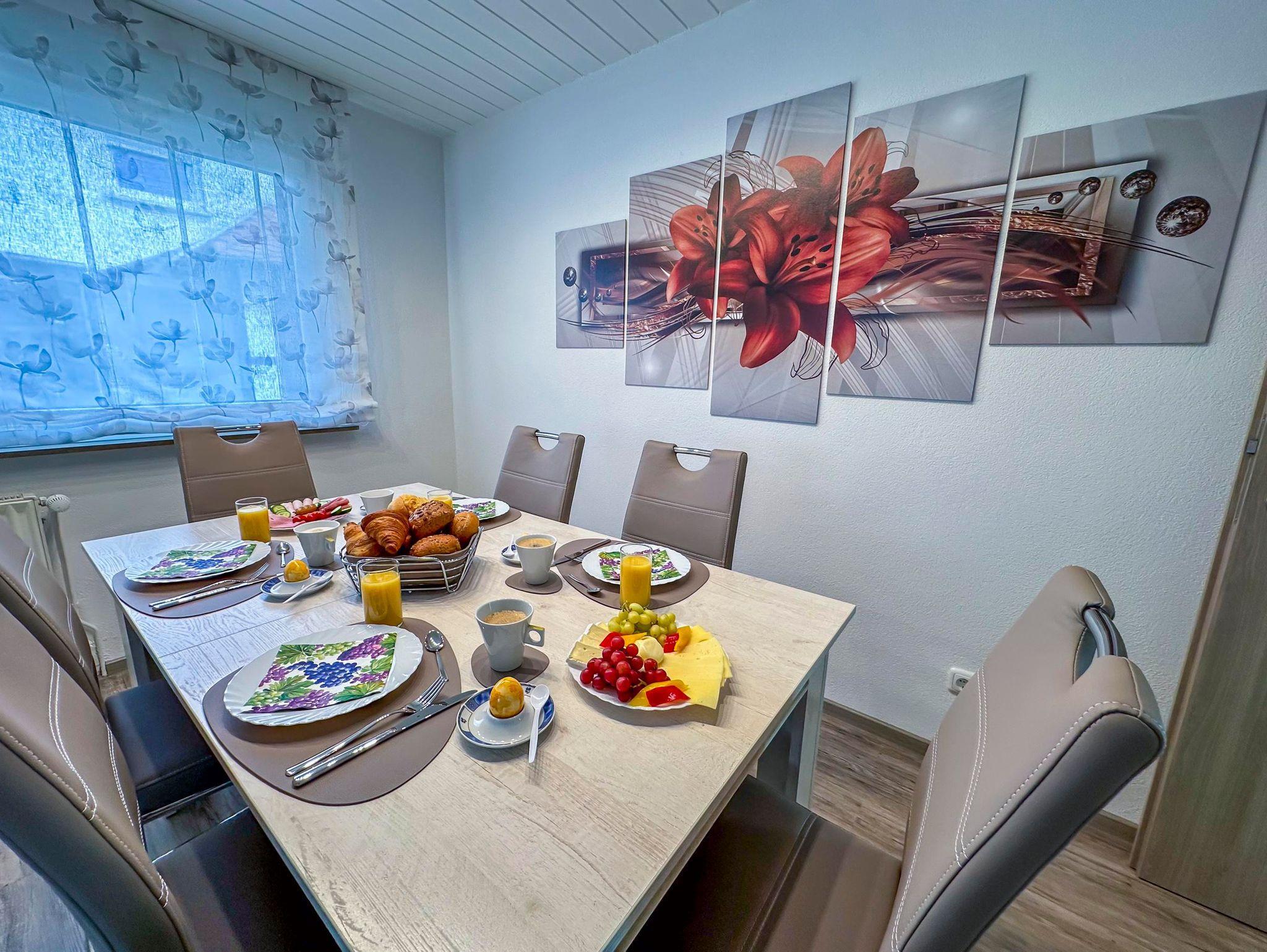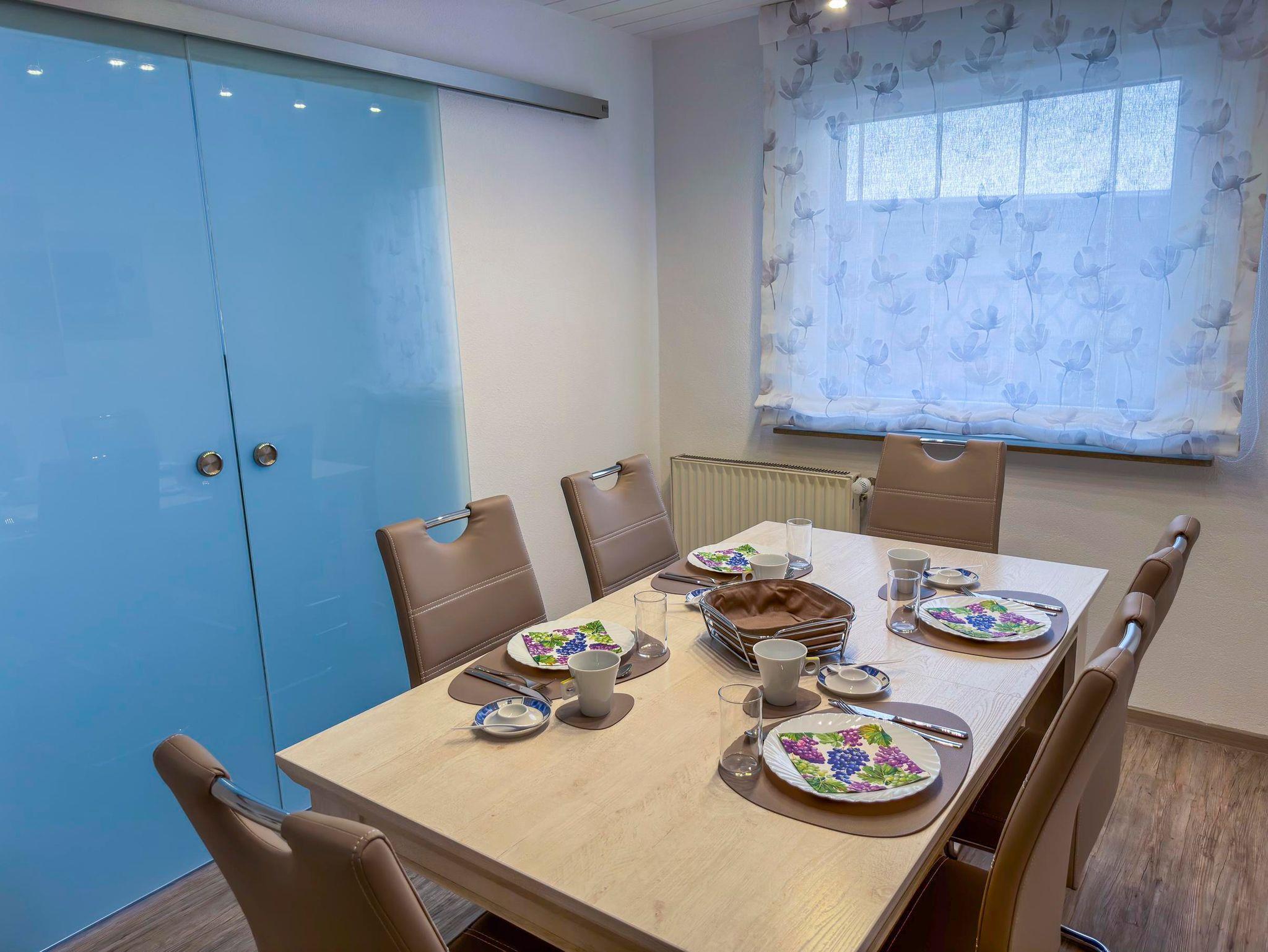 Nach einem herrlichen Tag erwartet Sie dann in unserem Ferienhaus eine voll eingerichtete moderne Küche in der es Ihnen an nichts fehlen sollte um ein leckeres Frühstück, schmackhafte Mittagessen, oder eine deftige Brotzeit zuzubereiten, welche Sie im angrenzenden Esszimmer in gemütlicher Runde genießen können. Zu geselligen Spieleabenden wird Sie dieser Raum ebenfalls einladen.