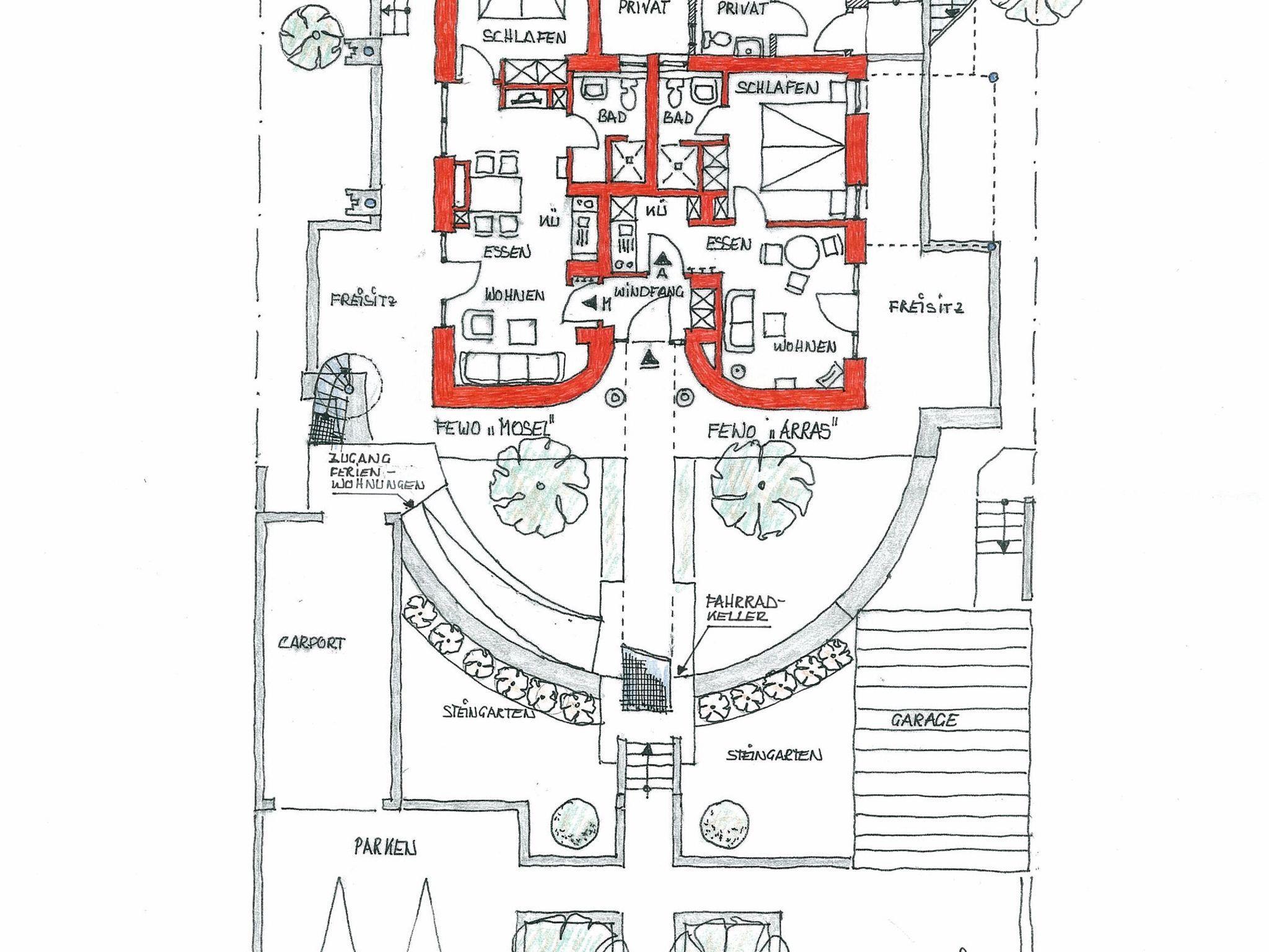 Wenn Sie für 4 Personen eine Ferienwohnung suchen bietet sich die Möglichkeit die Ferienwohnung Mosel und Arras zu mieten. Sie liegen unmittelbar nebeneinander (siehe Grundriss). Es besteht dann z.B. die Möglichkeit gemeinsam in der Fewo Mosel zu frühstücken.