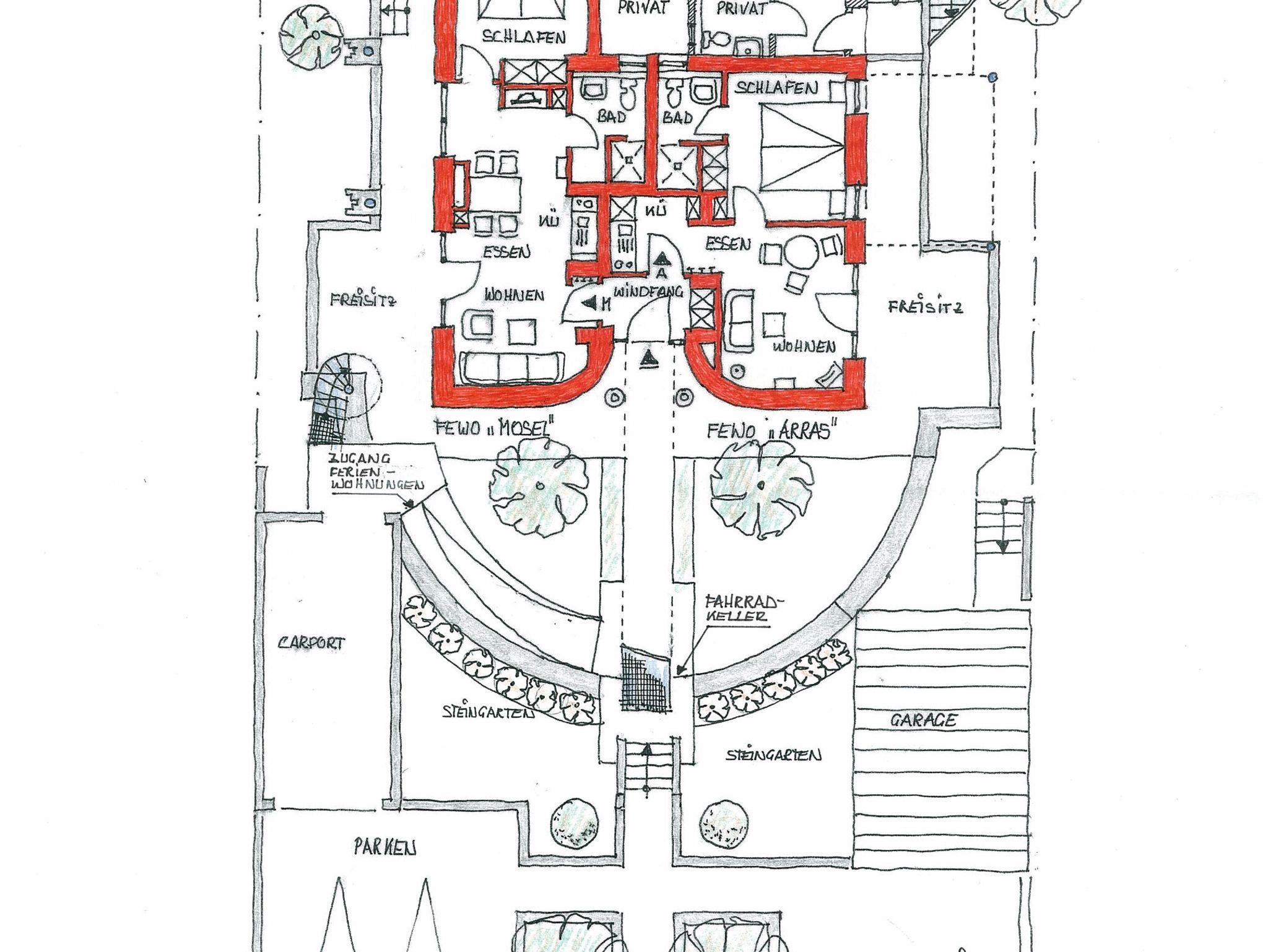 Wenn Sie für 4 Personen eine Ferienwohnung suchen bietet sich die Möglichkeit die Ferienwohnung Arras und Mosel zu mieten. Sie liegen unmittelbar nebeneinander (siehe Grundriss). Es besteht dann z.B. die Möglichkeit gemeinsam in der Fewo Mosel zu frühstücken.