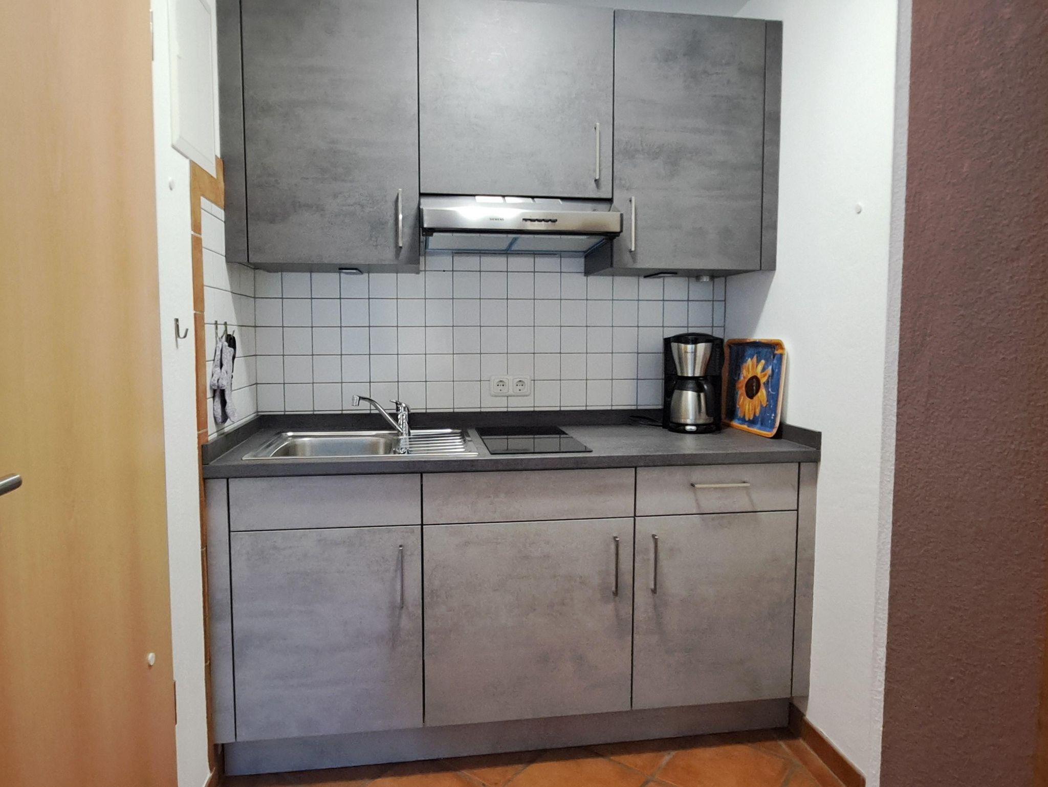 Der Wohn- und Essbereich ist nicht getrennt. Im anschließenden Kochbereich befindet sich eine Pantryküche mit 2-Platten-Ceran-Kochfeld, Kühlschrank mit Gefrierfach. Weiterhin ist die Küche mit ausreichendem Koch- und Essgeschirr, Gewürze, Mikrowelle, kleinem Backofen für Pizza und Brötchen, Wasserkocher, Kaffeemaschine und Toaster ausgestattet. Auch weitere Annehmlichkeiten wie Filtertüten, Mülltüten, Spülmittel, Spültücher finden Sie hier. Geschirrtücher sind natürlich inklusive. Der Essbereich ist mit einen runden Esstisch und zwei Dreh-Stühlen ausgestattet.
