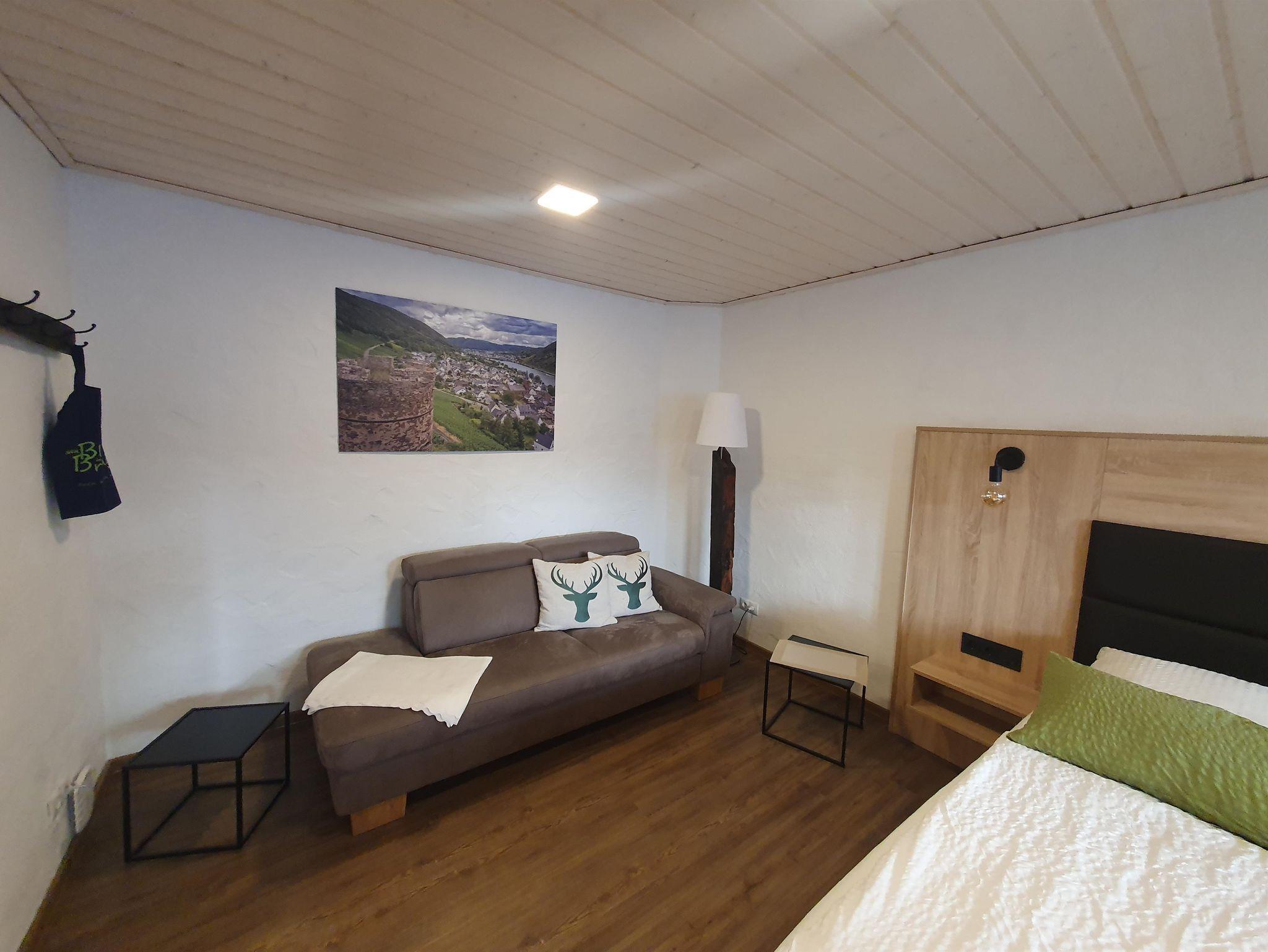 Unser Aufenthaltsraum verfügt über eine Küchenzeile, die ähnlich wie in einer Ferienwohnung ausgestattet ist (ohne Herd und Backofen) und zur Selbstversorgung bzw. Bereitung eines Frühstücks genutzt werden kann. Dort befindet sich neben einem Kaffeevollautomat, auch ein Wasser- u. Eierkocher und ein Toaster. Ein Kühlschrank mit gekühlten Getränken und für Ihre Vorräte steht ebenfalls zur Verfügung. Ihr benutztes Inventar kann dann bequem in die Spülmaschine eingeräumt werden. Allen Gästen steht zusätzlich eine Terrasse zur Verfügung. Im Hof befinden sich zwei Parkmöglichkeiten, weitere in 200 m Entfernung am Moselufer. Im Innenhof können auch Ihre Fahrräder abgestellt werden (kein abgeschlossener Bereich). Ein Schiffsanleger sowie die Bushaltestelle befinden sich in 200 m Entfernung. Zahlreiche Rad- und Wanderwege starten in unmittelbarer Nähe.
