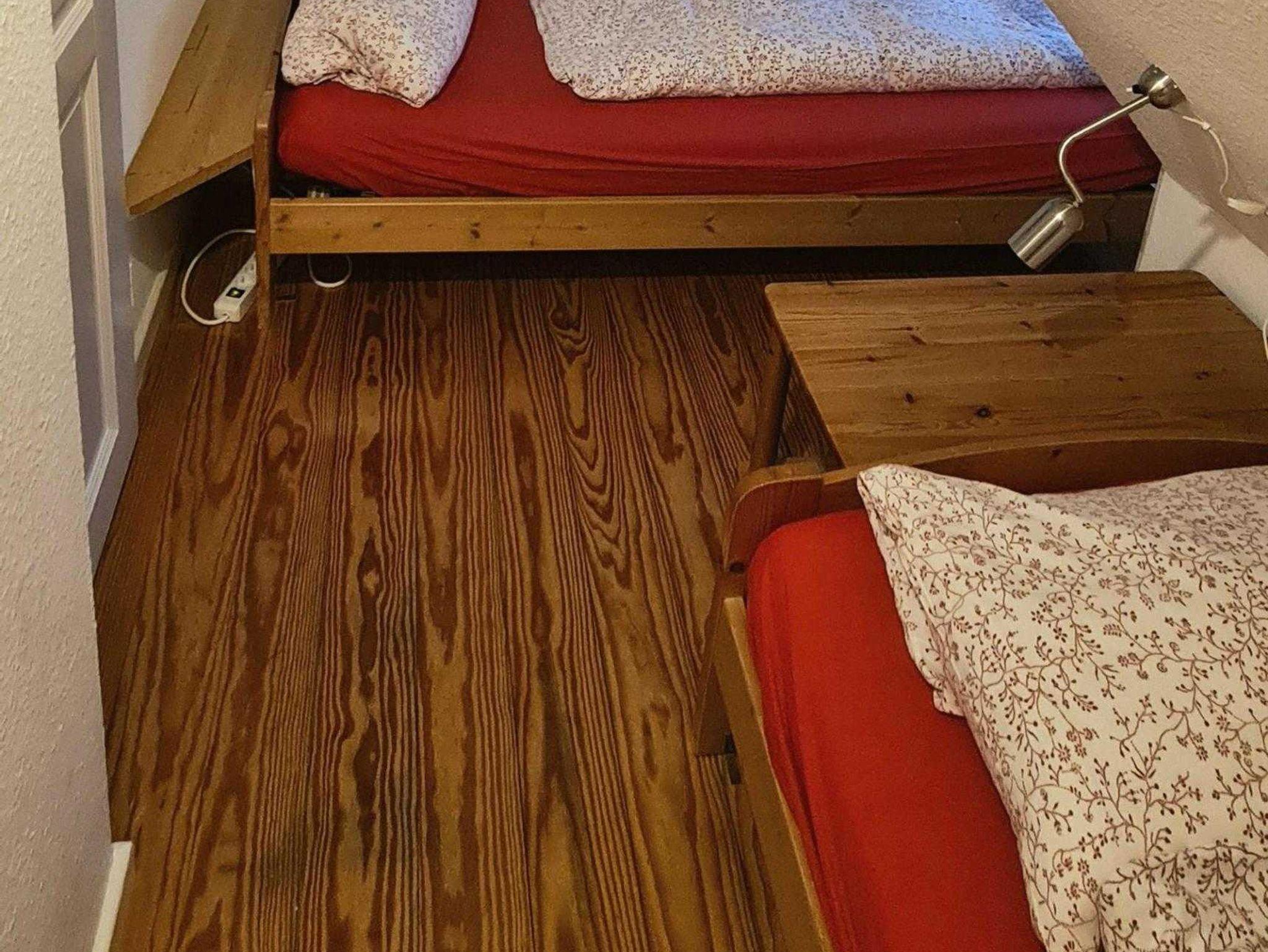 Raumaufteilung: 1 Schlafraum (1 Doppelbett), 1 Schlafraum (2 Einzelbetten), 1 Wohnraum, 1 Küchenzeile, 1 Badezimmer mit Dusche.