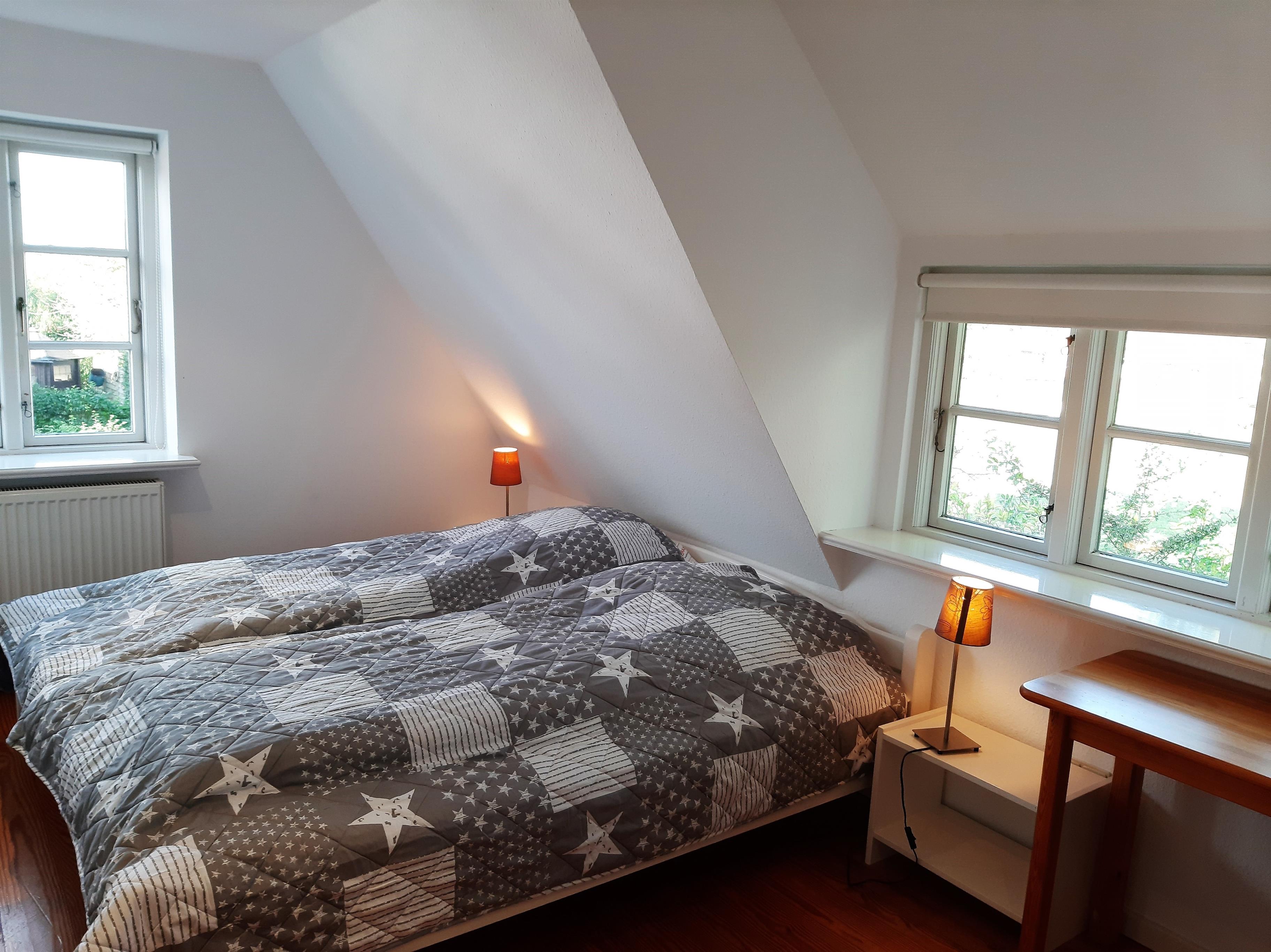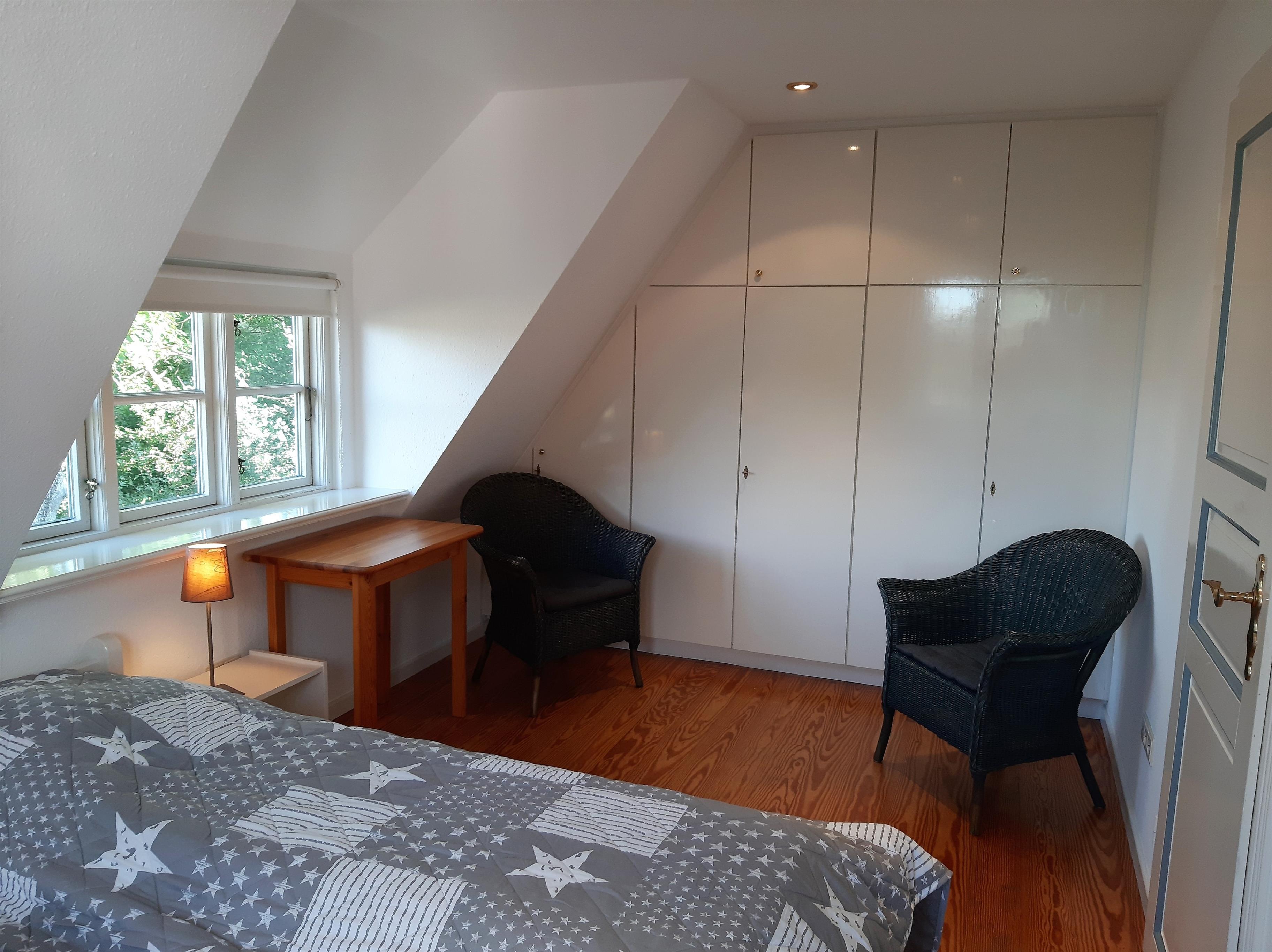 Im ersten Obergeschoss befindet sich das Hauptschlafzimmer mit einem Doppelbett (1,80 x 2,00 m) und einem geräumigen Einbaukleiderschrank. Ein Kinderbett kann problemlos im Schlafzimmer aufgestellt werden. Das angrenzende Kinderzimmer verfügt über zwei Einzelbetten (0,90 x 2,00 m). Das Duschbad liegt ebenfalls auf dieser Etage.