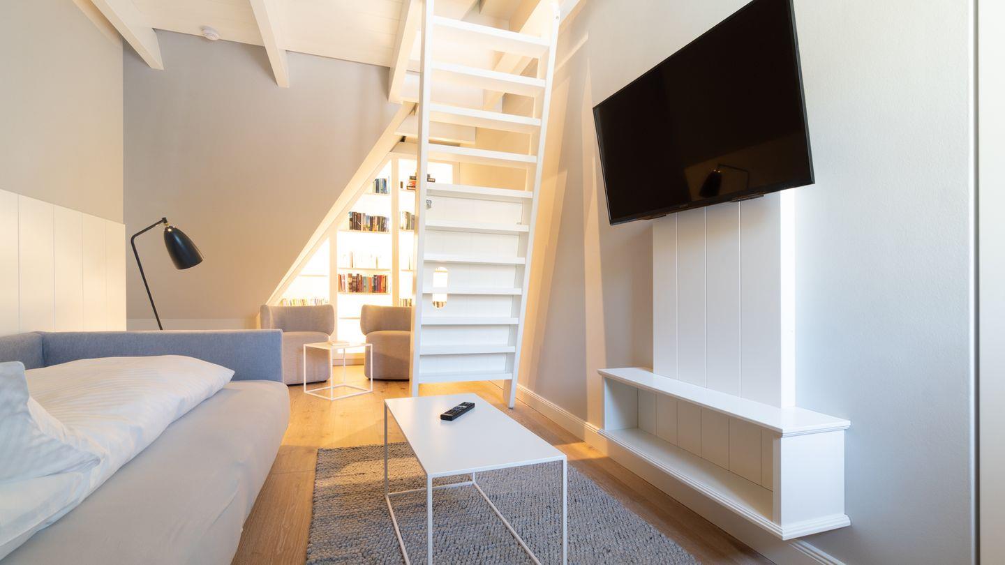 Im Obergeschoss sind ein weiteres Schlafzimmer, ein zweites Wohnzimmer mit einer Schlafmöglichkeit für eine Person und die zwei weiteren Bäder gelegen. Das Schlafzimmer ist mit einem Doppelbett ausgestattet und verfügt ebenfalls über ein Bad en Suite.