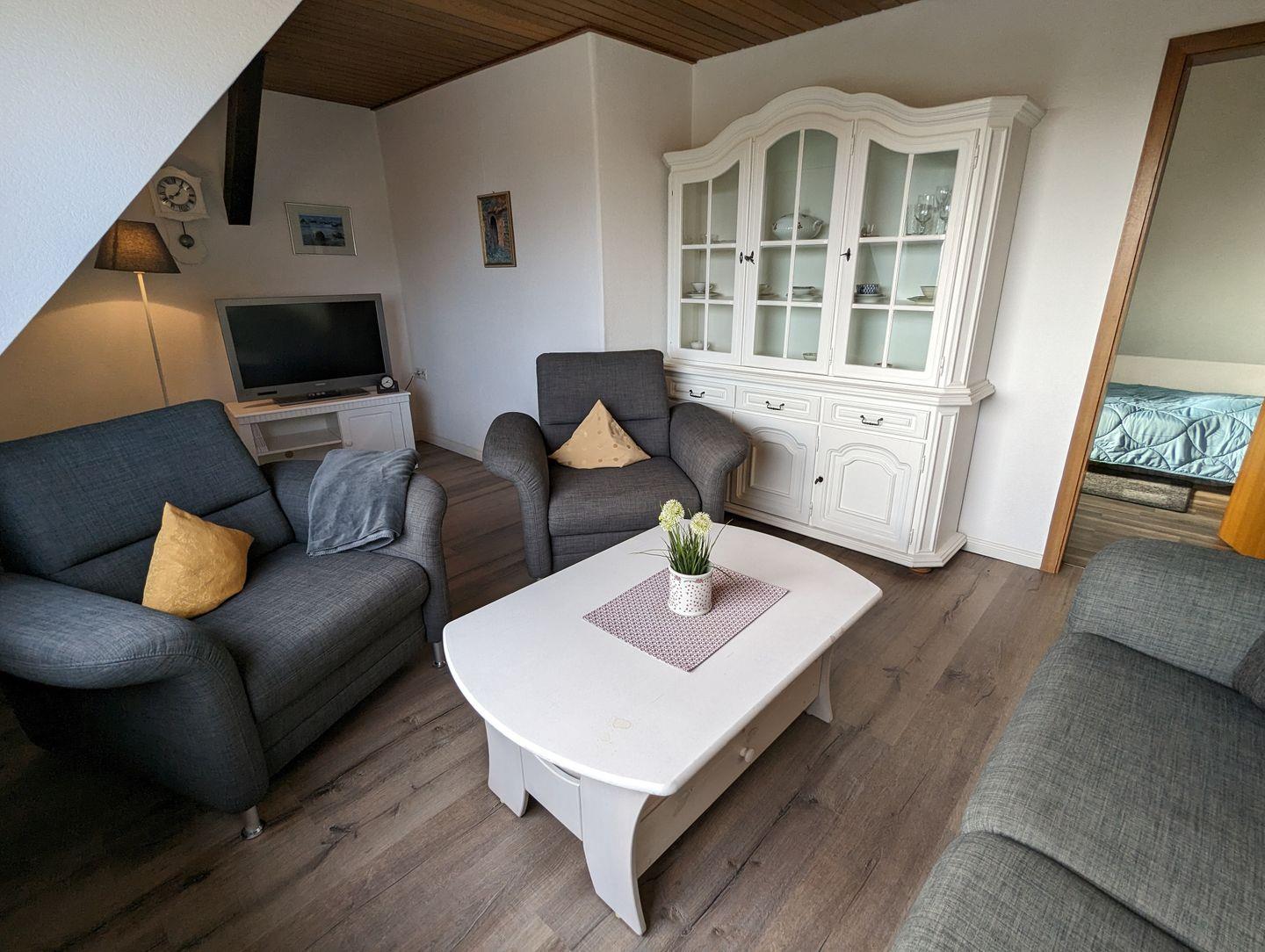 Diese Wohnung ist wie folgt aufgeteilt: WOHNBEREICH (ein Sofa, 2 Sessel, ein Couchtisch, Sat-TV, Radio, Internet, Radio, Bücher), Süd-Ost-Balkon mit Gartenmöbeln, Strandkorb und zwei Liegen, vollausgestattete KÜCHE MIT ESSBEREICH (u.a. Esstisch mit 2 Stühlen und einer Eckbank, Geschirrspüler, Mikrowelle, Backofen, Ceran-Kochfeld, Kühlschrank mit Gefrierfach, Kaffeemaschine, Toaster, Eierkocher, Besteck und Töpfe), SCHLAFZIMMER mit einem Doppelbett (180 x 200 cm) und einem Kleiderschrank, ein SCHLAFZIMMER mit zwei Einzelbetten (je 90 x 200 cm), Kleiderschrank und einem Schreibtisch, BADEZIMMER mit Dusche, WC, Fenster, Handtuchwärmer, Waschbecken, Spiegelschrank und Föhn sowie FLUR mit einer kleinen Garderobe. Haustiere und das Rauchen in der Wohnung sind nicht erlaubt.