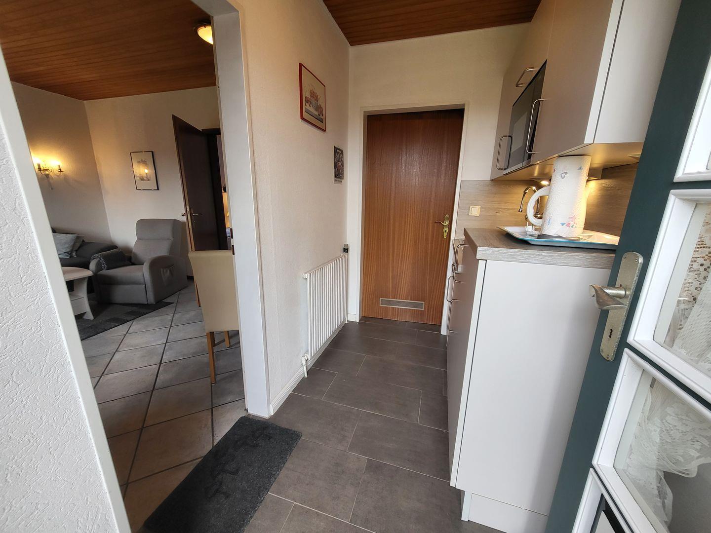 Diese Wohnung ist wie folgt aufgeteilt: WOHNBEREICH (ein Sofa, ein Sessel, ein Couchtisch, ein Esstisch mit zwei Stühlen, Sat-TV, Radio, kostenloses Internet, Bücher), Süd-West-Terrasse, vollausgestattete, moderne KÜCHENZEILE (u.a. Geschirrspüler, Mikrowelle, 2-Platten-Ceranfeld, Kühlschrank mit Gefrierfach, Kaffeemaschine, Toaster, Eierkocher, Besteck und Töpfe), SCHLAFZIMMER mit einem Doppelbett (180 x 200 cm) und einem Kleiderschrank, BADEZIMMER mit Dusche, WC, Handtuchwärmer, Waschbecken, Spiegelschrank und Föhn, sowie FLUR mit einer kleinen Garderobe. Zur Wohnung gehört ein Parkplatz am Haus. Ihre Fahrräder können Sie im Garten direkt vor der Wohnungstür abstellen. Haustiere und das Rauchen in der Wohnung sind nicht erlaubt.