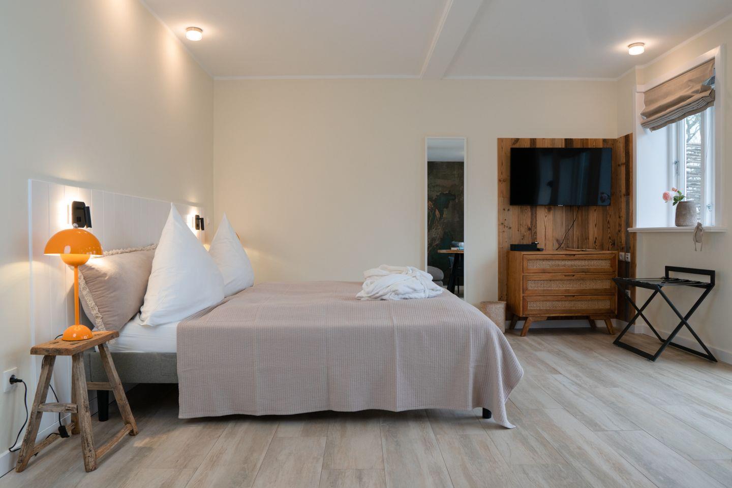Exklusives Familienzimmer mit eigener Terrasse, separatem Kinderzimmer, gemeinschaftlich genutztem großen Spielplatz und Fass-Sauna.