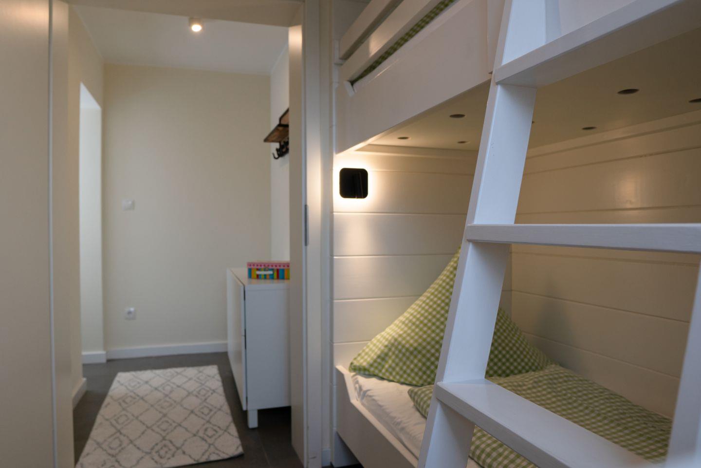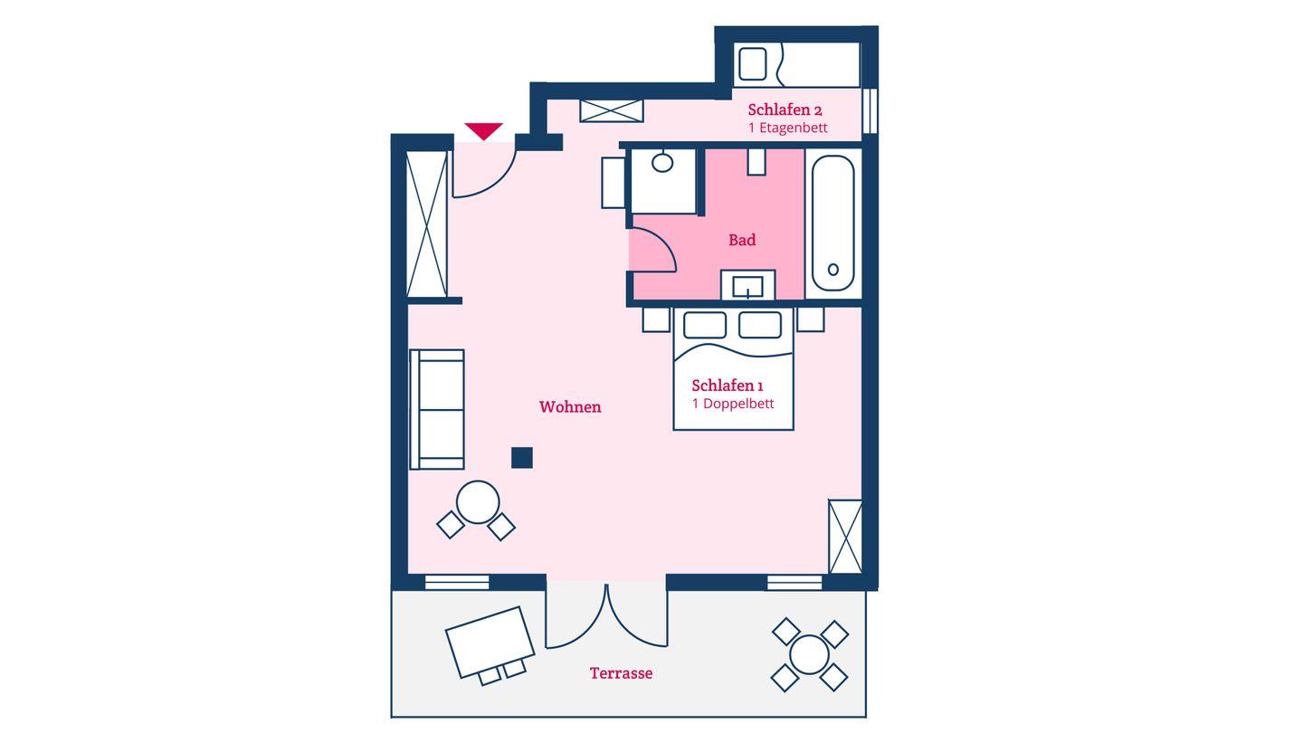 Das Familienzimmer 3 ist in ein Wohn-Schlafzimmer mit einem Doppelbett, ein weiteres Schlafzimmer mit einem Stockbett, sowie ein Vollbad unterteilt und bietet somit komfortabel Platz für bis zu 4 Personen zuzüglich einer Kleinkinderaufbettung. Zudem steht Ihnen eine eigene Terrasse zur Verfügung.