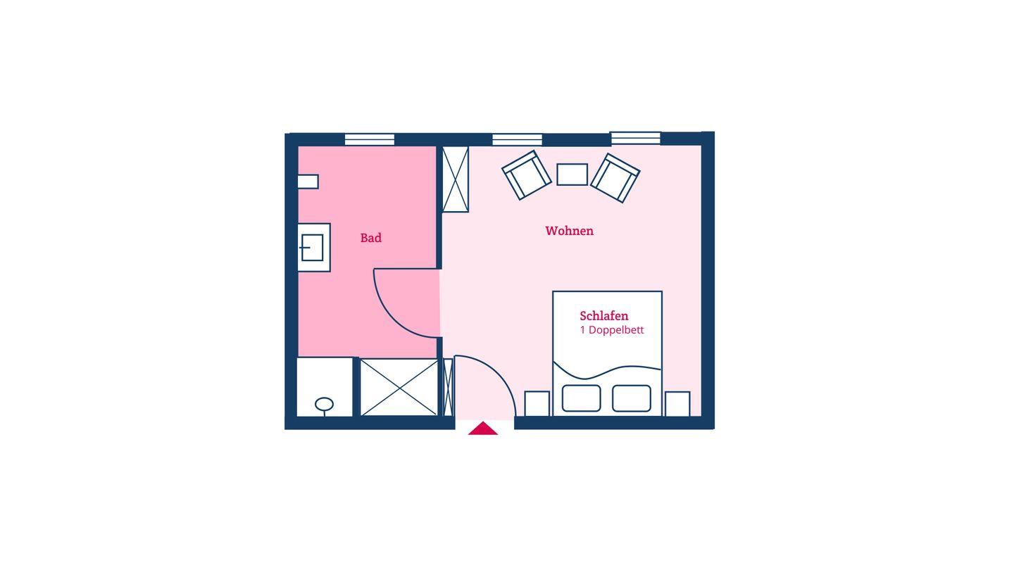 Das Doppelzimmer 8 ist in ein Wohn-Schlafzimmer und ein Duschbad unterteilt und bietet somit komfortabel Platz für bis zu 2 Personen zuzüglich einer Kleinkinderaufbettung.