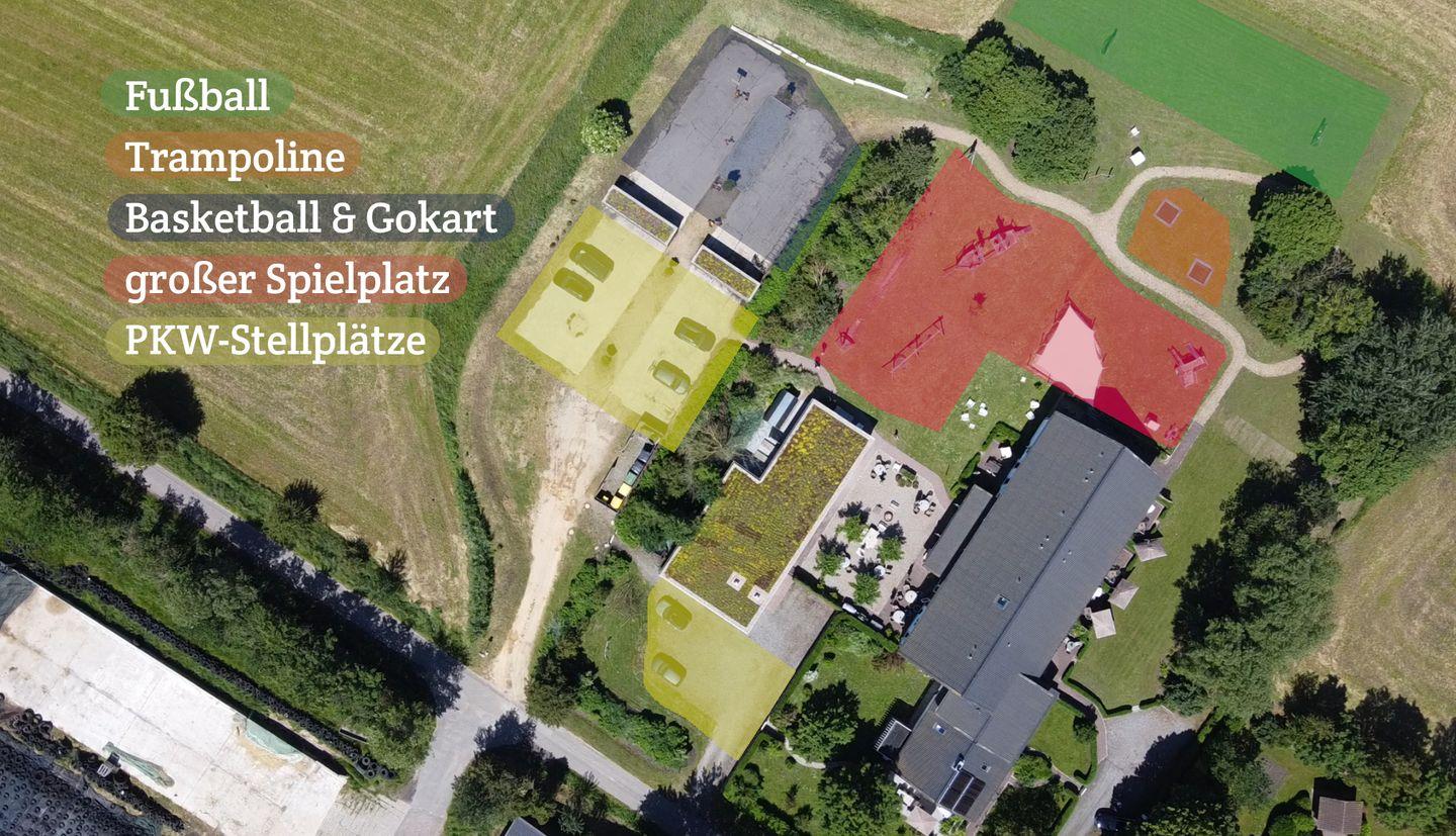 Der groß angelegte Spielplatz auf dem Grundstück ist eine Wohlfühloase für Ihre Kinder - von Seilbahn und Schaukel über ein Basketballfeld bis Trampolin gibt es viele Möglichkeiten zum Austoben. Der Spielplatz steht ausschließlich den Gästen der Ferienanlage Landliebe zur Verfügung. Bei schlechtem Wetter erheitern Tischtennis und Kicker sowie eine "Ecke" zum Spielen und Toben in der Spielscheune die Gemüter. In einem vom restlichen Garten abgetrennten Bereich lädt die Fass-Sauna mit Ruheraum und Außendusche zum Relaxen in Strand-Ambiente ein - Erholung pur! Der große Parkplatz mit E-Auto-Ladestation auf dem Grundstück oder der kostenfreie Shuttle vom Hafen zum Hotel (mit Voranmeldung) runden das Angebot ab.