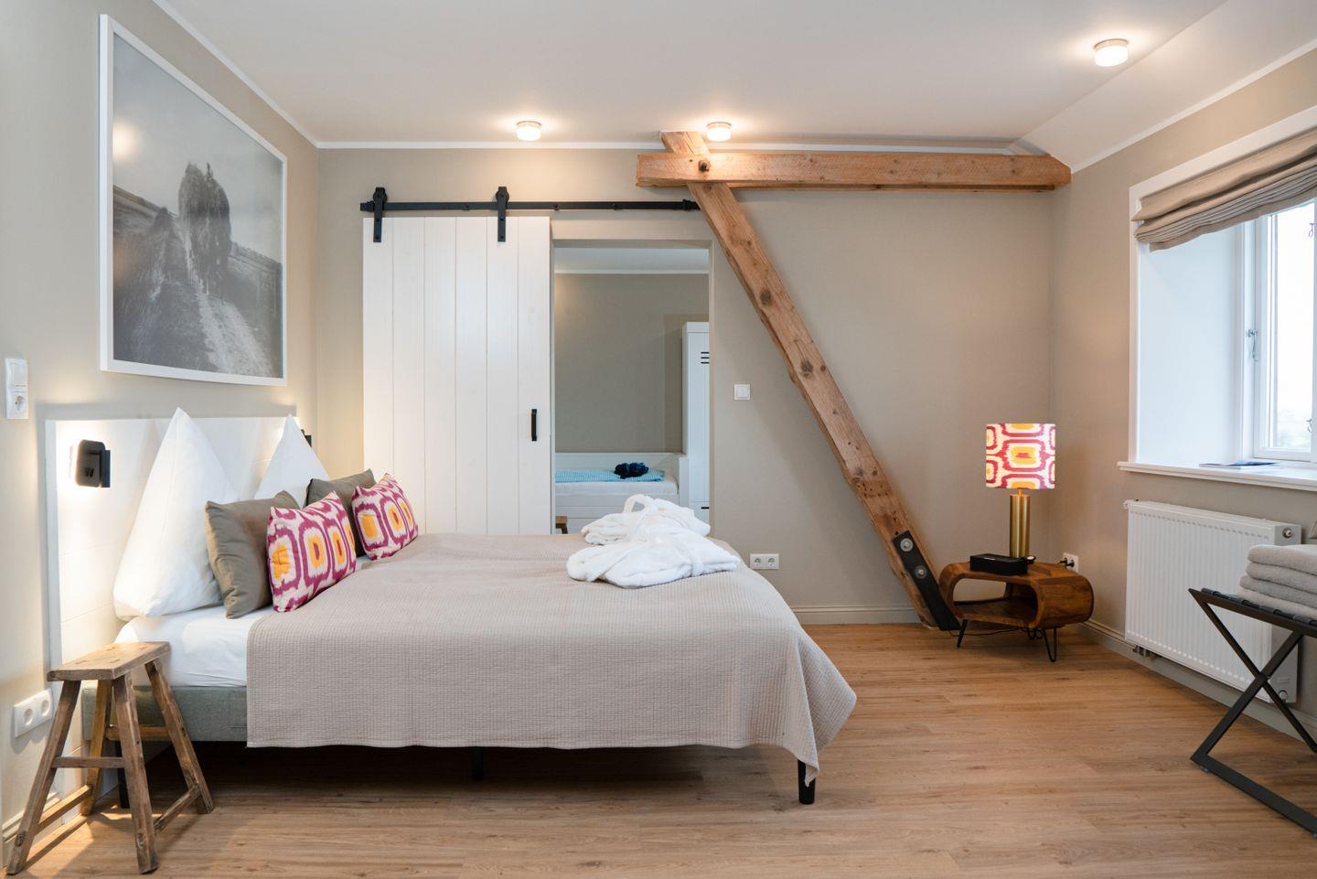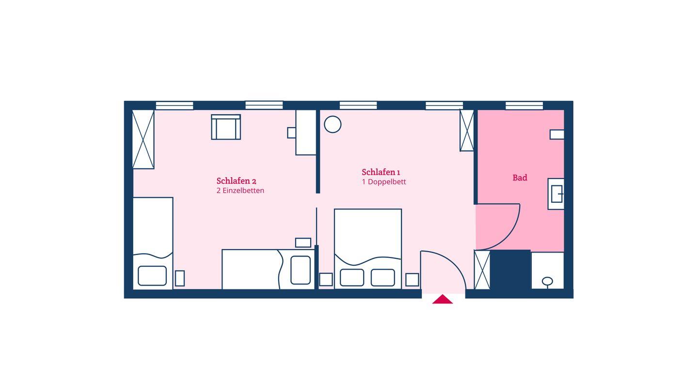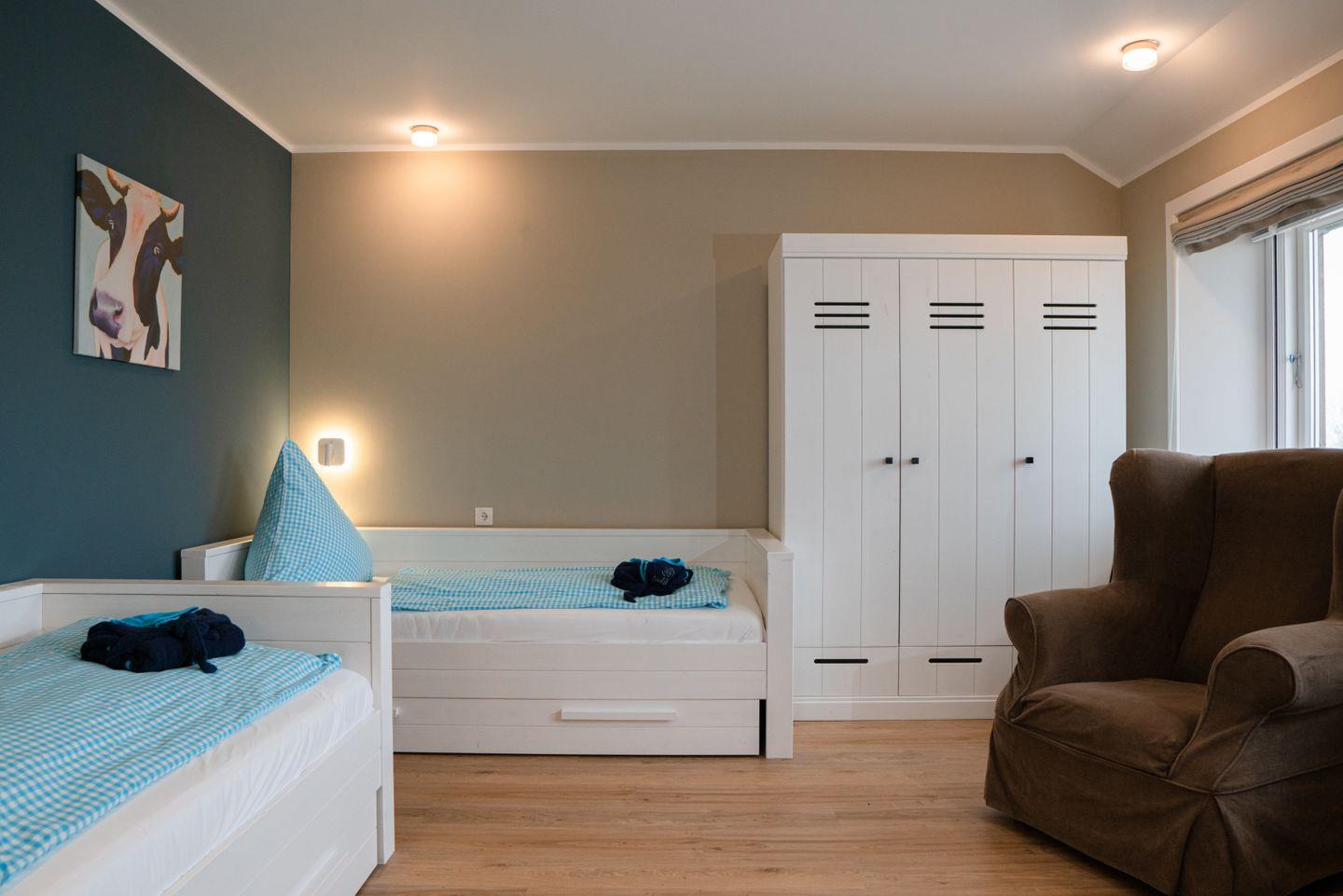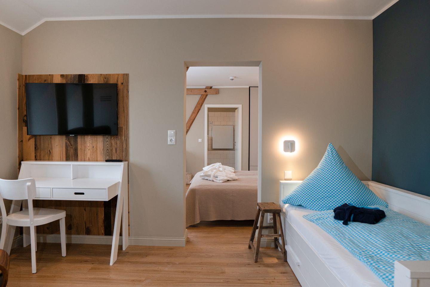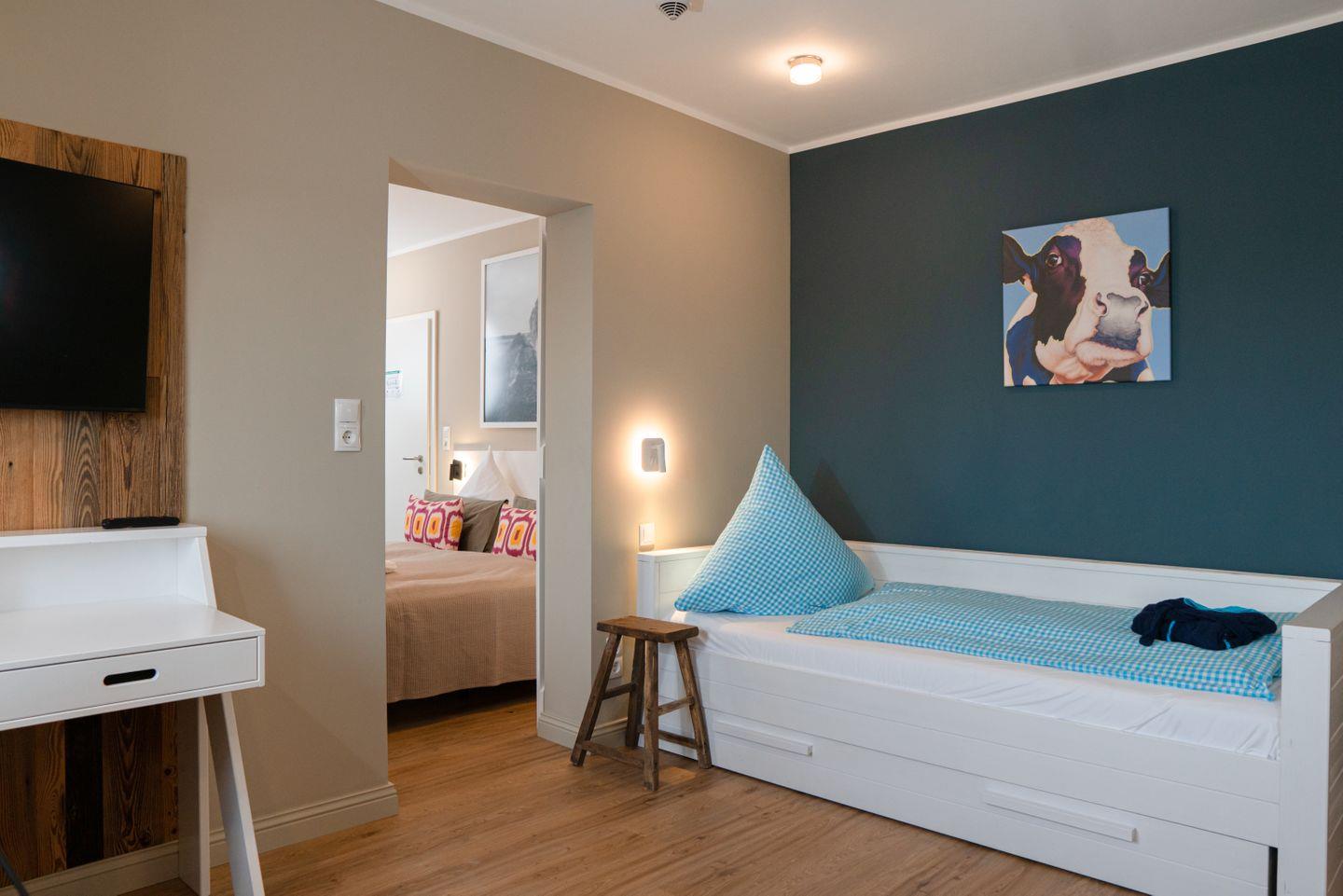 Die Familiensuite 10 ist in ein Wohn-Schlafzimmer mit einem Doppelbett, ein Schlafzimmer mit zwei Einzelbetten und ein Duschbad unterteilt und bietet somit komfortabel Platz für bis zu 4 Personen zuzüglich einer Kleinkinderaufbettung.