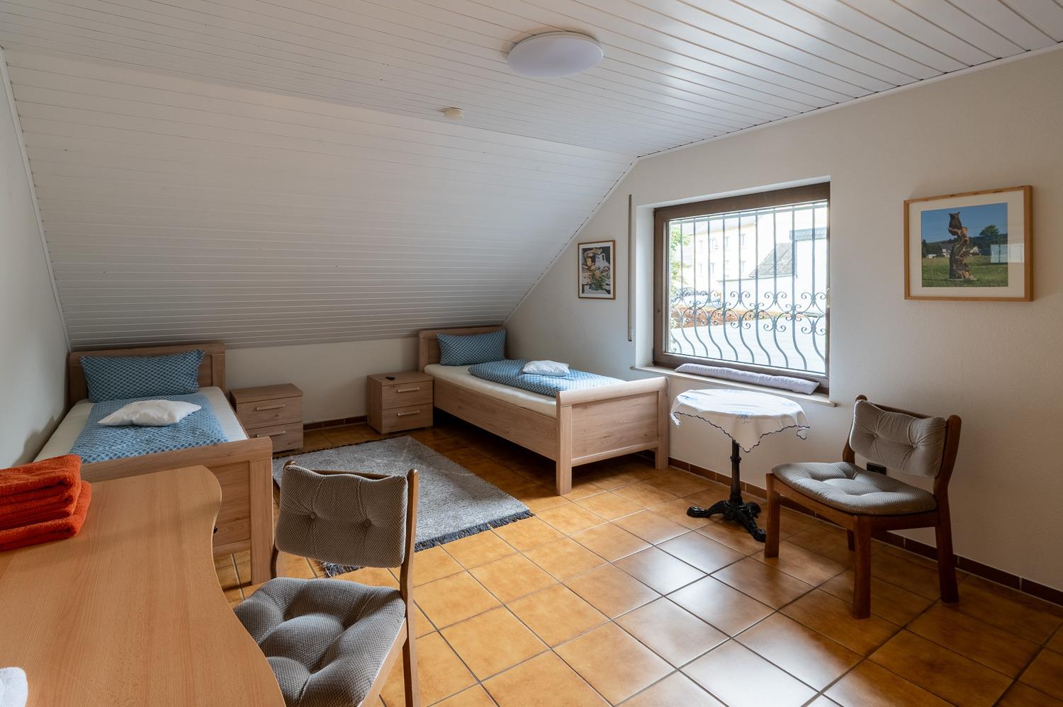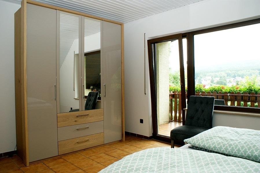 Im Obergeschoss befinden sich zwei Schlafzimmer mit Doppelbetten und ein Jugendzimmer mit einem Schrankbett für zwei Kinder. Wenn die Betten hochgeklappt sind, entsteht eine offene Fläche, die sich hervorragend zum Spielen eignet. Bei Bedarf und auf Anfrage kann dieses Zimmer auch mit zwei Betten für Erwachsene ausgestattet werden. Von den beiden Schlafzimmern haben Sie Zugang zu einem Balkon, der einen tollen Ausblick über Allenbach und den Nationalpark Hunsrück-Hochwald bietet. Gegenüber den Schlafzimmern befindet sich ein Badezimmer mit Waschbecken, Dusche, Toilette und Badewanne.
