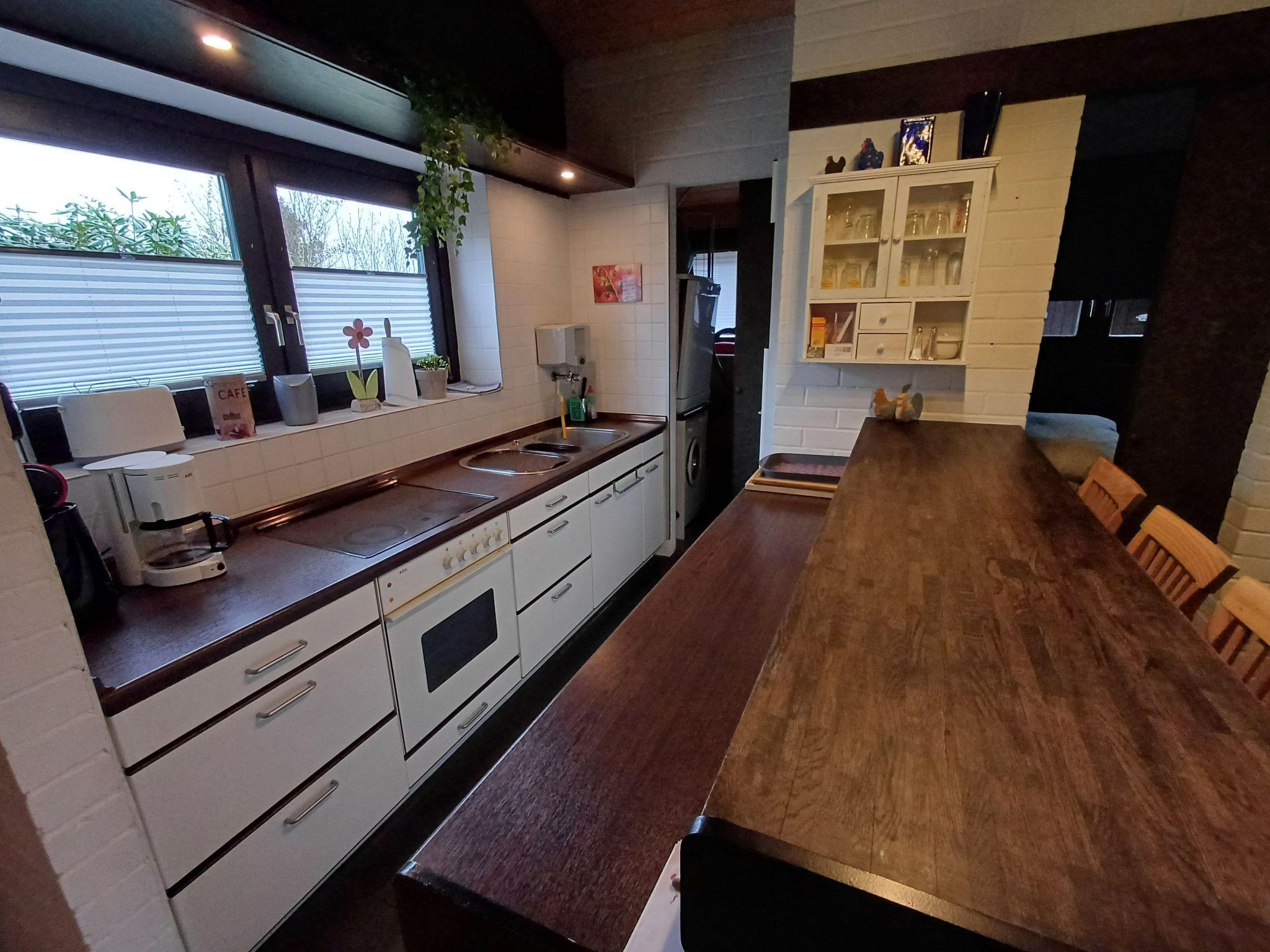 Inside, you will find a bright and friendly living atmosphere with an inviting view of the garden. The central living area is enhanced by a warming wood-burning stove, which creates a cosy atmosphere, especially in the winter months. A perfectly equipped fitted kitchen, separated from the dining area only by a counter, offers plenty of space for communal meals at the table for up to 6 people. The accommodation is further divided into a separate toilet and a shower, each with a washbasin, as well as three cosy bedrooms. 1 room has a comfortable 2 x 1.6 metre bed with 2 single mattresses and plenty of storage space and 2 rooms each have a 1.9 x 1.4 metre bed for a carefree stay.