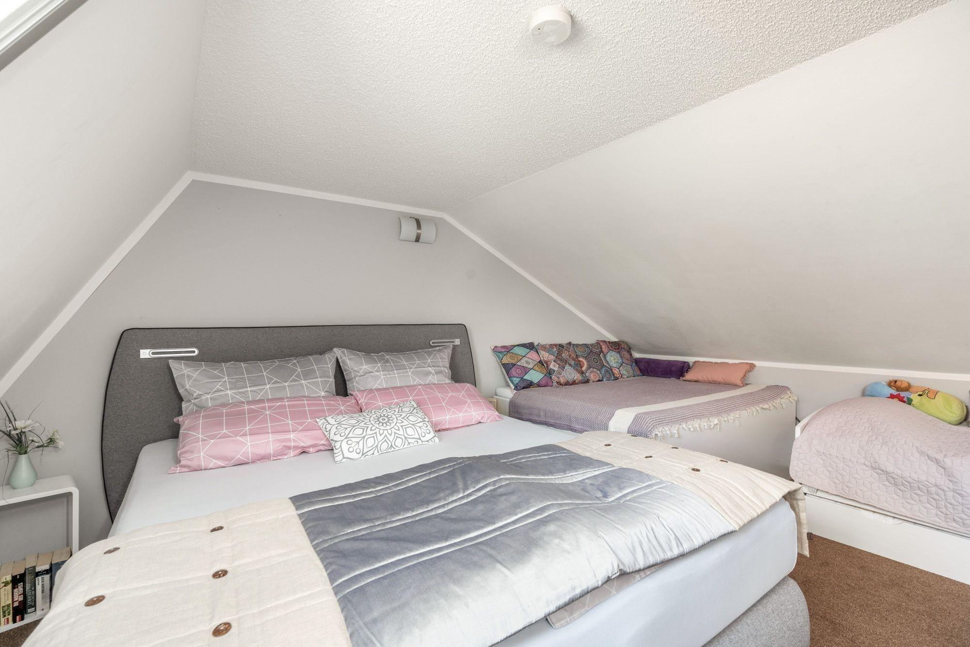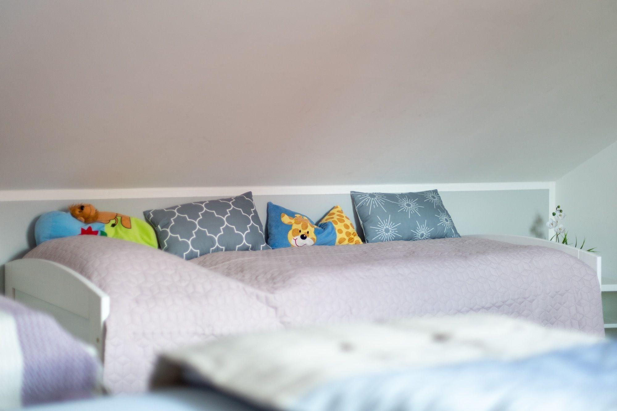 Das Ferienhaus bietet grundsätzlich Platz für 6 Personen. Dafür ist im Obergeschoss ein wunderschönes Schlafzimmer mit Doppelbett und einem separaten Ausziehbett für 2 Kinder entstanden. Damit Sie oder Ihre Kinder hier auch ggf. einen erholsamen Mittagsschlaf halten können, wurde auch an ein zusätzliches Fensterrollo gedacht.