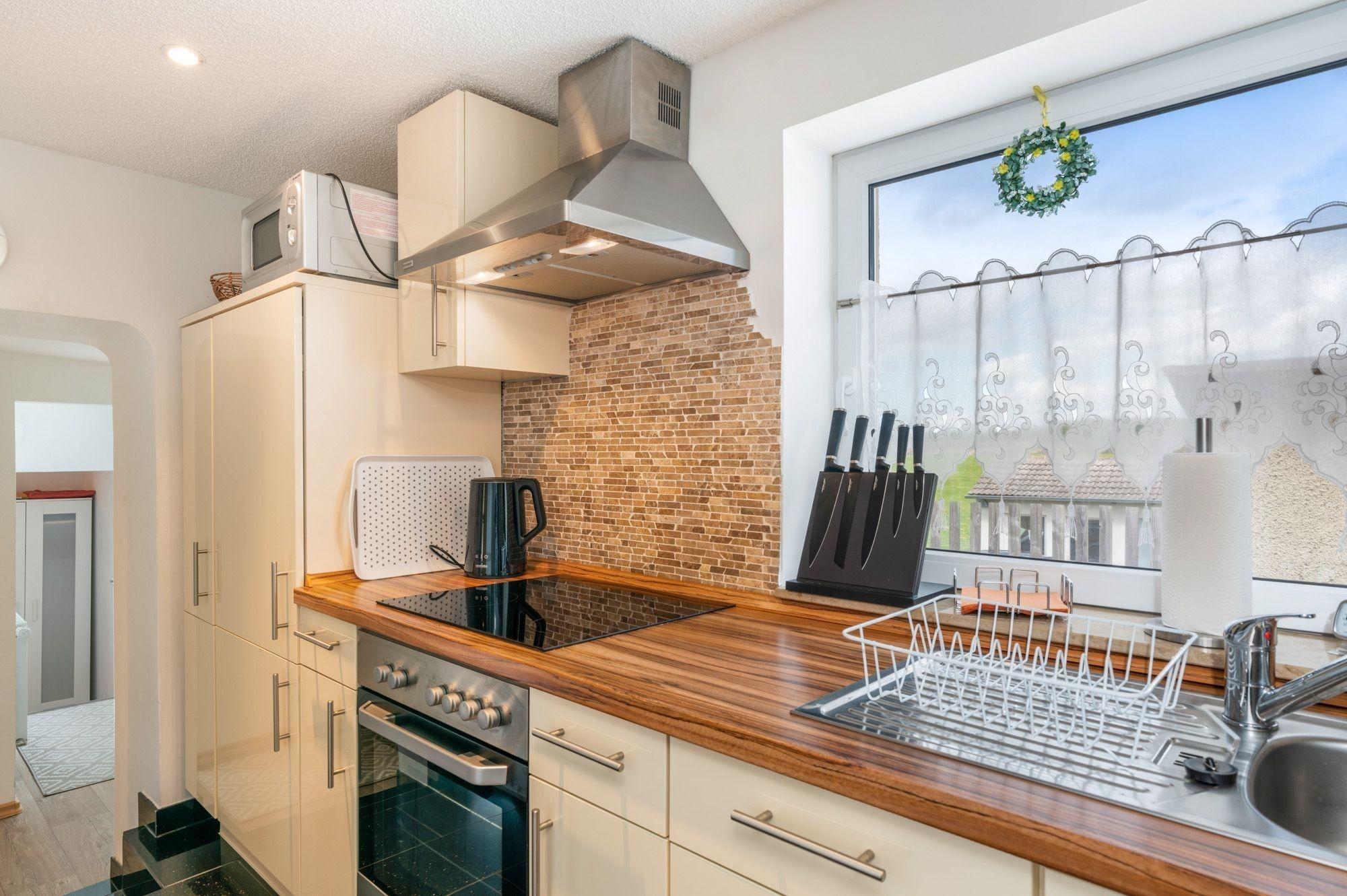 Die Küche befindet sich im vorderen Teil des Hauses und besteht aus einer vollständigen Küchenzeile inklusive Kühlschrank, Gefrierschrank, Dunstabzug, Ceranfeld, Backofen und den üblichen Zusatzgeräten.