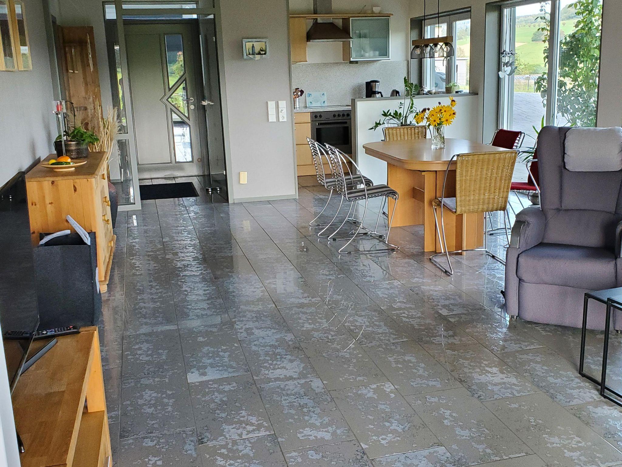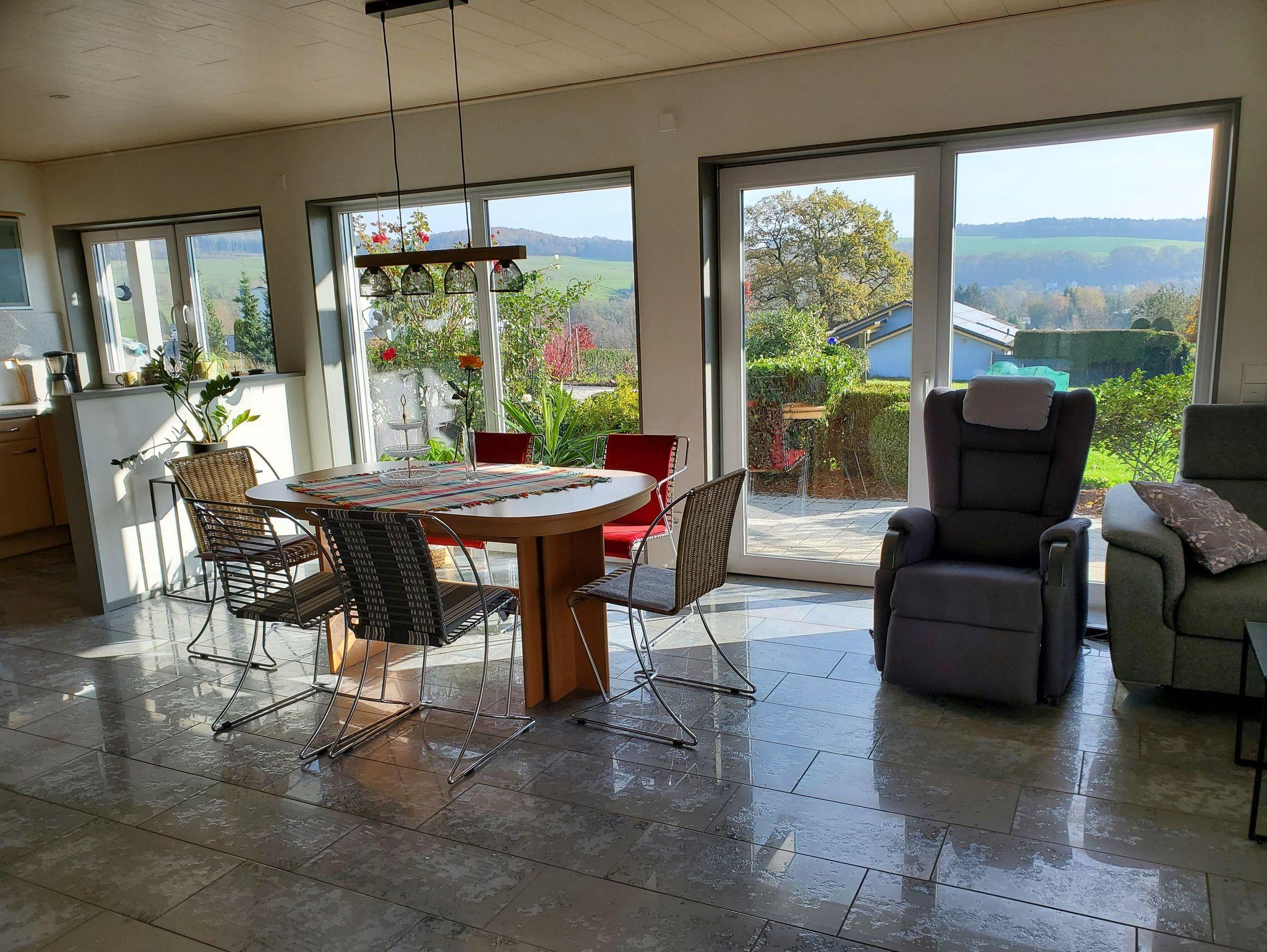 - Wohn-Esszimmer mit Ausziehtisch, 6 Stühlen, 1 Tripp Trapp Stuhl, 1 Hochstuhl