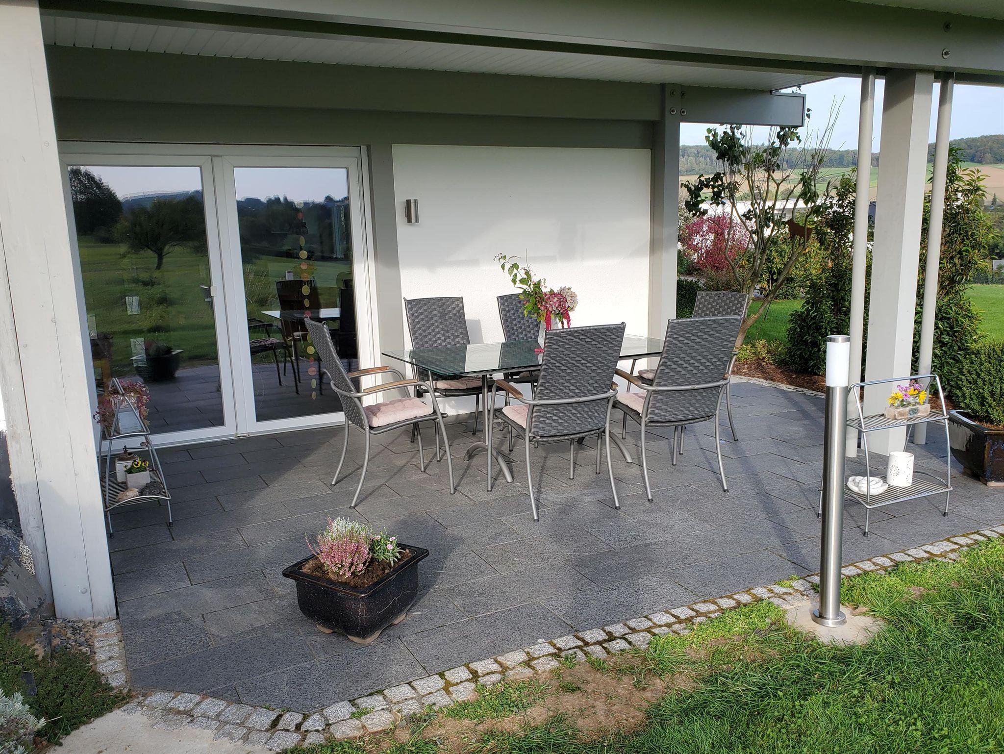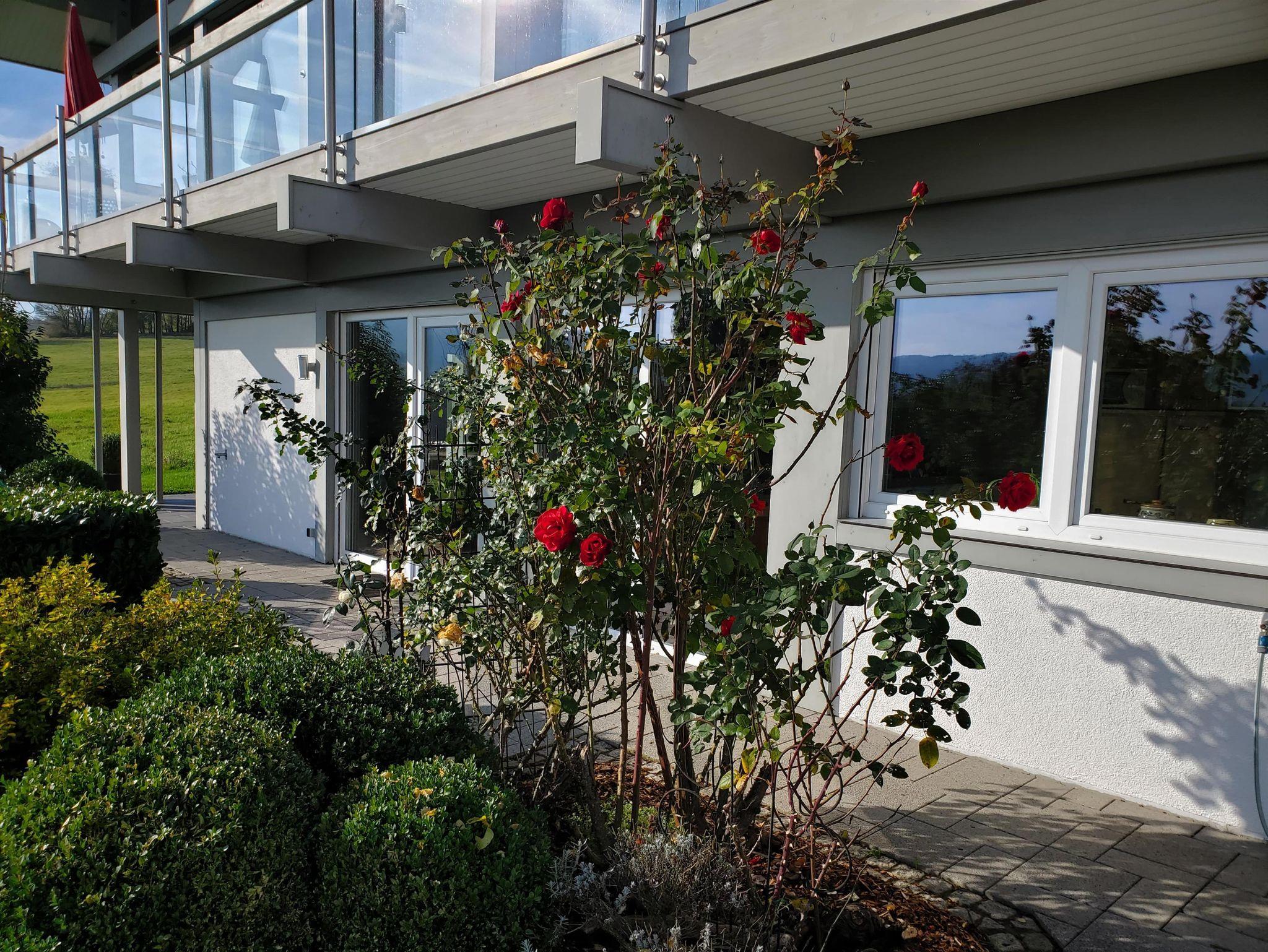 Eine nach Süden ausgerichtete überdachte Terrasse inkl. schönem Elektrogrill ist ganzjährig nutzbar und wird durch einen Windfang vor Regen u. Wind geschützt.