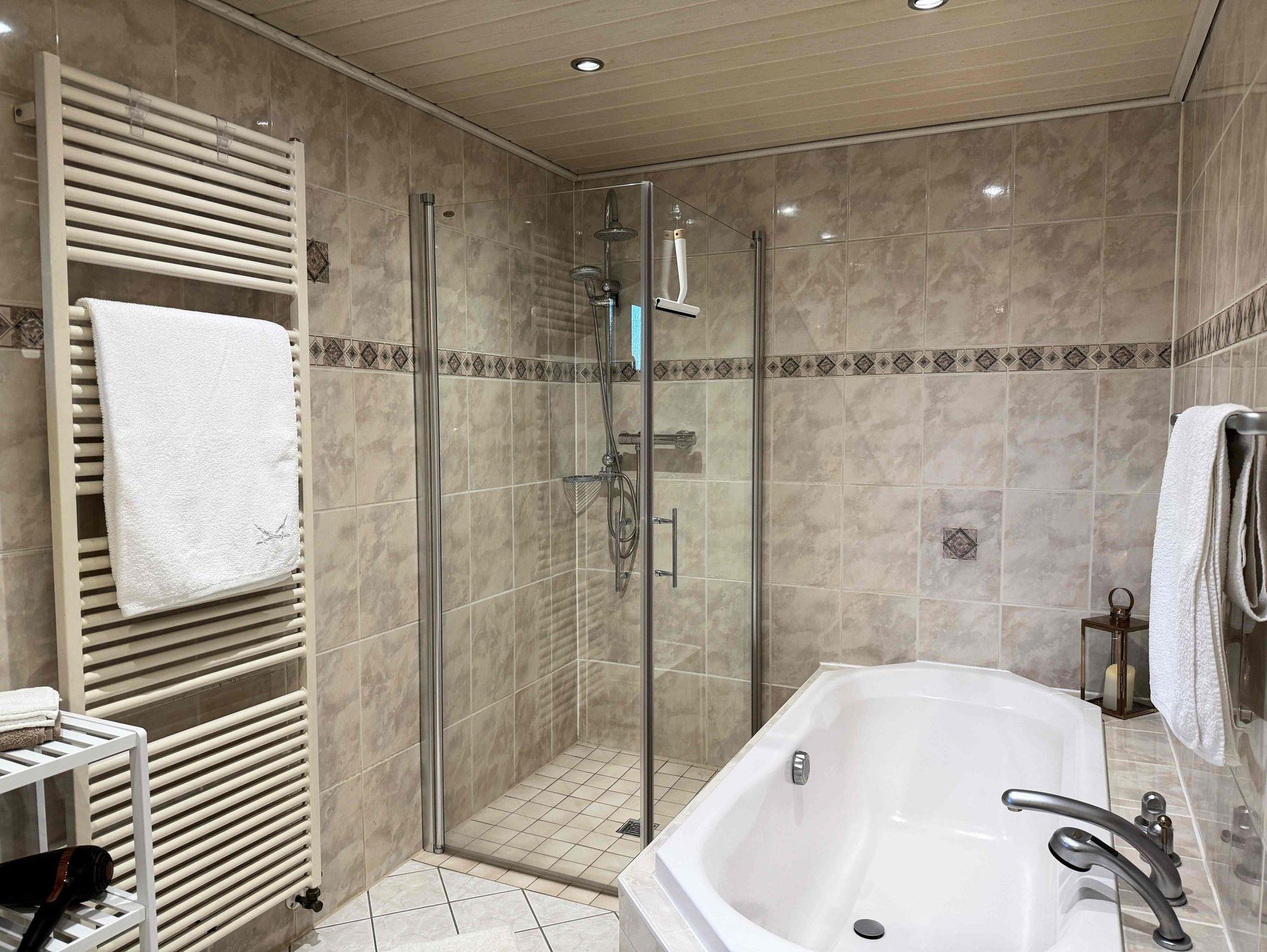 Die ca. 75?m² große, stilvoll eingerichtete Ferienwohnung bietet Platz für bis zu fünf Personen und verbindet modernen Komfort mit einem gemütlichen Landhausflair. Ein Schlafzimmer mit Kingsize-Doppelbetten, zwei Schlafsofas im Wohnzimmer sowie ein Babybett bzw. ein Beistellbett bieten flexible Schlafmöglichkeiten. Das Badezimmer ist mit einer Badewanne, einer barrierefreien Dusche, Pflegeprodukten, Föhn und frischen Handtüchern ausgestattet. In der voll ausgestatteten Küche finden Sie alles, was Sie zum Kochen benötigen: Herd, Backofen, Kühlschrank, Gefrierschrank, Geschirrspüler, Kaffeemaschine, Mikrowelle, Wasserkocher, Toaster, Kochutensilien sowie eine Grundausstattung an Gewürzen. Der gemütliche Essbereich lädt zu gemeinsamen Mahlzeiten ein, während der Wintergarten einen herrlichen Platz für das Frühstück bei Sonnenaufgang bietet. Für Unterhaltung sorgen WLAN, Fernseher, ein Soundsystem, Bücher und Brettspiele. Auch an Familien wurde gedacht: Hochstuhl, Babybett, extra Kissen und Decken sowie abdunkelbare Fenster sind vorhanden. Sicherheitsmerkmale wie Rauchmelder, Feuerlöscher und ein Erste-Hilfe-Set sorgen für ein sicheres Gefühl. Der Check-in ist flexibel per Schlüsselbox möglich, wobei wir unsere Gäste nach Möglichkeit gern persönlich begrüßen.