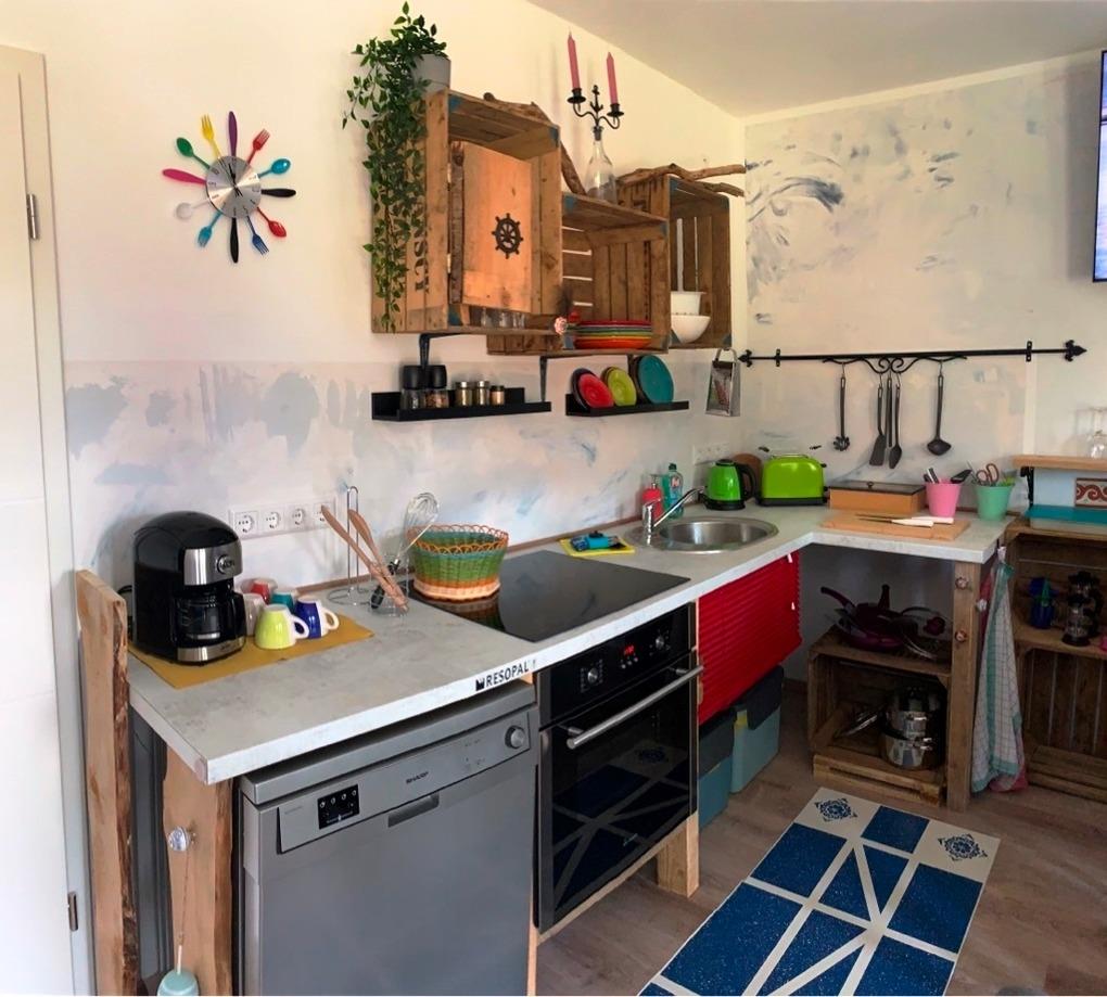 Die Küche ist klein, aber fein. Ein Induktionsherd mit Backofen, einen Geschirrspüler und einen großen, geräumigen Kühlschrank mit Gefrierfach, Kaffeemaschine, Toaster, sowie Wasserkocher runden die Küche ab.