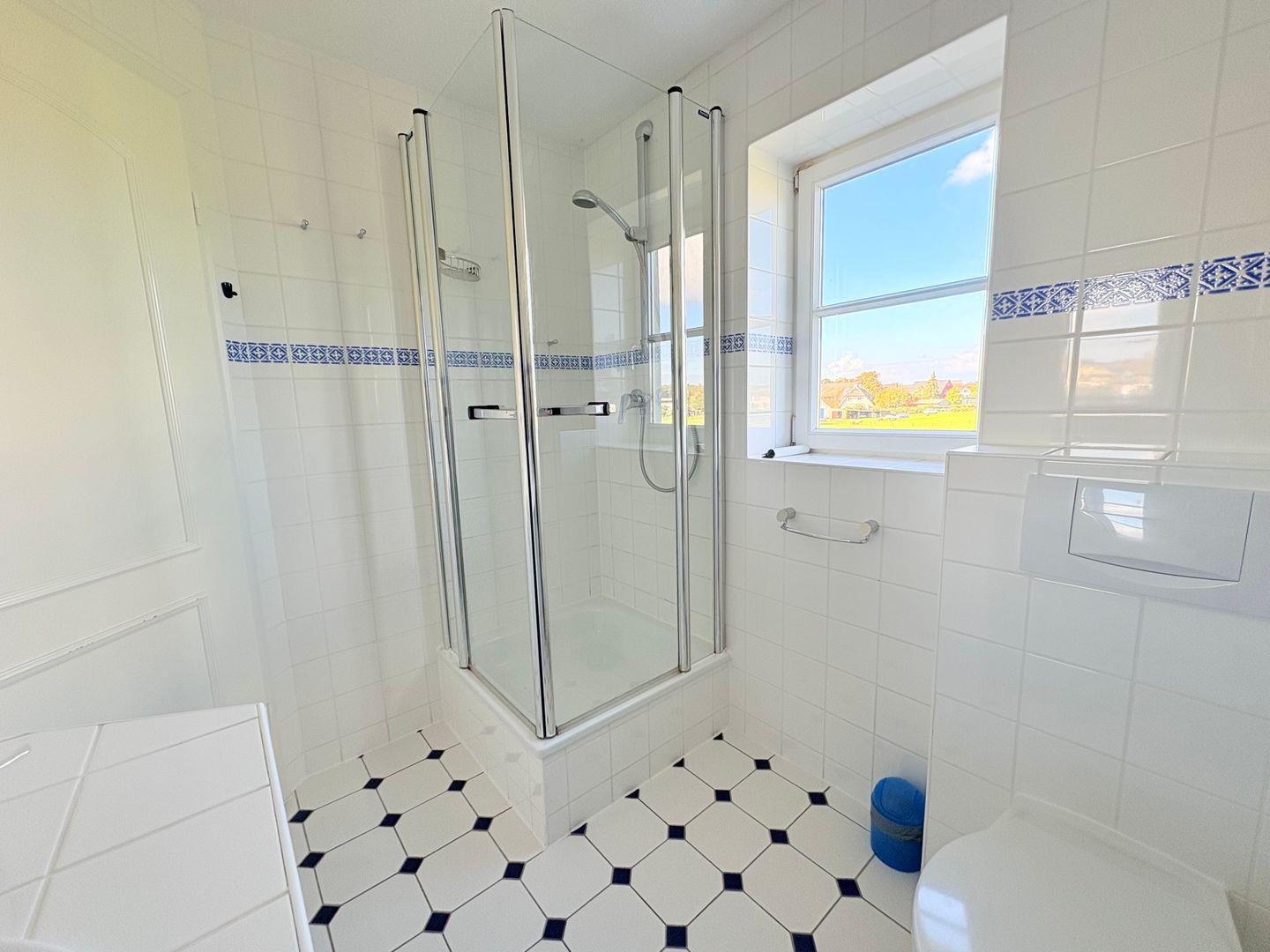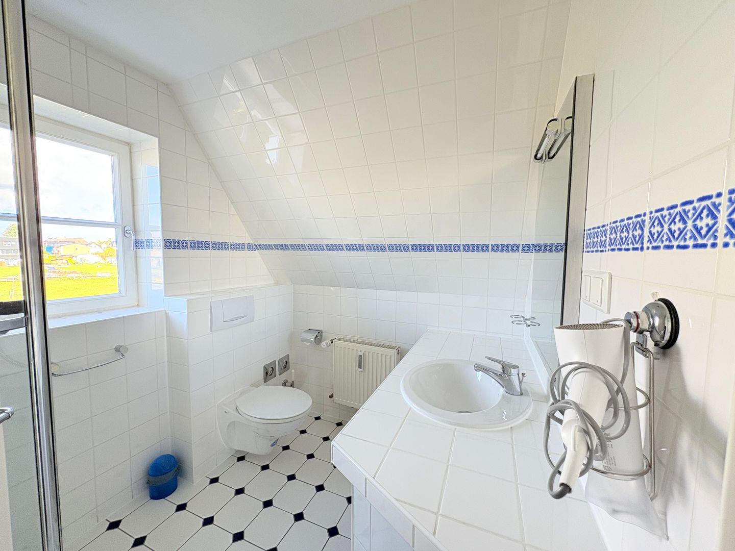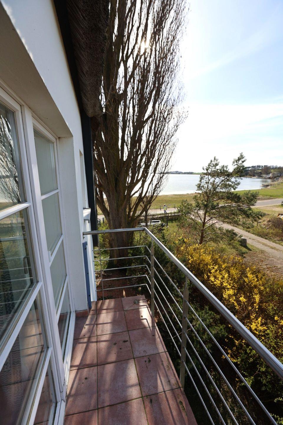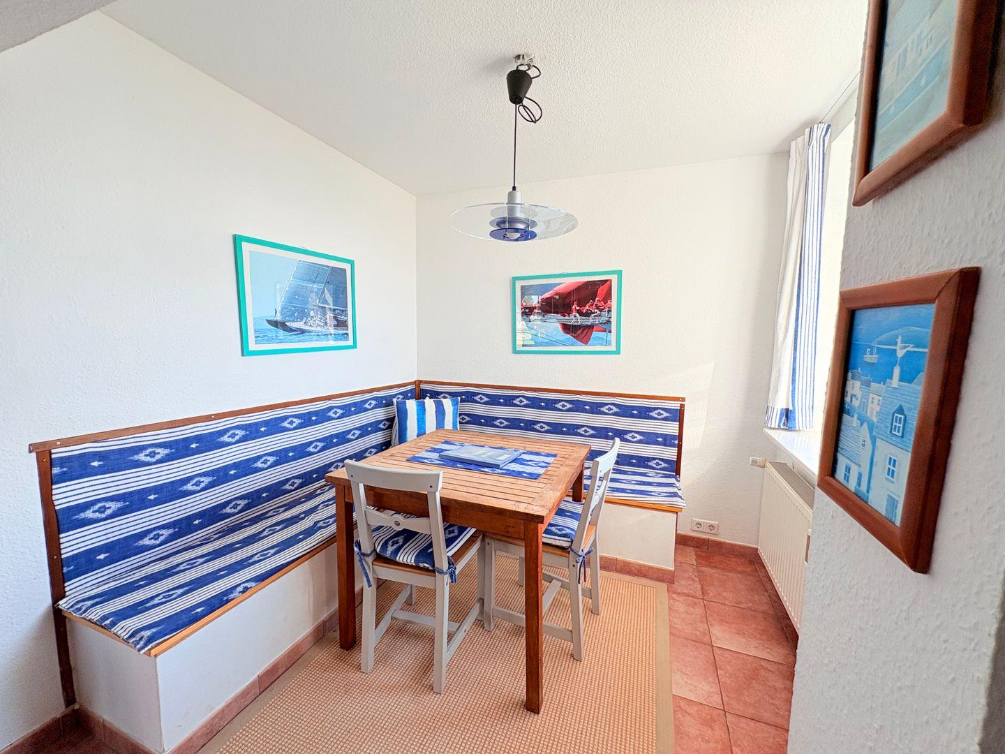 Selbstverständlich bietet auch das Apartment Drachen, selbst im süßen, maritimen blau-weiß gestaltet, einen wunderbaren Blick auf Wasser.