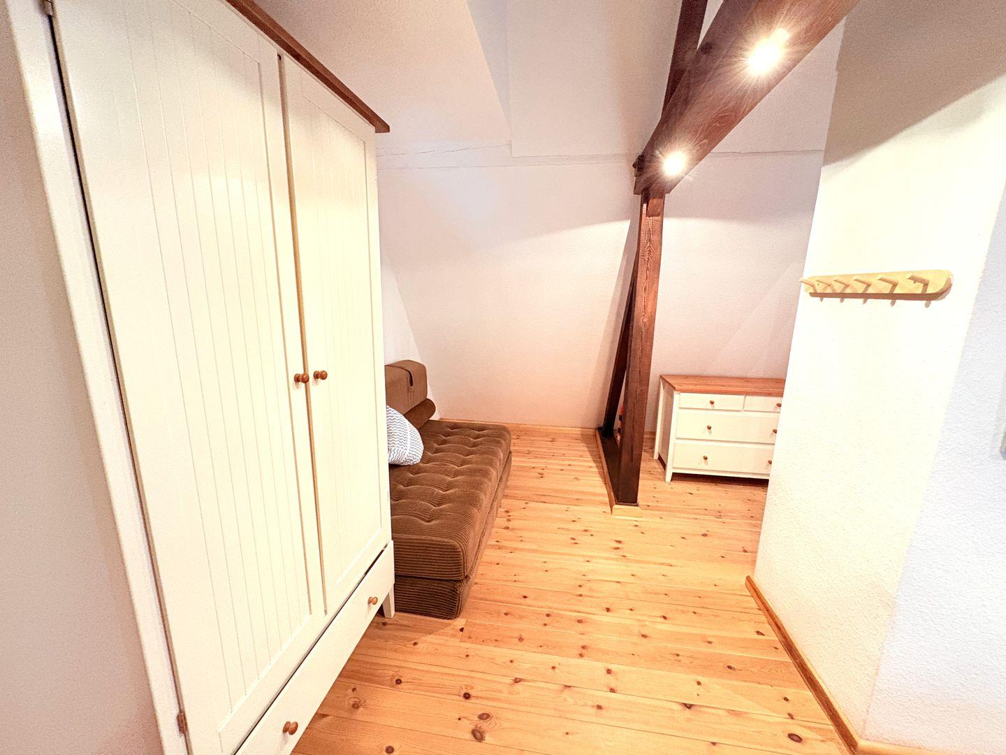 Ein gemütliches Schlafzimmer für zwei Personen liegt ebenfalls auf der ersten Etage, sowie das Badezimmer mit Dusche & WC. Eine Wendeltreppe führt nach oben zu einem großzügigen Wohn- und Schlafraum für weitere drei Personen. Schräge Wände, Dachbalken und eine weitere Sitzecke geben der oberen Etage eine sehr besondere Atmosphäre.