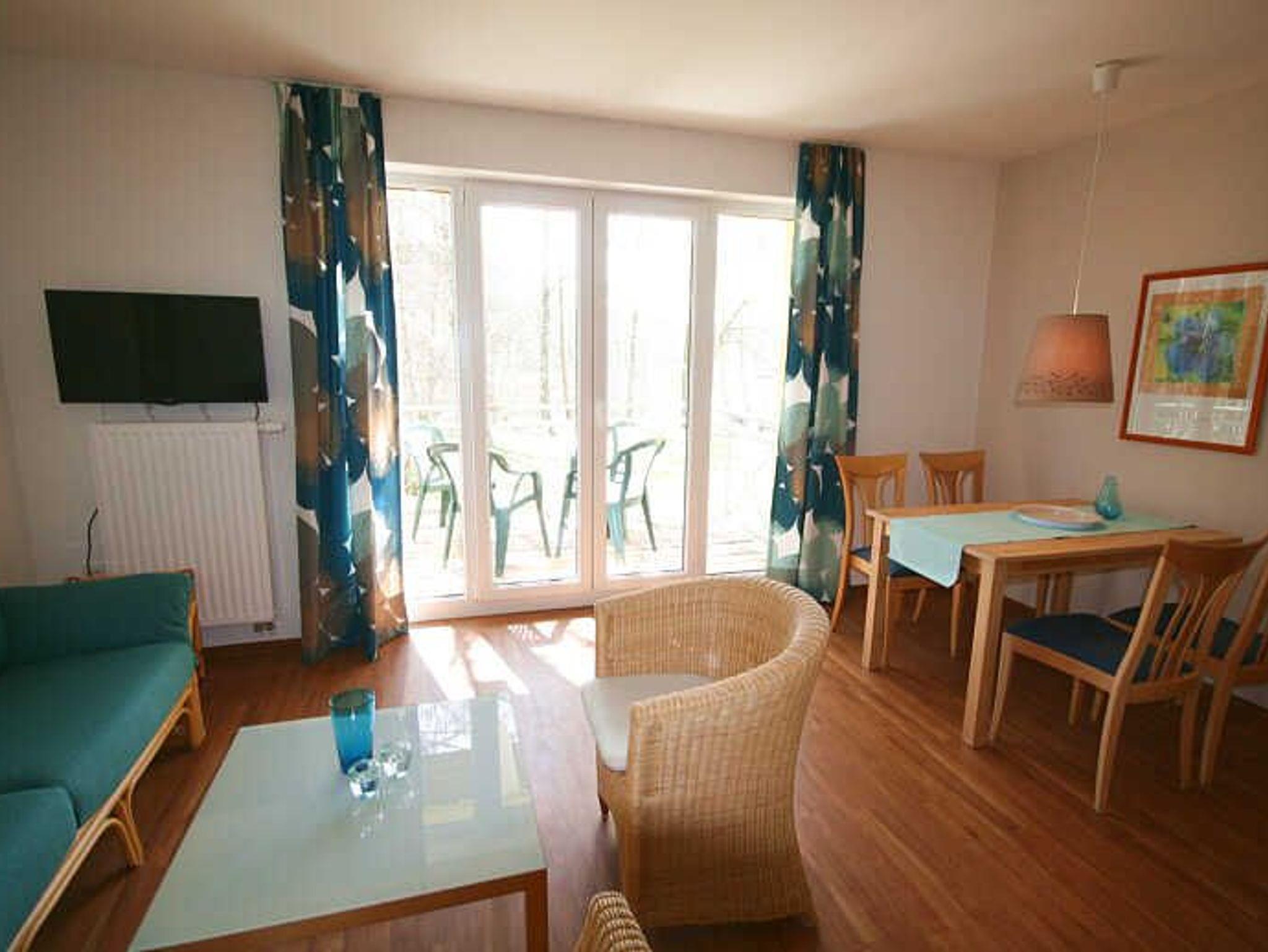 Zur technischen Ausstattung des Wohnzimmers gehören ein Fernseher, Radio und ein DVD-/CD-Player. Der Zugang zum Internet ist über WLAN kostenfrei möglich.