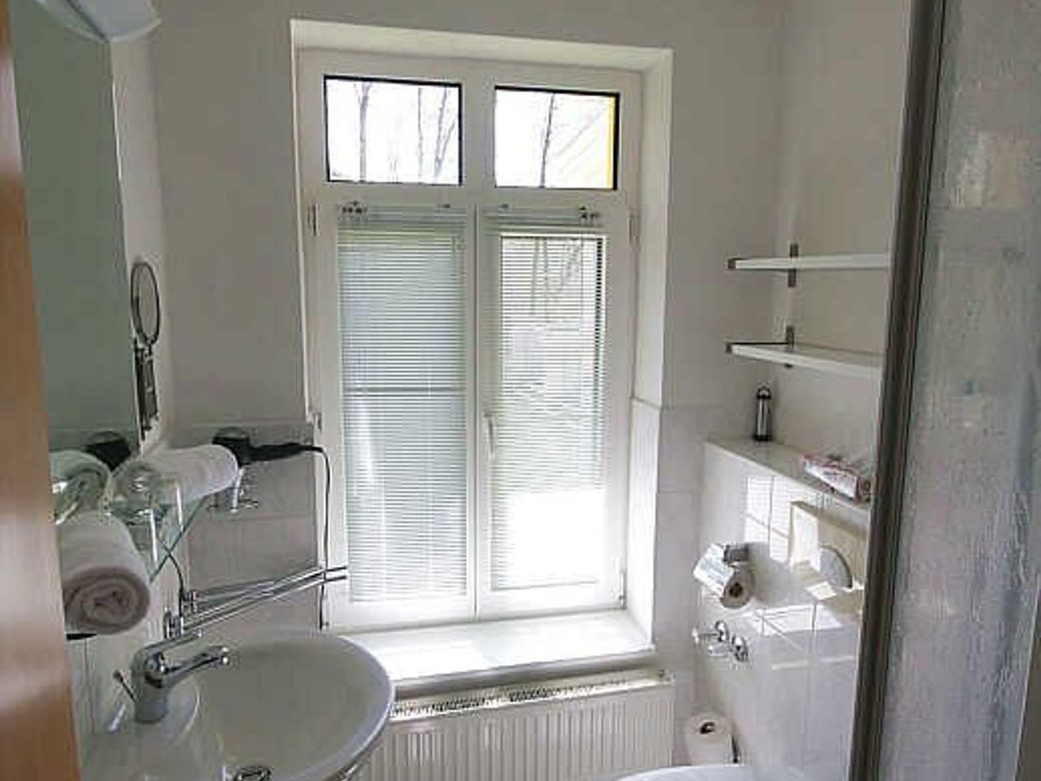 Im Bad mit Vorflur findet der Gast neben Dusche, WC ,Waschbecken und Fön großzügig bemessene Ablageflächen.