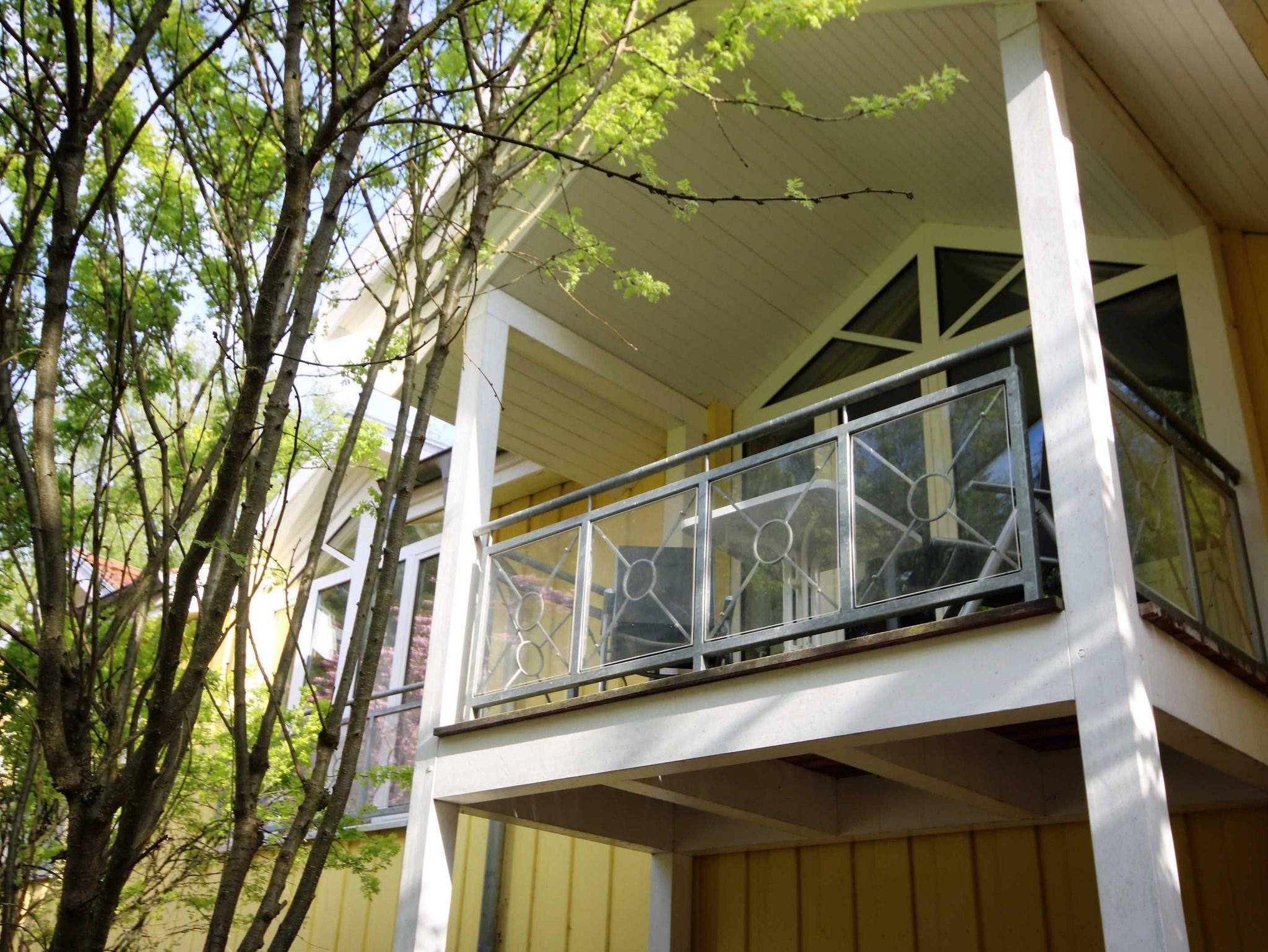 Der nach Norden ausgerichtete, überdachte Balkon mit Blick auf den Kiefernwald ist mit,Relaxstühlen und einem Tisch ausgestattet.