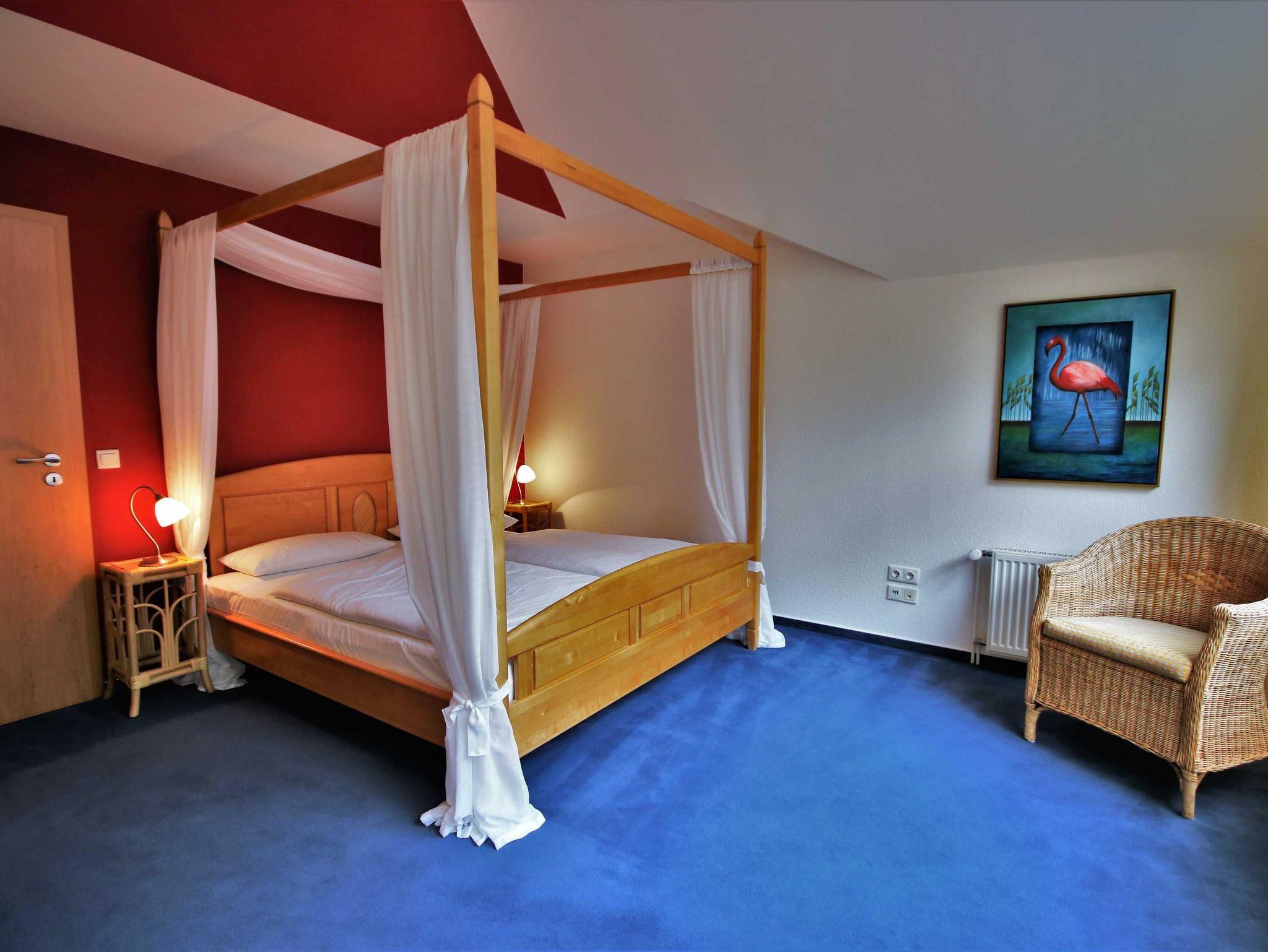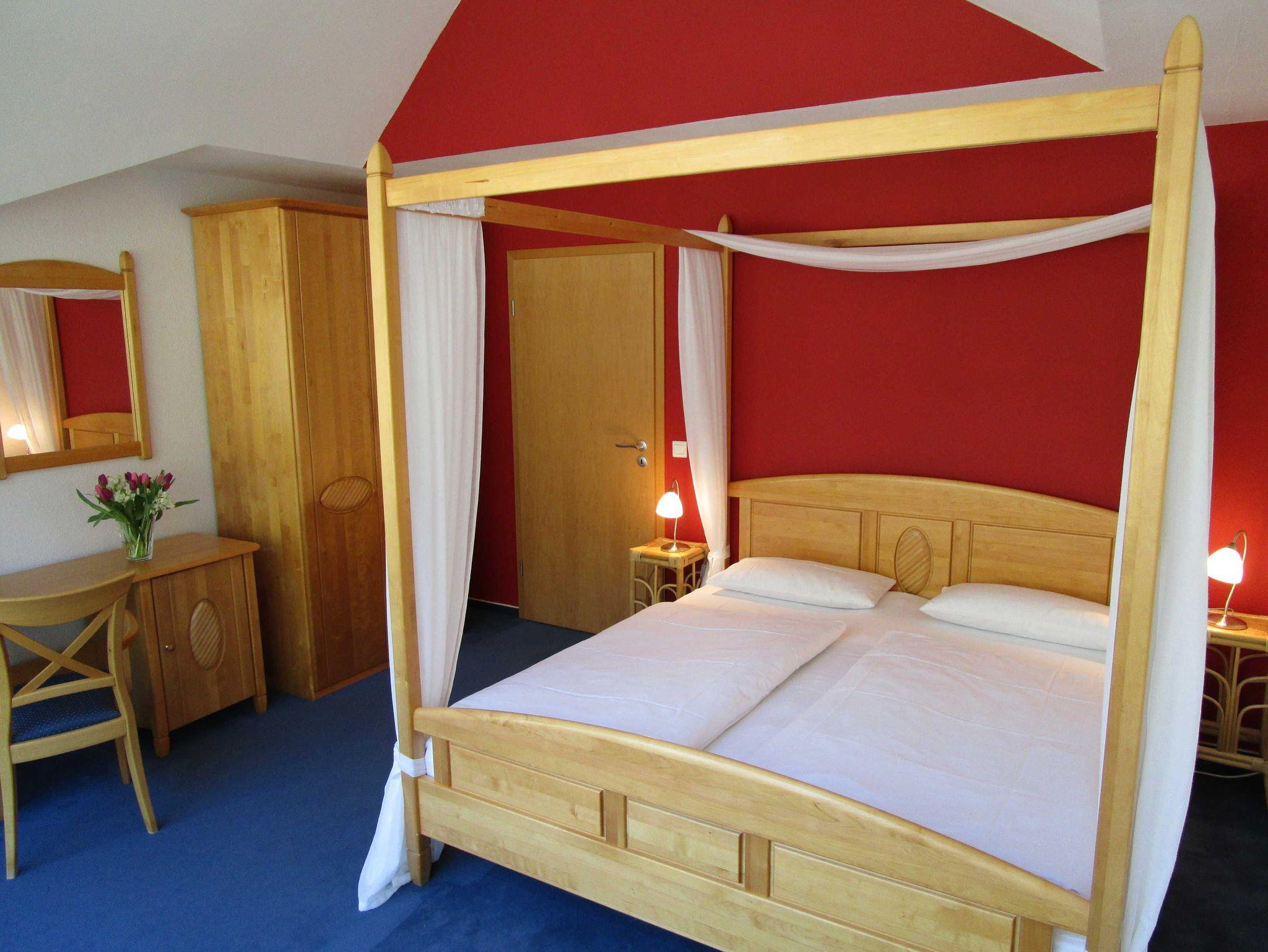 Die 55 m² große Nichtraucher- Ferienwohnung 4 mit eigenem PKW- Stellplatz befindet sich im ersten Obergeschoss des Haupthauses zur angenehm kühleren Waldseite und verfügt über einen großzügigen Wohnraum mit einer gemütlichen Sofaecke mit TV, Radio und DVD und einem überdachten Balkon, auf dem Sie die Nachmittagssonne genießen und selbst bei leichtem Regen geschützt an der frischen Luft sitzen können. Die hellen, frisch und modern eingerichteten Räume strahlen Wärme und Behaglichkeit aus. Das große Schlafzimmer mit einem Himmelbett bietet einen herrlichen Panoramablick auf imposante Kiefern. Das Bad mit Dusche und WC verfügt über reichlich Ablageflächen.